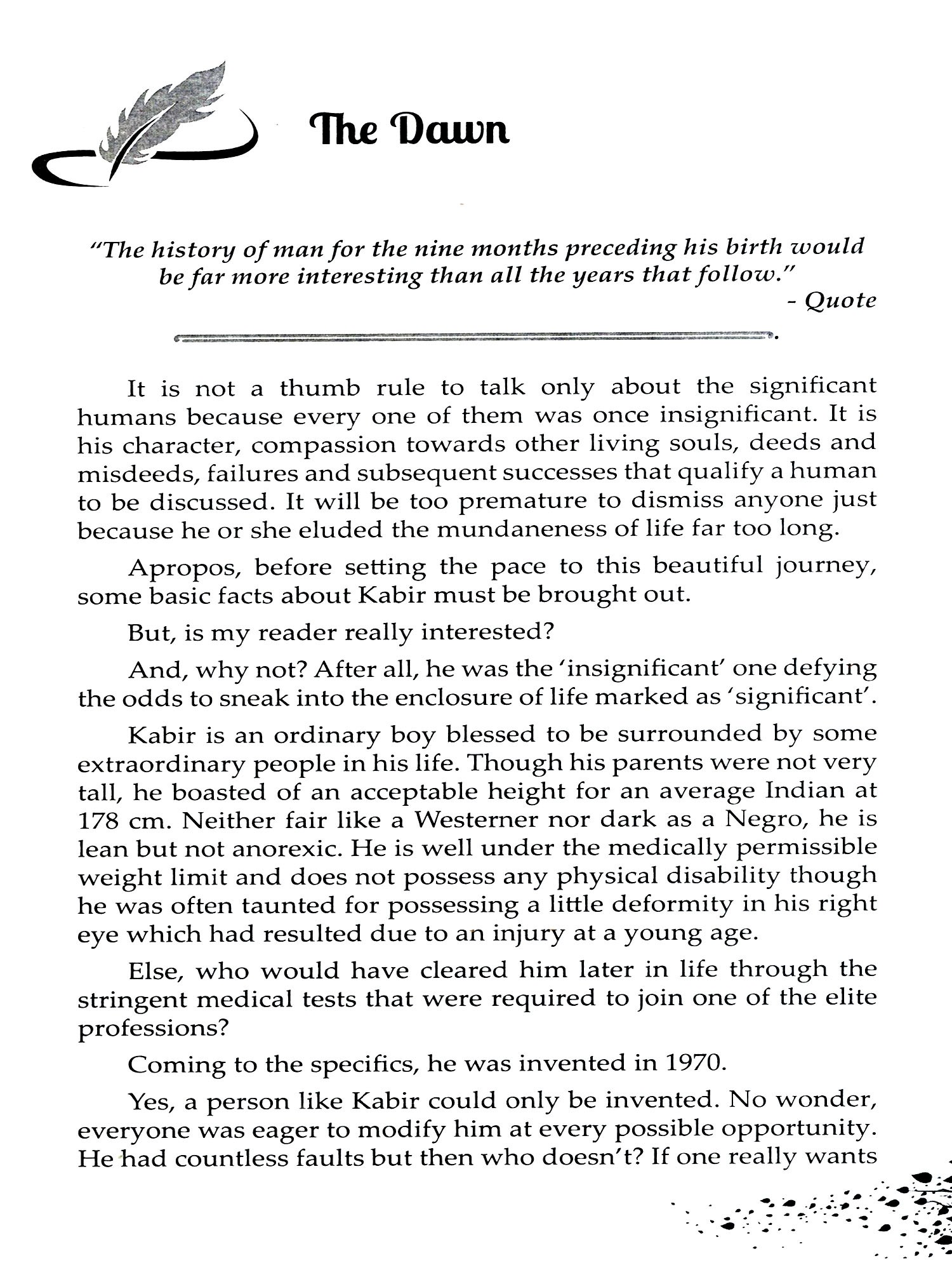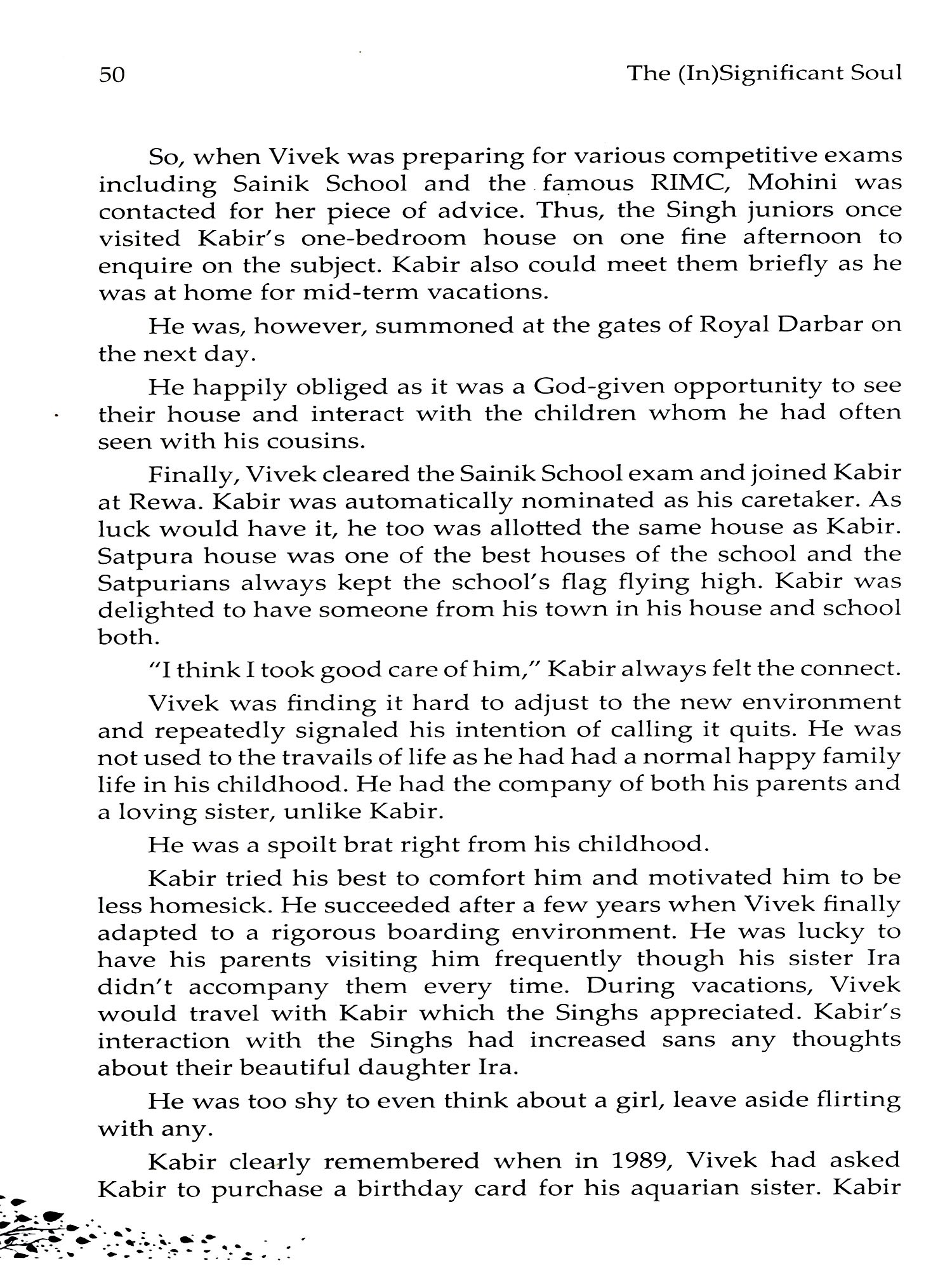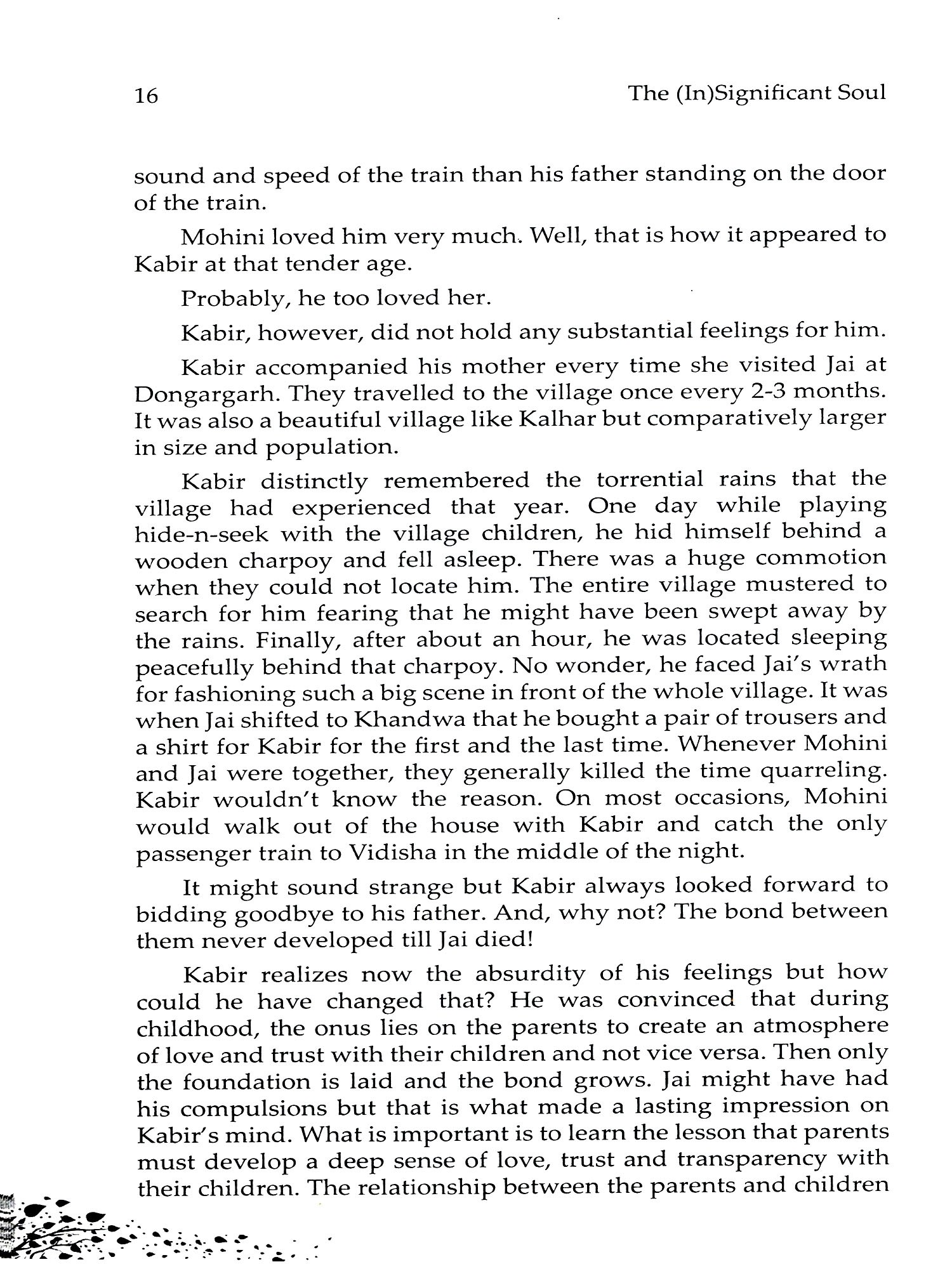 The (In)Significant Soul is a coming-of-age piece that reflects the dauntless spirit of Kabir, the hero of the book. This ordinary boy with an extraordinary spirit dares the reader to live his trials, grapple with his insecurities and take his disappointments with an unearthly calm.