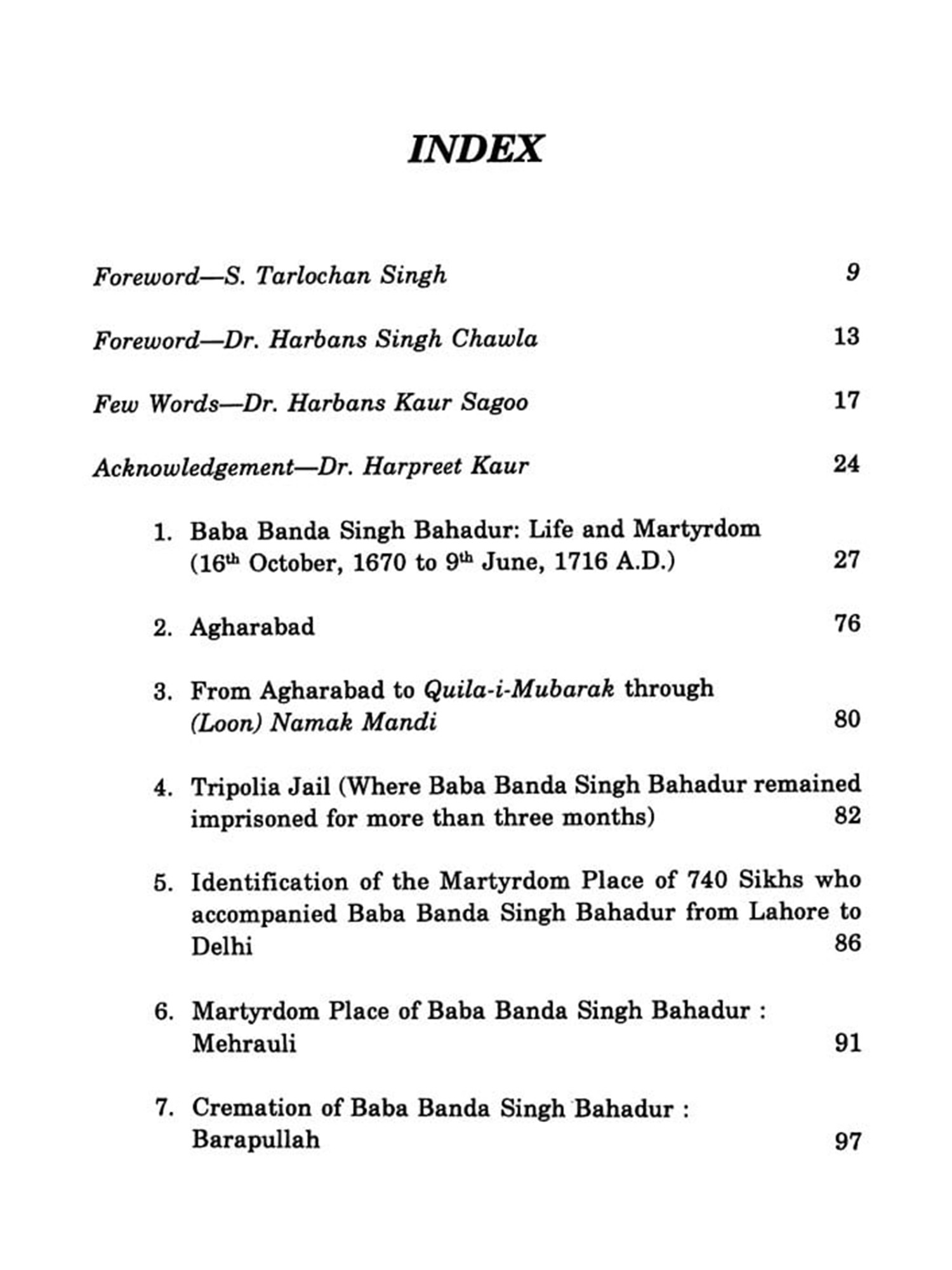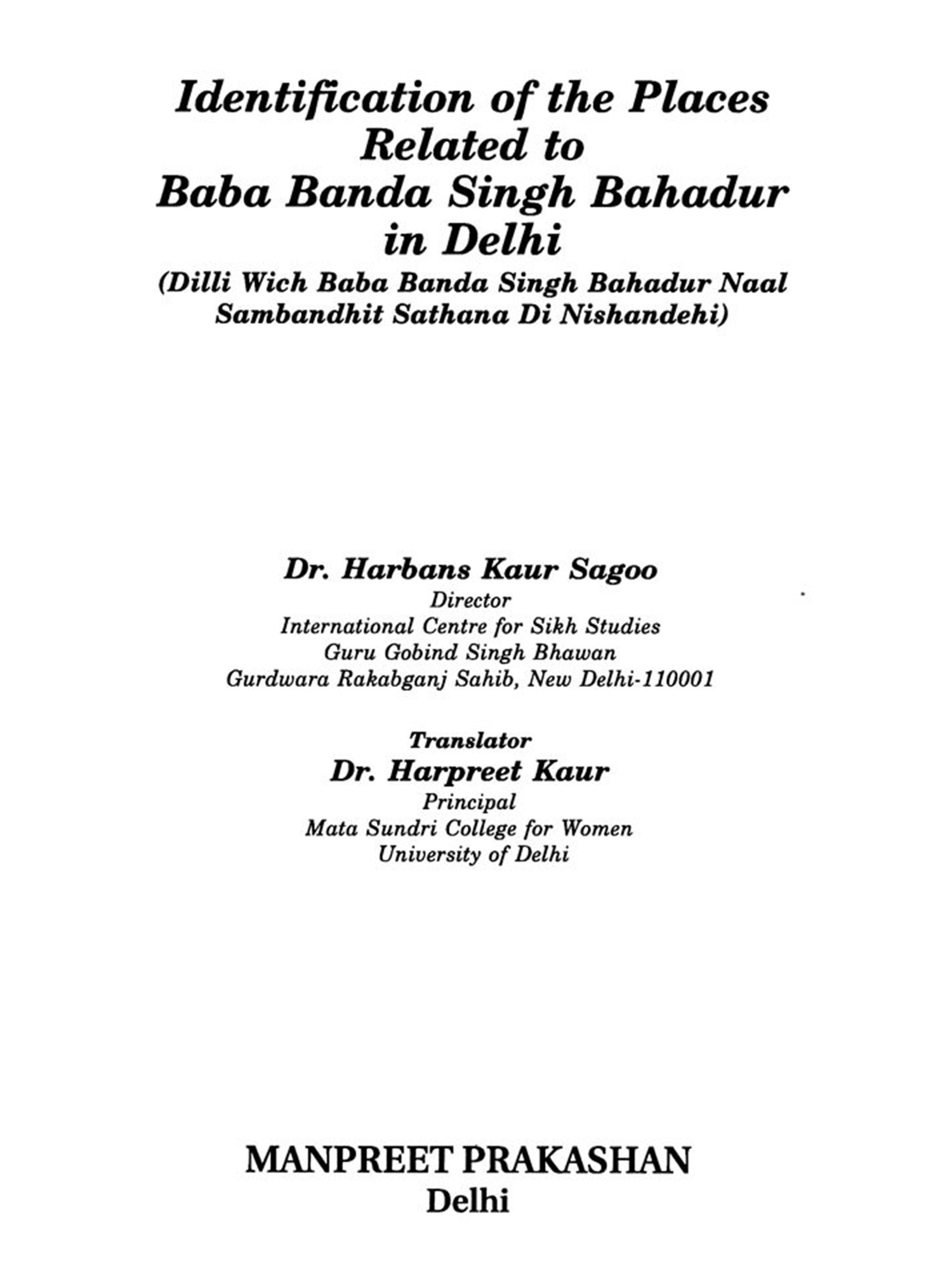 This translated book infact, is a humble tribute to the great Leader of the Sikh community, Baba Banda Singh Bahadur whose contribution to our rich tradition of history and heritage has been immense and unforgettable. The aim of the English translation of the book by Dr. Harbans Kaur Sagoo namely, Dilli Wich Baba Banda Singh Bahadur Naal Sambandhit Sathana Di Nishandehi is to cater to the larger readers. At the very outset, I thank Dr. Sagoo from the depth of my heart. I am indebted to her constant support and encouragement. Infact, when Dr. Sagoo was doing her fieldwork, my curiosity also prompted me to accompany her on a few visits. It was quite challenging but extremely rewarding to visit, identify and locate the places related to the life of Baba Banda Singh Bahadur in Delhi. Since that time, the whole project of locating the places related to Baba Banda Singh Bahadur in Delhi fascinated me and this endeavour of translating the book that is result of persuasive fieldwork has given me immense satisfaction.