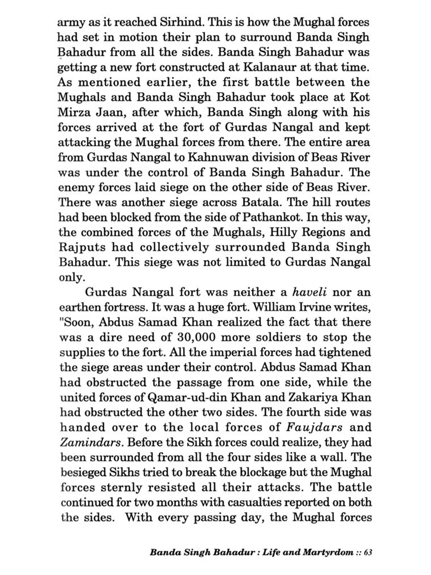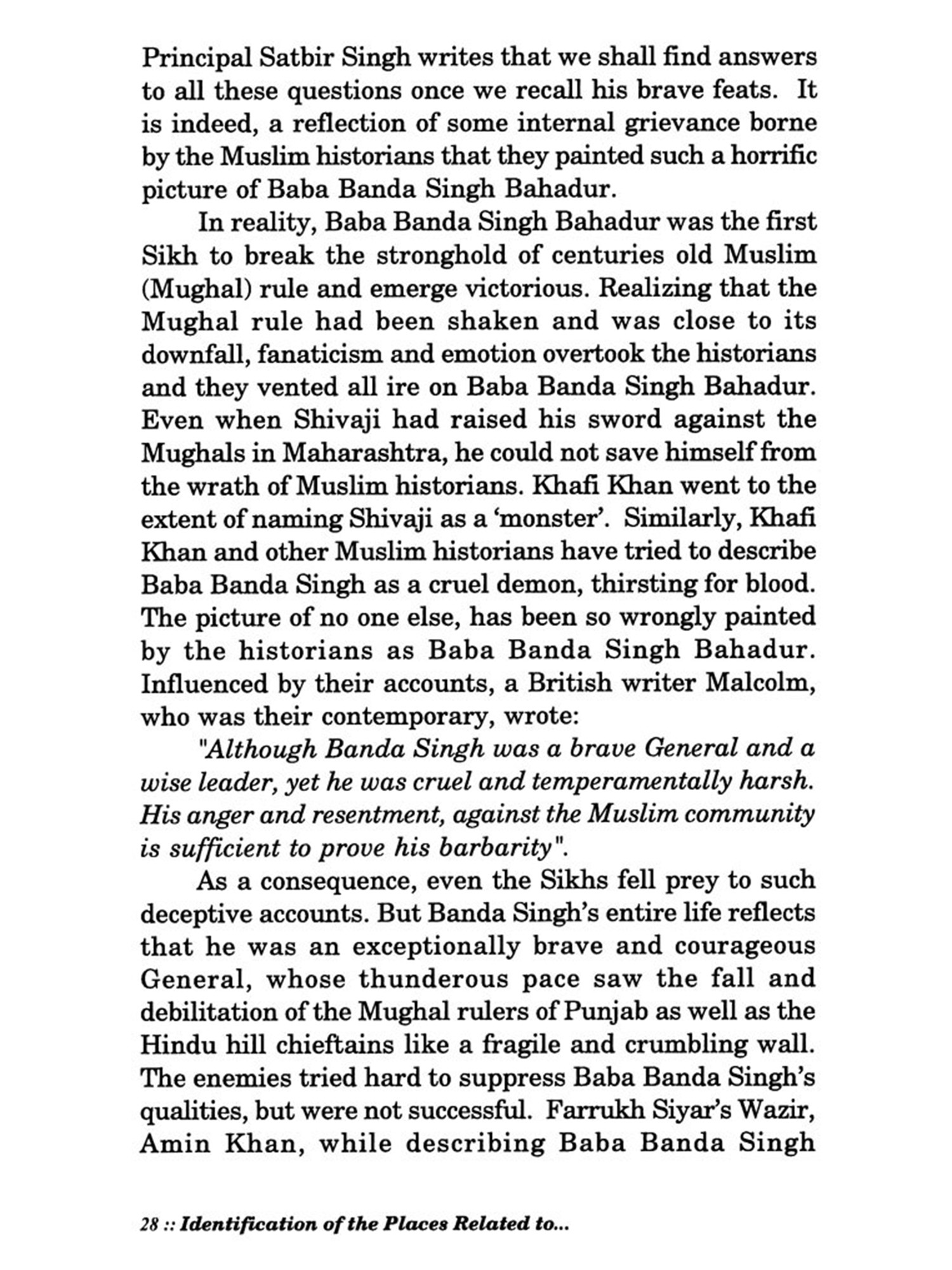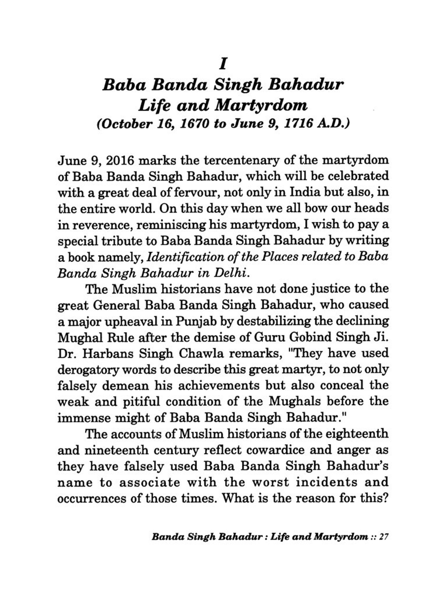 Banda Singh was one of the most unforgettable characters in the medieval history whose role has not yet been put in the right perspective before the readers. He was neither a 'Guru' nor a sectarian pigmy as some scholars had tried to paint him to be. Rather, he assumed the leadership of the Sikhs in their fight against the tyrannical Mughal officers of the subas of Delhi and Lahore after the assassination of Guru Gobind Singh. At the behest of the Tenth Guru as Commander of the Khalsa and he lived and died for it. It is most unfortunate that the man who was founder of the first Sikh Sovereign State by defeating the Mughal army was disowned by a section of the Sikhs themselves. By reading history one finds instances where there was an all out propaganda against Banda Bahadur which I feel is one of the causes of not getting aid from the people when he was surrounded in Gurdas Nangal. The Indian nation should have been grateful to him and he should have been a shinning hero among the youth of India and every textbook should have carried his profile. I, as member of the Parliament in my speech mentioned that he was the first victor who defeated the Mughal army in the year 1710 when India had been under the Muslim rule for more than 600 years. I am sorry to record that the elected members as well as the general public are not aware about the role of Baba Banda Singh Bahadur.