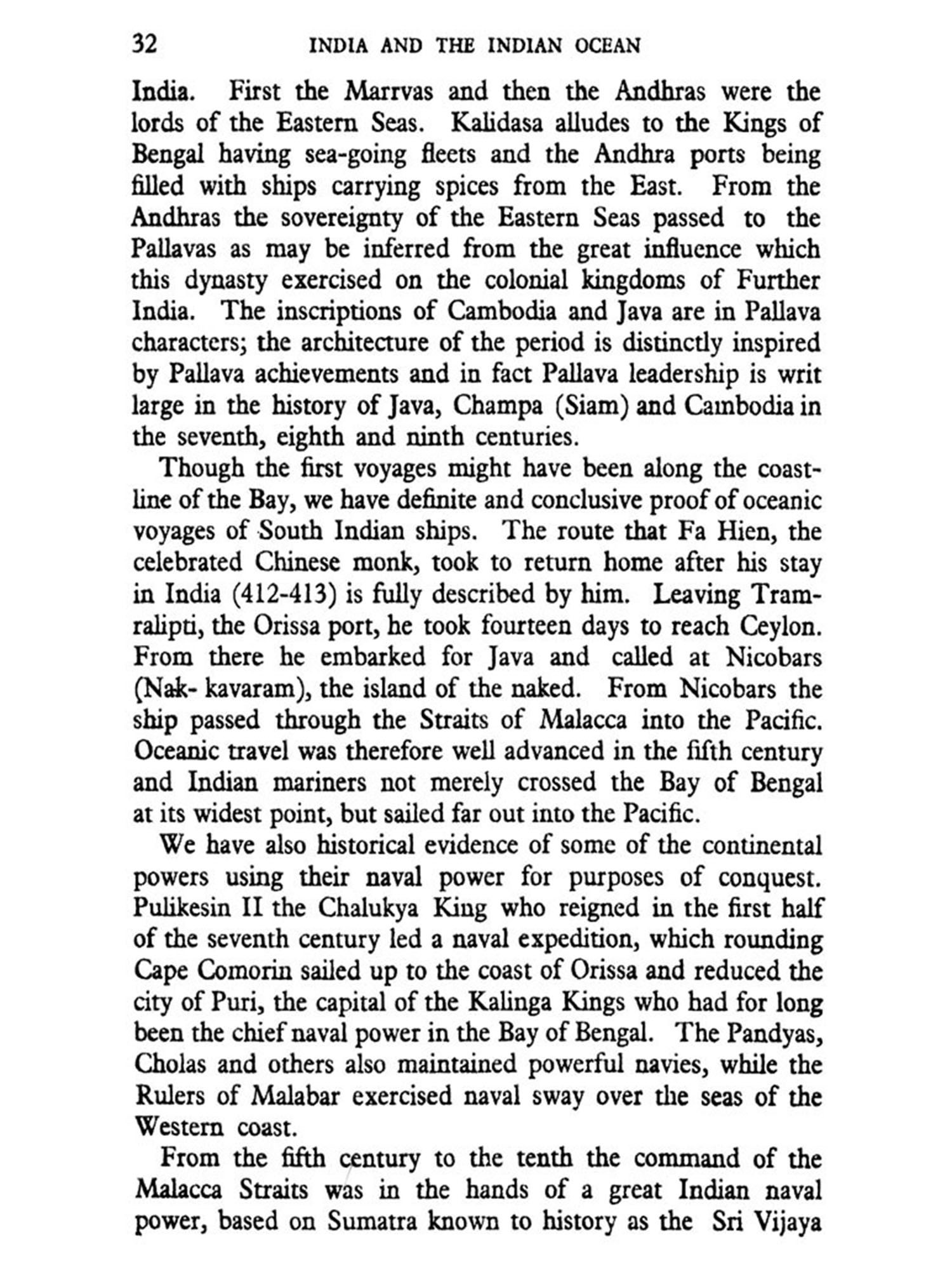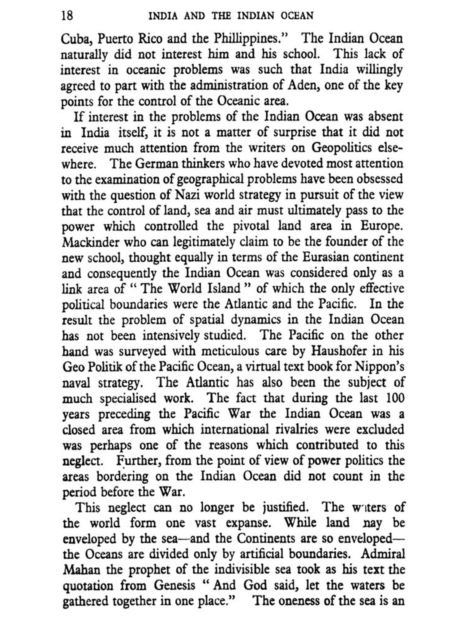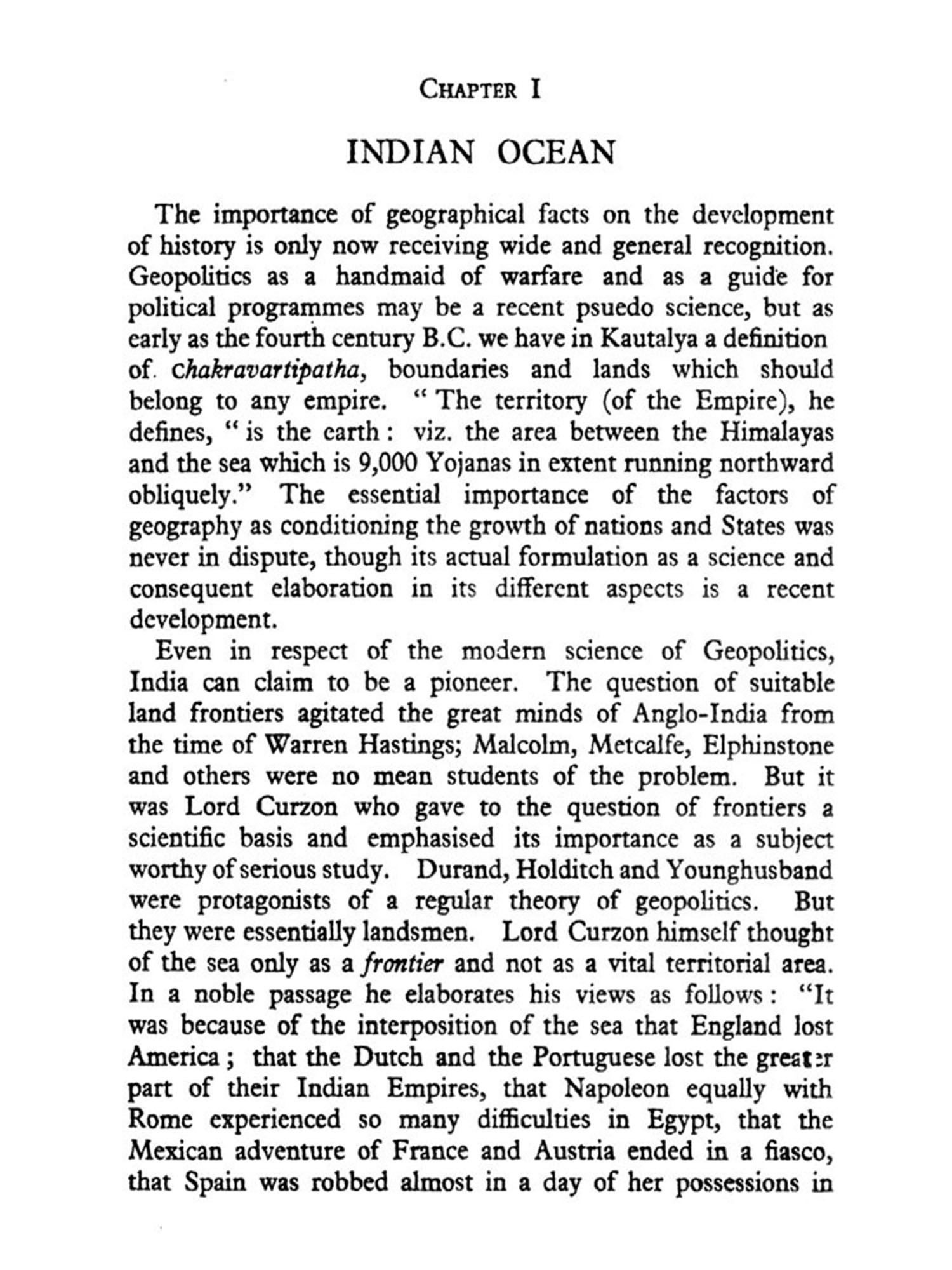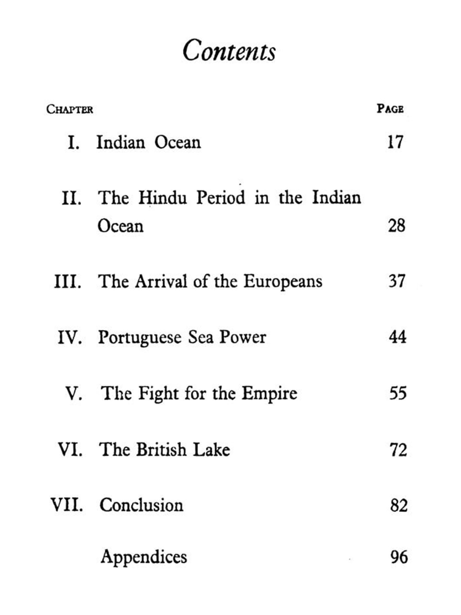 In the following pages an attempt is made to trace the influence of the Indian Ocean on the shaping of Indian history and to discuss the vital importance of oceanic control to the future of India. There has been an unfortunate tendency to overlook the sea in the discussion of India's defence problems Until now, the discussion has proceeded on the assumption that the security of India is a matter exclusively of the North-West Frontier and of a strong enough army to resist any aggression across the Hindu Kush. This is an entirely one-sided view of Indian history. No doubt most of the invasions of India have come from that side; and others may come from that quarter in the future also. The North-West Frontier and perhaps the North-East Frontier also will therefore remain important strategic areas for the defence of India. But an examination of the factors of Indian defence will show that ever since the sixteenth century from which time the Indian Ocean became the scene of a struggle for the control of the sea, the future of India has been determined not on the land frontiers, but on the oceanic expanse which washes the three.