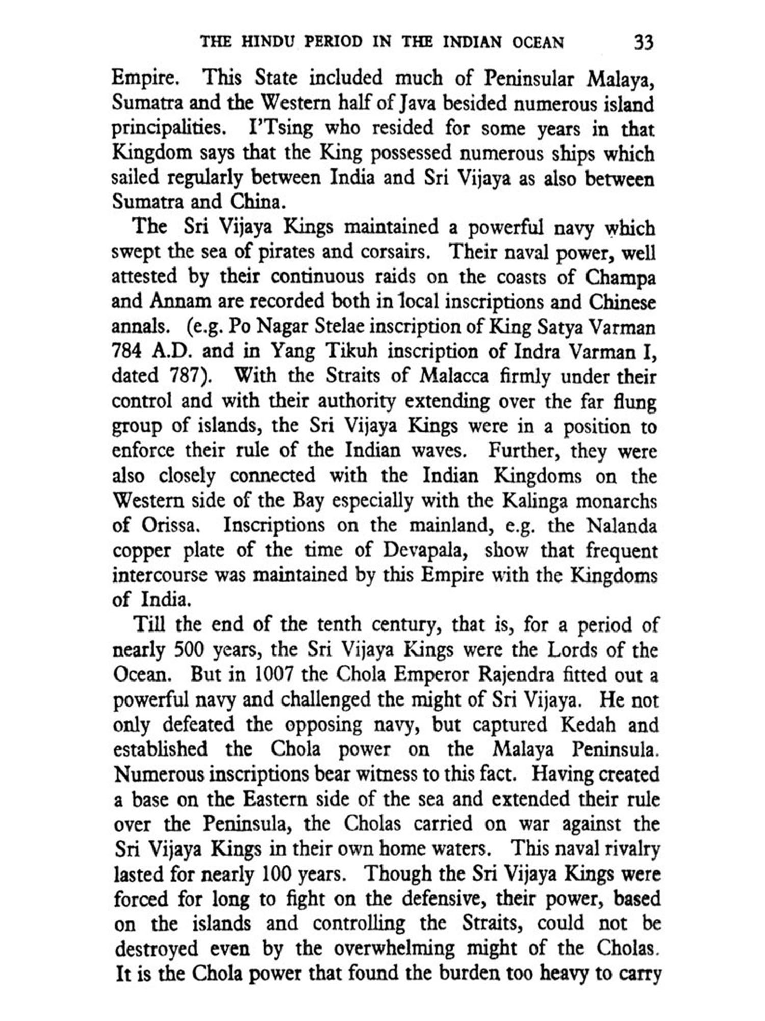 sides of India. It is true that till the beginning of the sixteenth century Oceanic problems had not intruded themselves on the history of the mainland. The reasons for this are obvious. In the first place, the control of the Indian waters was in Indian hands till the middle of the thirteenth century, and no power strong enough to challenge Indian control appeared on the ocean. The Arabs who succeeded to the supremacy of the sea, after the breakdown of Chola naval power were only commercial navigators and were not the instruments of any national policy, nor had they the support of any organised govern-ment. In short till the arrival of the Portuguese at Calicut, no naval potoer had appeared on Indian waters.
