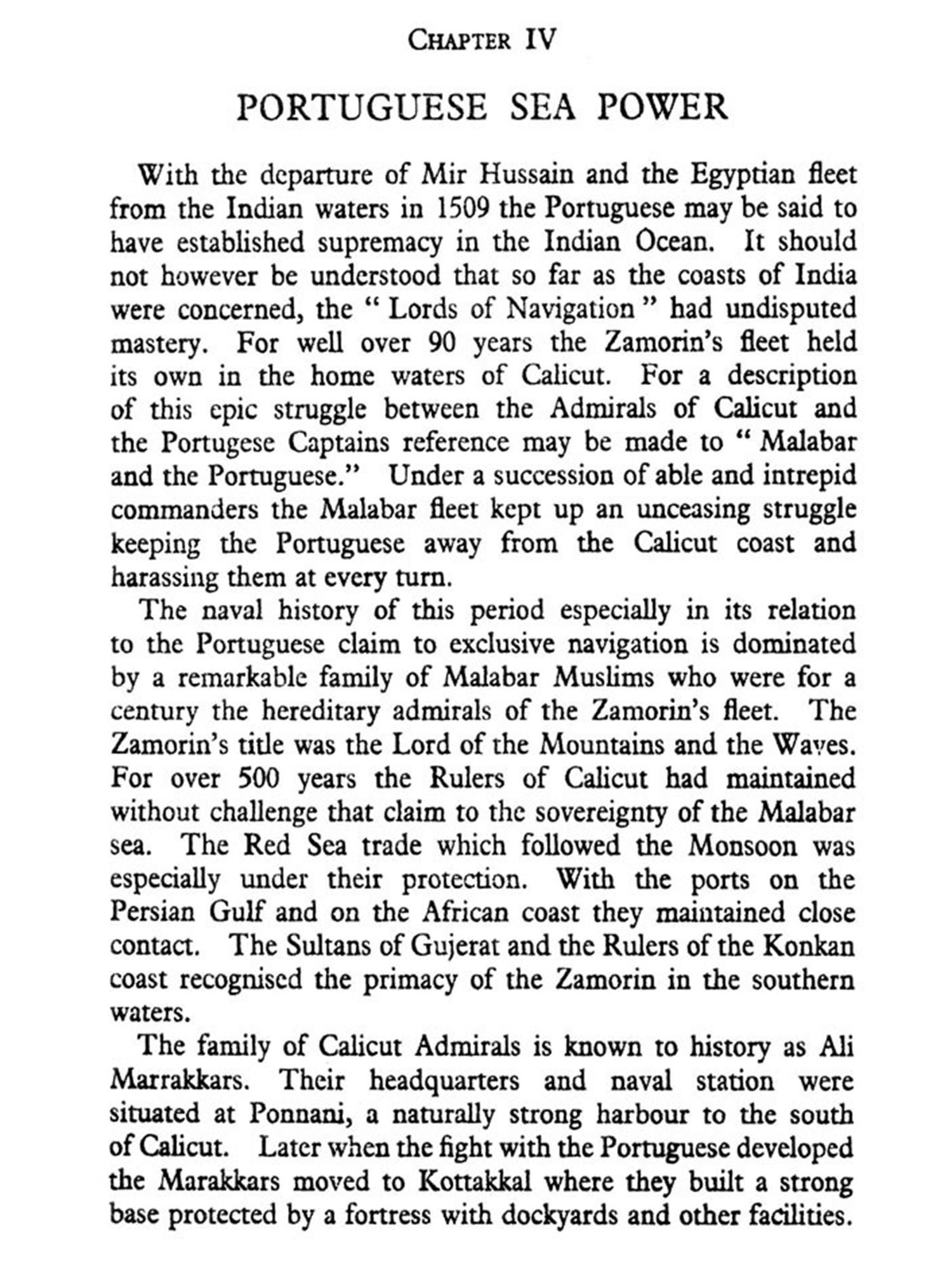 What Vasco da Gama and his successors introduced into Indian history was the claim to an exclusive control of the seas, a conception wholly at variance with what had been accepted as the "natural law" both in Europe and in Asia. The might of Portugal was organised in order to enforce such a claim, and Alfonso Albuquerque by conquering Socotra, Ormuz and Malacca and by organising an impregnable territorial base in India established effectively that supremacy of the sea which his master claimed on the basis of the Bull of Pope Calixtus III. From that time till today the Ocean has dominated India. The unique glory of the Moghuls could not hide the fact that on the sea they were totally helpless, and Akbar himself had to suffer the humiliation of the trade of the Empire being interrupted and the pilgrim traffic to Месса harassed by the Portuguese on his coast. The Moghuls with their Central Asian tradition had no recognition of the importance of the sea. It is only when the Sidis of Janjira offered their services against the growing Maratha power on the sea that Aurangazib gave his half-hearted recognition to a fleet being organised on a reasonable scale. On the whole, the Moghul view of the sea was that of Kalif Omar who when he was told by his General, at the time of the conquest of Egypt, that "the sea was a huge beast which silly folk ride like worms on logs" ordered that no Mussalman should risk his life on such an unruly element without his express orders. The result was that during the 200 years of Moghul greatness, not only was the Indian sea entirely under alien control but simultaneously with the development of Moghul power, the foundation was being laid by others for a more complete subjection of India, than any land power at any time could have conceived.