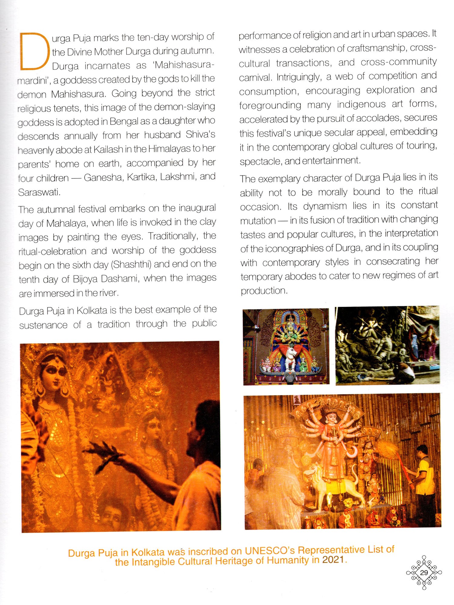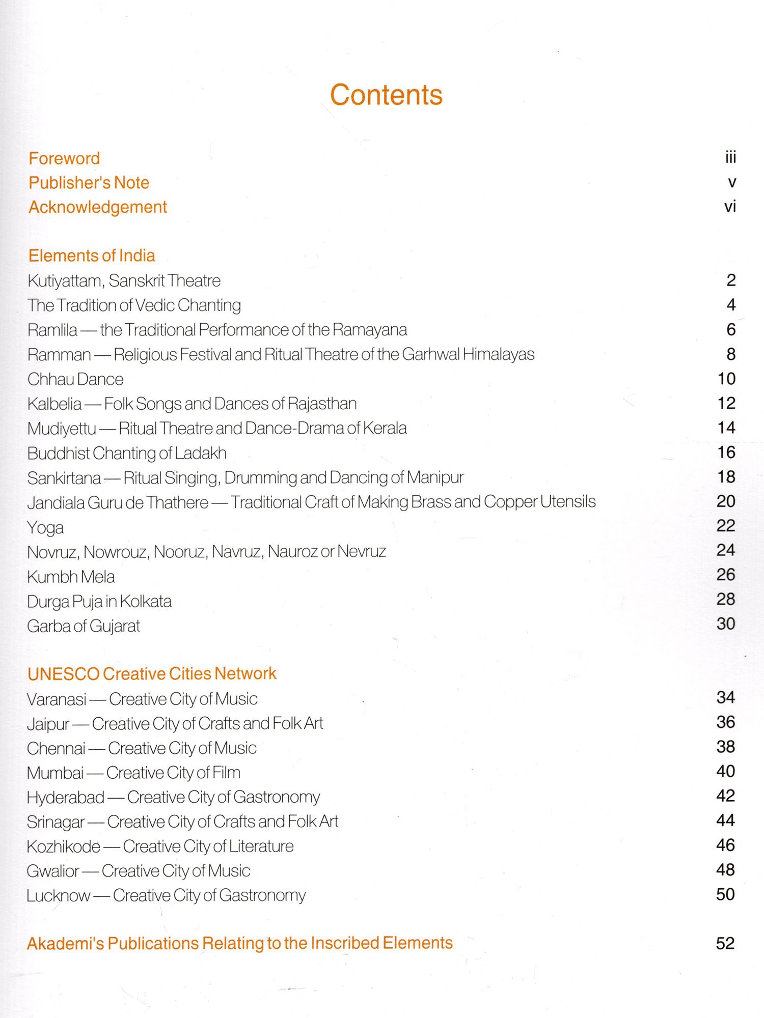 Each inscribed element, whether Yoga, Ramman, Durga Pua in Kolkata, or Garba, cames within it the imprint of generations of practitioners. Their steadfast dedication, often nurtured in quiet comers of our villages and towns, is what enables these traditions to shine on the global stage. This publication rightfully honours these torchbearers of heritage, for they are the living vessels of India's cultural resilience.
