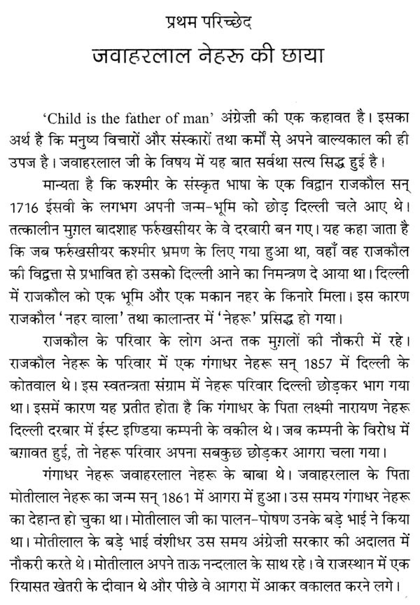 श्री जवाहरलाल नेहरू एक महान् व्यक्ति थे। बलवान आत्मा और सुदृढ़ शरीर-ऐसा प्रतीत होता है कि आप में पूर्वजन्म की कोई अति पुण्यात्मा विद्यमान थी। मुख में चांदी का चम्मच लिये पैदा हुए; कही जाने वाली श्रेष्ठतम शिक्षा प्राप्त करने का अवसर आपको मिला; भारत के एक सम्मानित परिवार में जन्म हुआ और फिर जन-जन की श्रद्धा तथा भक्ति मिली और एक विशाल देश का राजसिंहासन मिला।