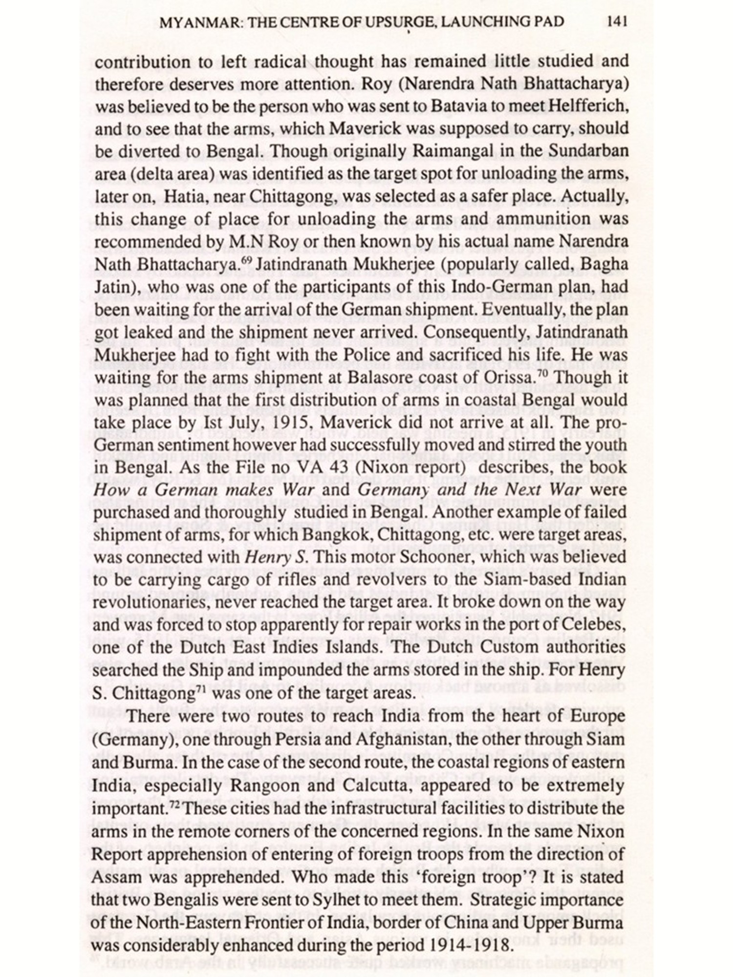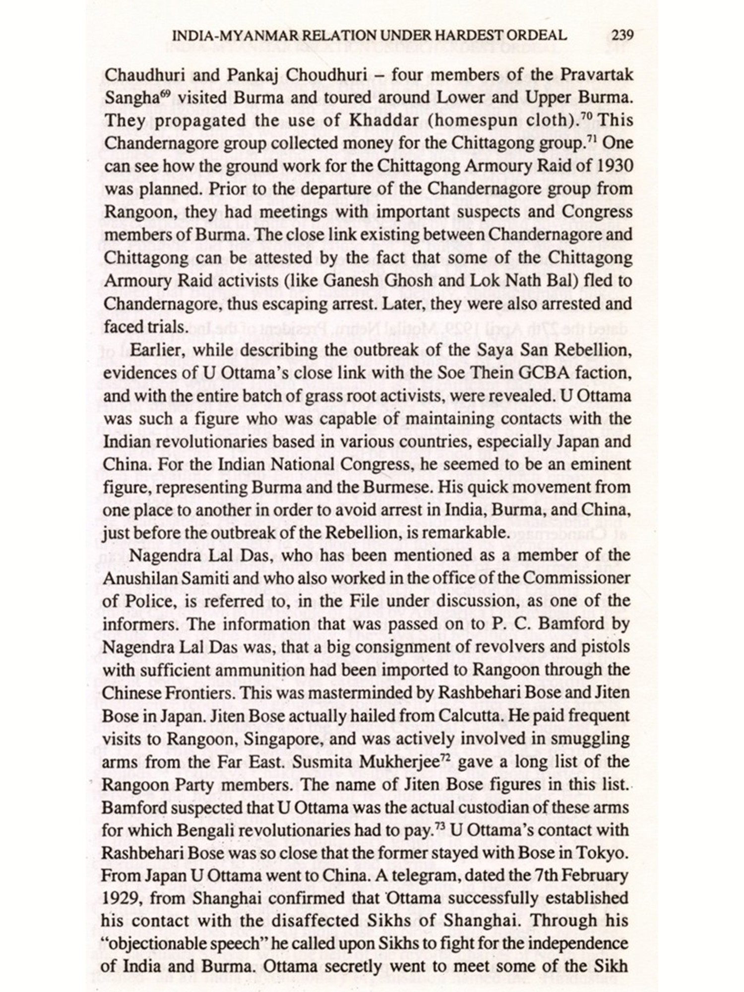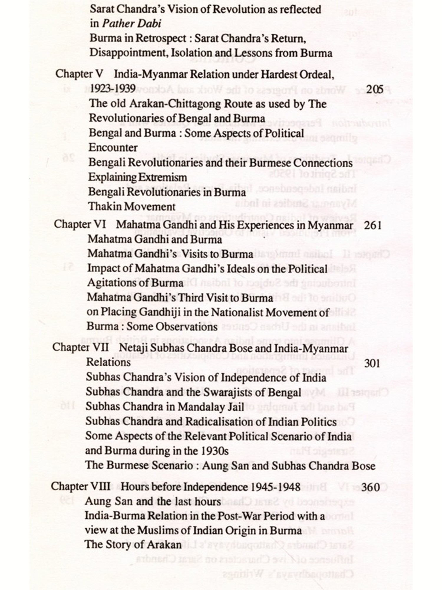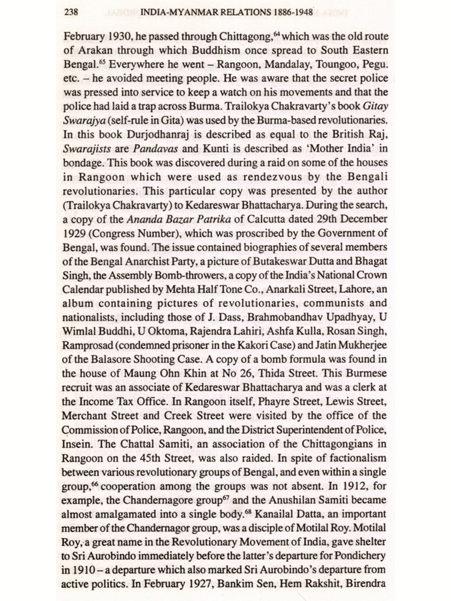 To explain the methodology that I propose to follow, a few comments appear to me as essential. The Indian concept of Dharma constitutes the subject of the sacred book of the Hindus, the Bhagavadgita. This book inspired Mahatma Gandhi, who throughout his life continued his crusade against violence. Interestingly, the same Gita also supplied the necessary inspiration to those nationalists who ignoring the fear of all that was awaiting (death, life imprisonment, etc) went into direct armed confrontation with the British. They were the Ghadr, Anushilan and Jugantar activists. The Burmese way, as it always had been, was to get the maximum benefit from all quarters. Therefore, both, the non-violent Gandhian path, as well as the violent confrontational paths, were tried. This simultaneous engagement with two opposite schools of Indian nationalism was possible because, as for the Indians, so for the Burmese also, salvation (Nirvana) became the supreme aim of life. The concept of Dharma is much wider than the concept of religion as understood by the western people. The Hindus live to achieve Chaturvaraga, the four aims: Dharma (whatever holds and whatever is righteous). Artha (material gain), kama (sexual fulfilment) and Moksha (salvation). For a Buddhist, the things are not different, only the ways are. A true Buddhist-Burmese has nothing to lose, but his or her honesty and self-respect. Thus, one observes Vinay rules, performs meritorious acts and follows everything that leads to non-violence. Their ultimate aim is also to achieve salvation (Nirvana) through peaceful means. Like a devoted Hindu, a devoted Buddhist also wants to get rid of the pains of being reborn in the Samsara. However, there can be deviation from the path of non-violence if the situation demands so.