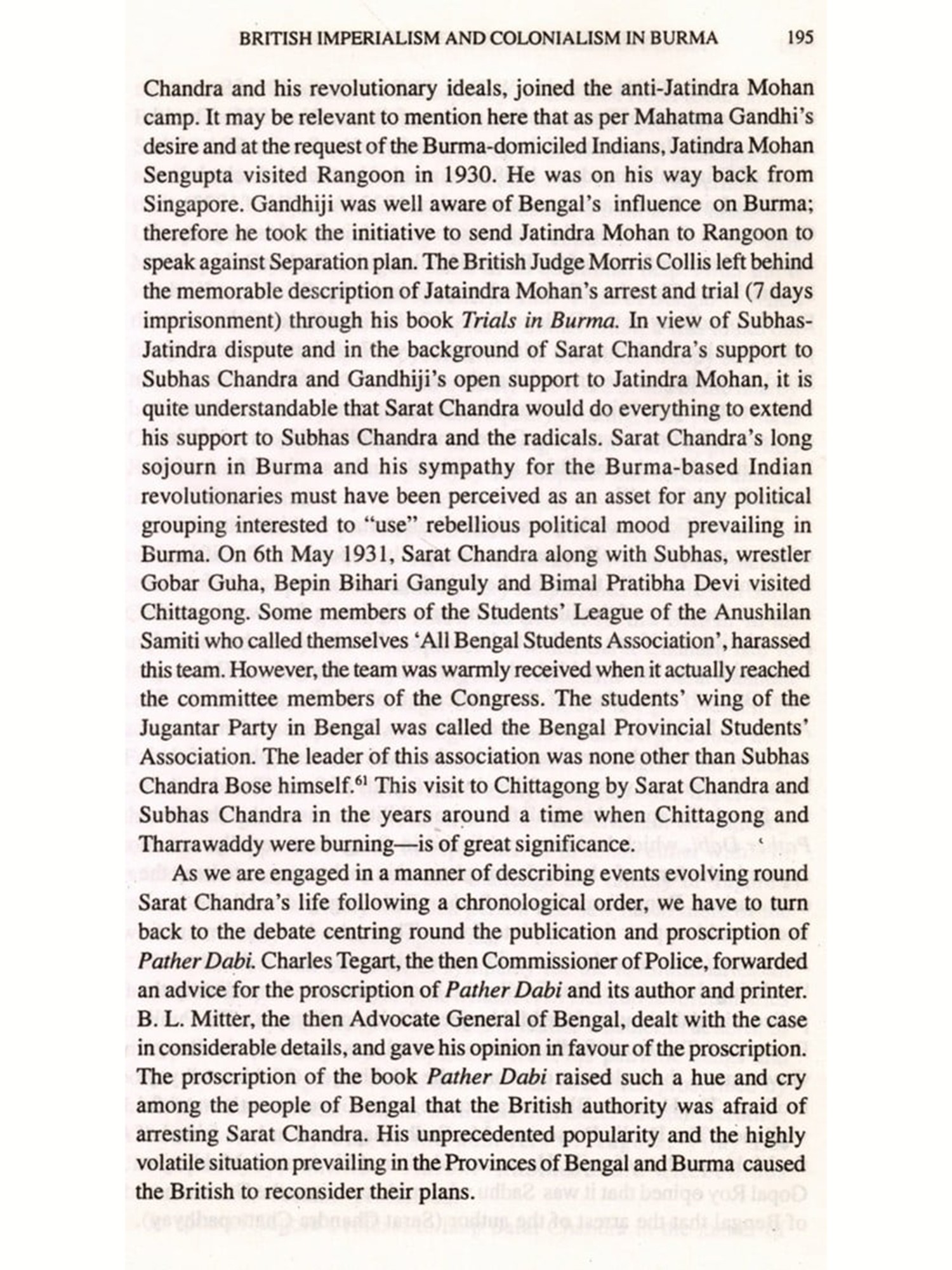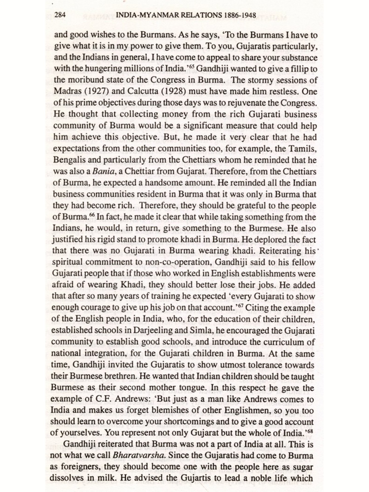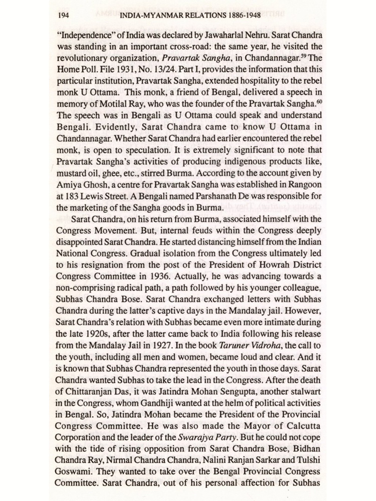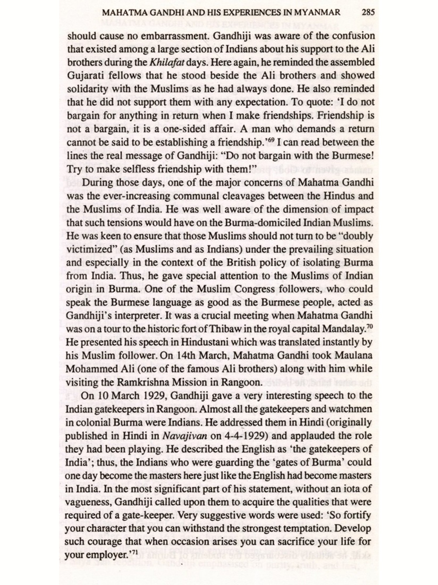 To explain the methodology that I propose to follow, a few comments appear to me as essential. The Indian concept of Dharma constitutes the subject of the sacred book of the Hindus, the Bhagavadgita. This book inspired Mahatma Gandhi, who throughout his life continued his crusade against violence. Interestingly, the same Gita also supplied the necessary inspiration to those nationalists who ignoring the fear of all that was awaiting (death, life imprisonment, etc) went into direct armed confrontation with the British. They were the Ghadr, Anushilan and Jugantar activists. The Burmese way, as it always had been, was to get the maximum benefit from all quarters. Therefore, both, the non-violent Gandhian path, as well as the violent confrontational paths, were tried. This simultaneous engagement with two opposite schools of Indian nationalism was possible because, as for the Indians, so for the Burmese also, salvation (Nirvana) became the supreme aim of life. The concept of Dharma is much wider than the concept of religion as understood by the western people. The Hindus live to achieve Chaturvaraga, the four aims: Dharma (whatever holds and whatever is righteous). Artha (material gain), kama (sexual fulfilment) and Moksha (salvation). For a Buddhist, the things are not different, only the ways are. A true Buddhist-Burmese has nothing to lose, but his or her honesty and self-respect. Thus, one observes Vinay rules, performs meritorious acts and follows everything that leads to non-violence. Their ultimate aim is also to achieve salvation (Nirvana) through peaceful means. Like a devoted Hindu, a devoted Buddhist also wants to get rid of the pains of being reborn in the Samsara. However, there can be deviation from the path of non-violence if the situation demands so.