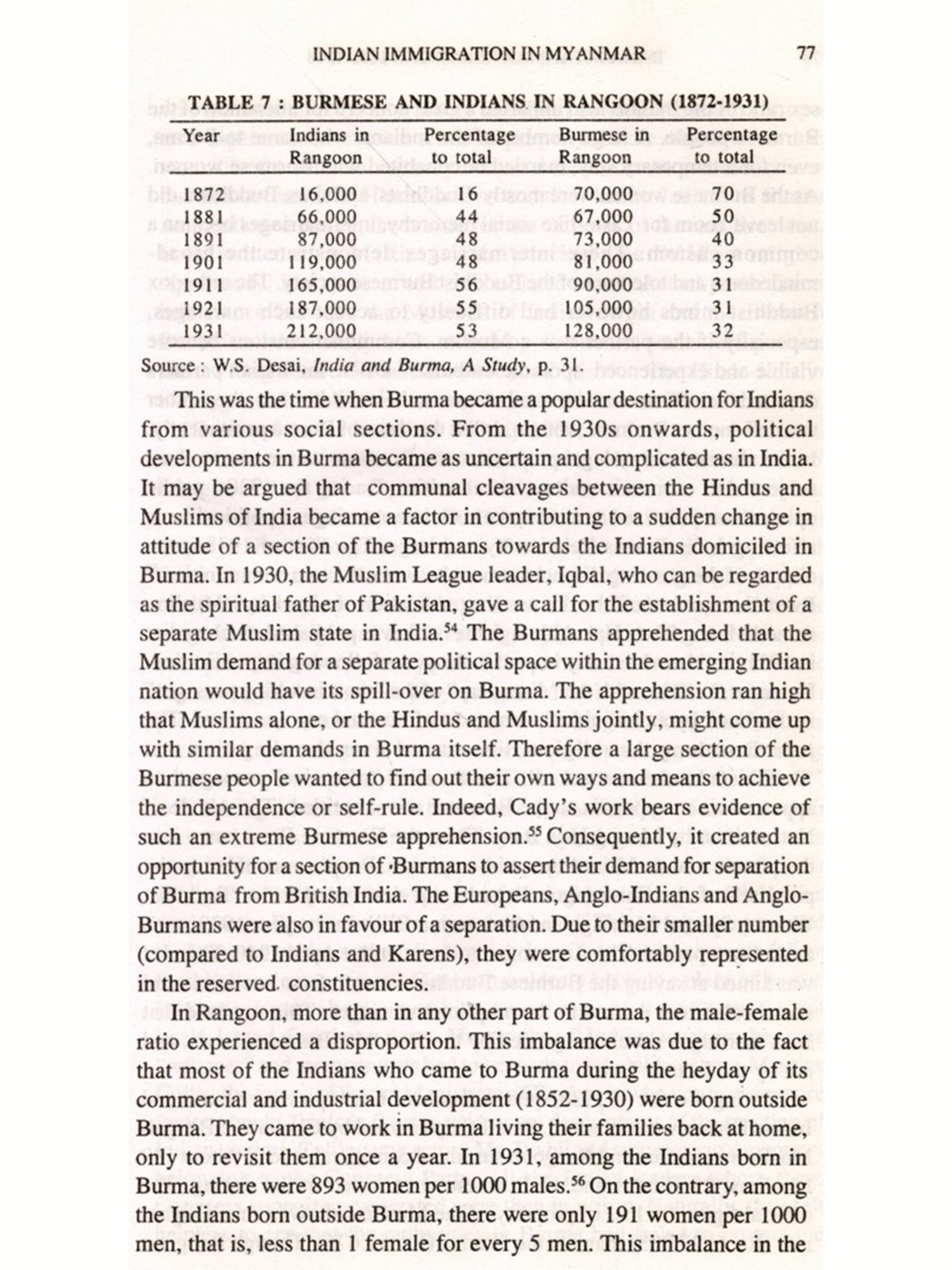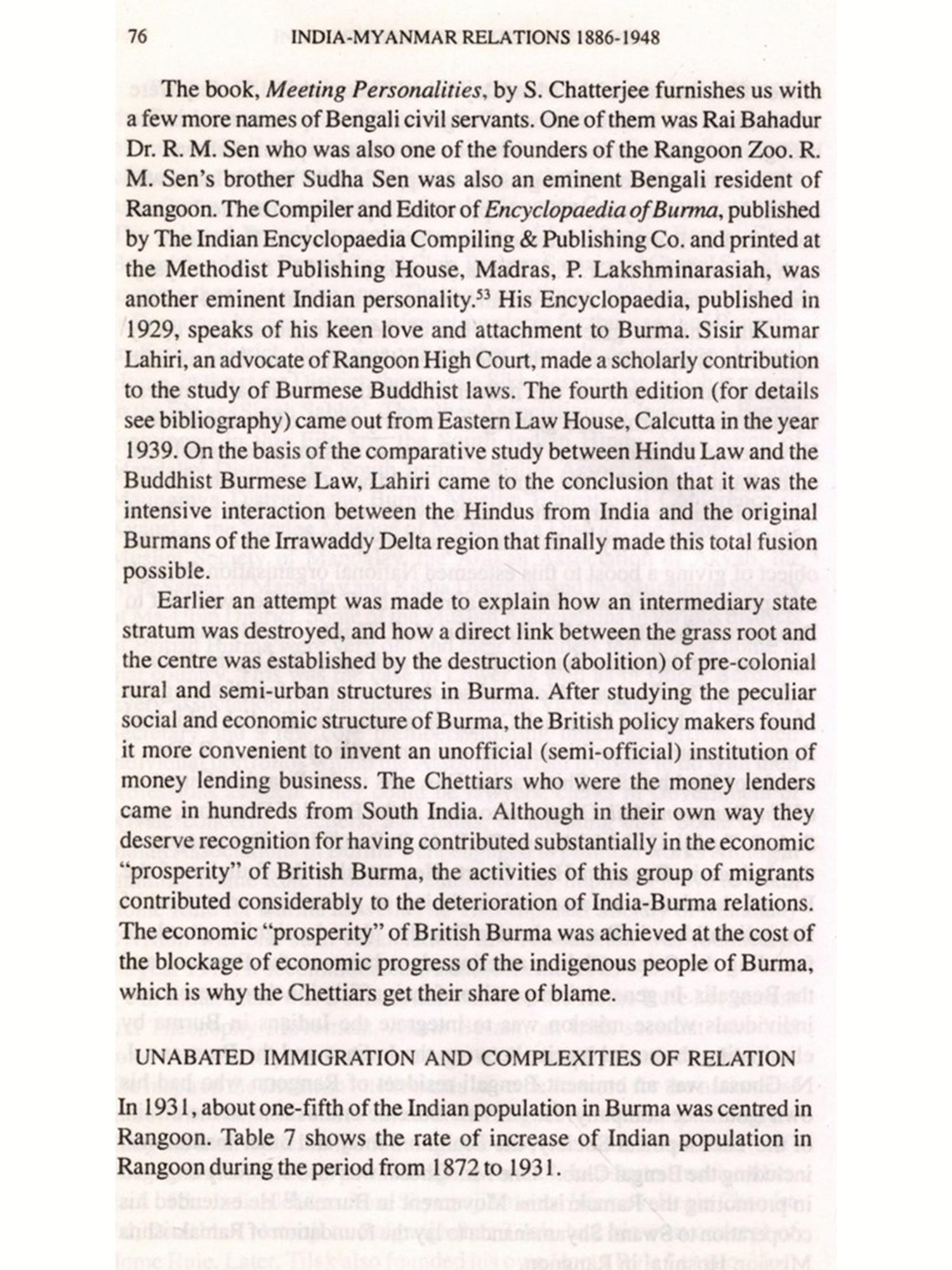 Let me explain these two mutually opposite forces which determined the general course of relation between the two countries. The first one is negative, since it imposed a burden on the people of Burma; the British policy of encouraging and promoting unabated immigration of unskilled and semi-skilled labourers from the coastal provinces of British India to Burma created a barrier between the two natural allies, India and Burma. The second force, people to people relation, was actually positive and sustaining; it overpowered the first one. The platform of commonality which is an essential element of any relation, let alone between two neighbouring countries, was made by the commonality in values. These values which emerged over thousands of years through intensive interactions, became manifest in arts, architecture, literature and scriptures. The chronological limitation of this work restricts me to the events that took place between 1886 and 1948 only. But one cannot do justice to the India-Burma relations in this period unless one properly understands the ethos of the past experiences. The inner strength of the traditional commonality based on common beliefs, customs, institutional pattern, court rituals, and such other matters, was so pervasive that the artificial separation of 1937 (Govt. of India Act) between Burma and India failed to alienate the political leaders of the two countries. Otherwise, how can one justify the collaboration between General Aung San and Netaji Subhas Chandra Bose, and, later, between Aug San and Jawaharlal Nehru, during the years 1940-1948?