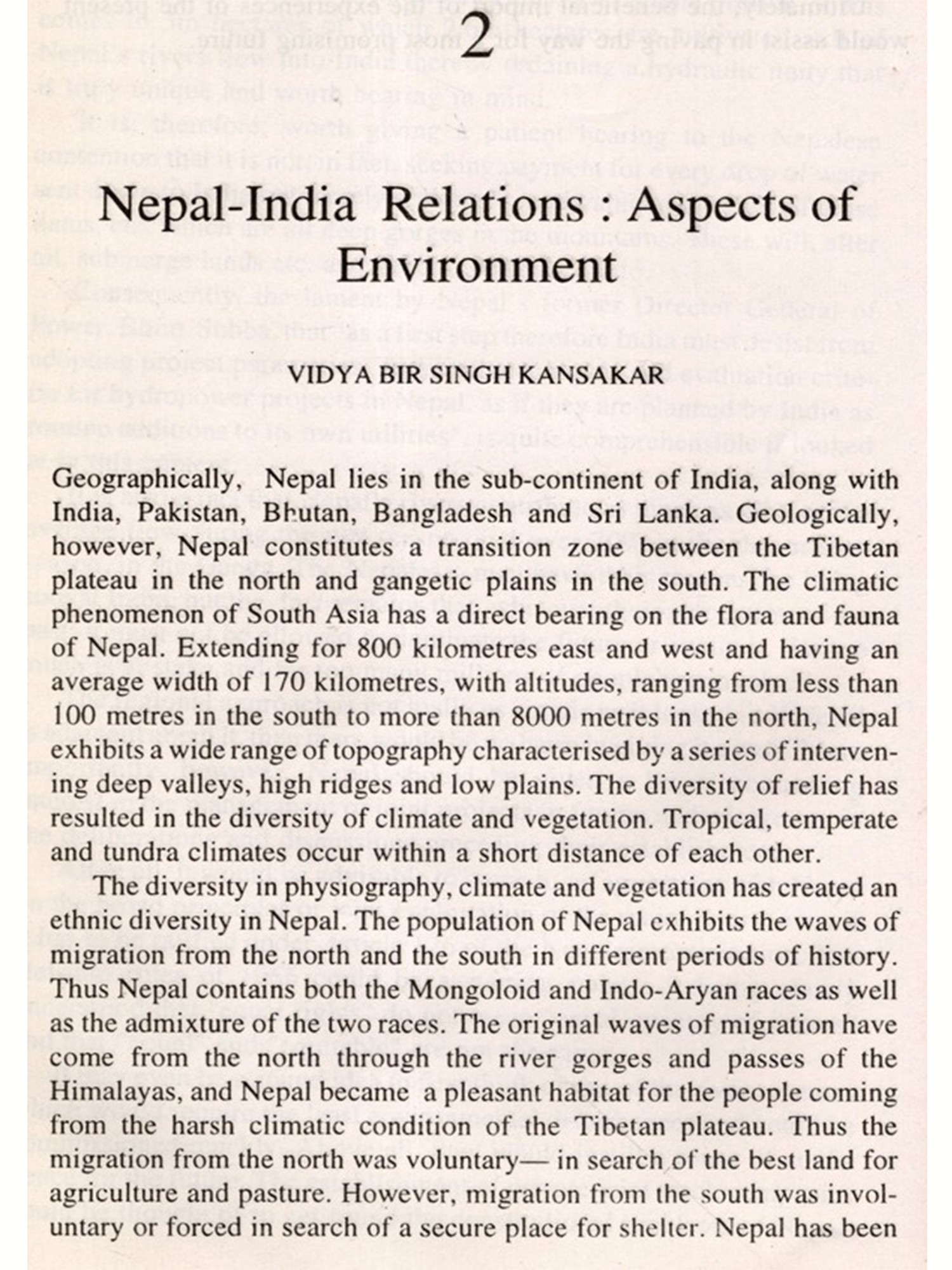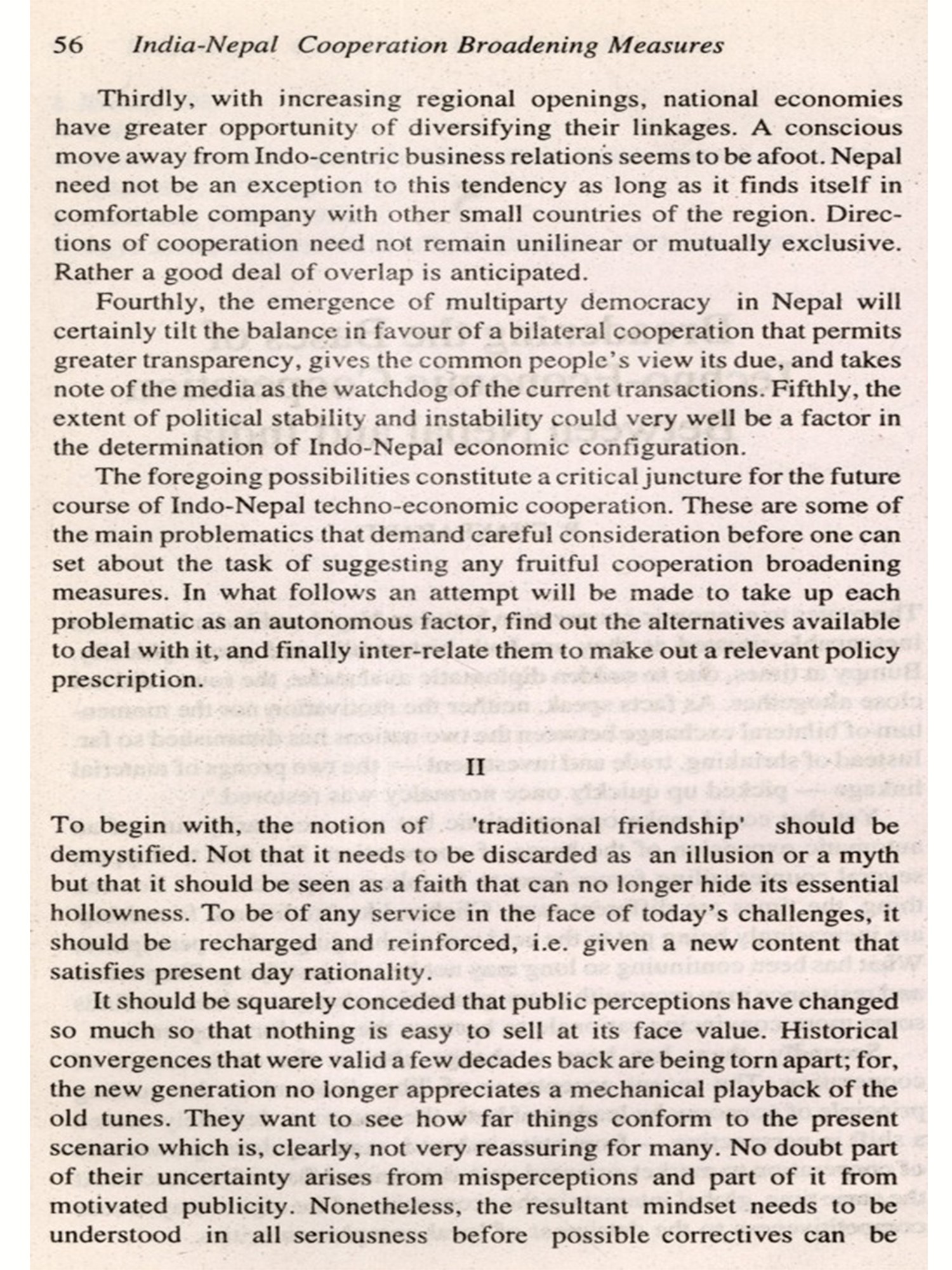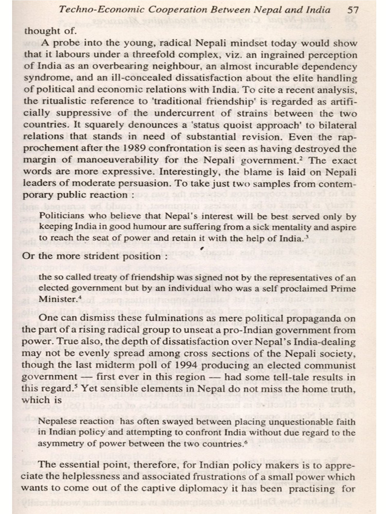 It is nothing unexpected that relationships between two countries, especially two neighbouring ones like Nepal and India, appear to be erratic and uneven, occasionally merging into crisis or near-crisis situations. But all these may not, for instance, entitle Ganesh Man Singh, a top ranking leader of the Nepali Congress, to suggest that the relation-ship between India and Nepal is that between a wolf and a lamb. This suggestion cannot possibly claim even momentary truth. On the contrary, the 12 April 1995 Joint Statement of the Prime Ministers of Nepal and India underline a lasting truth: there are no major problems between the two countries.