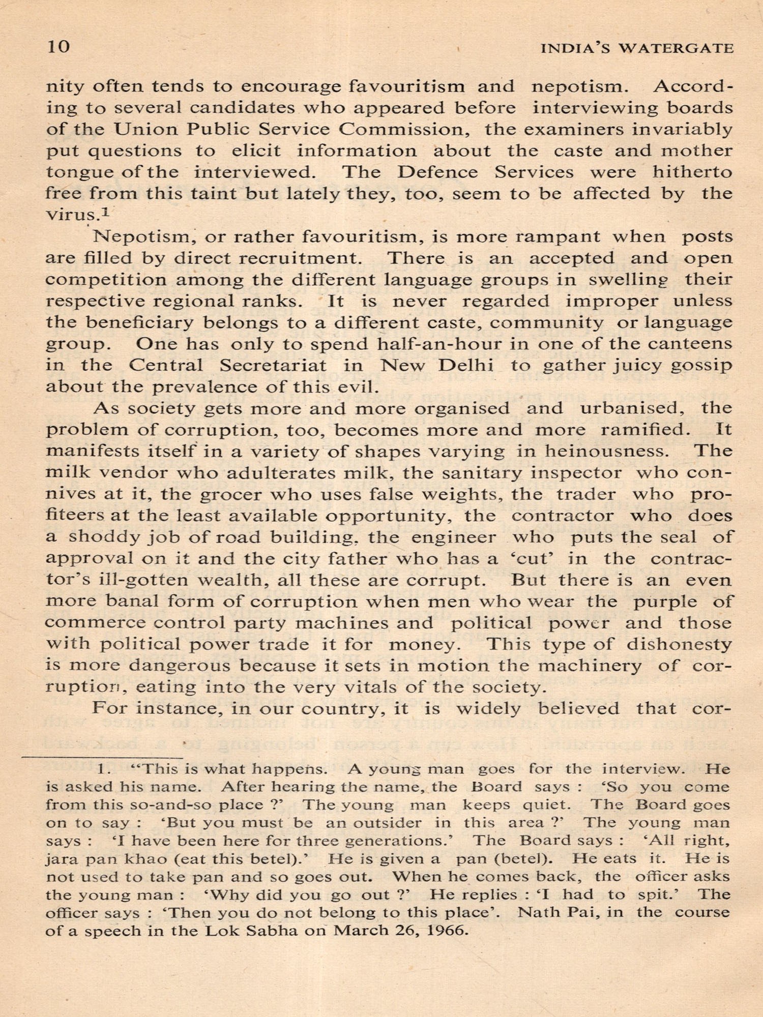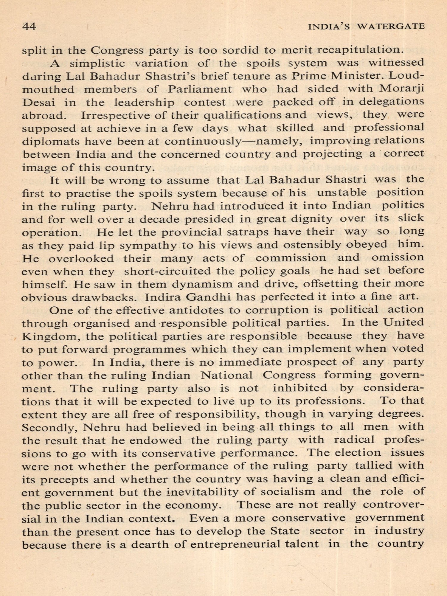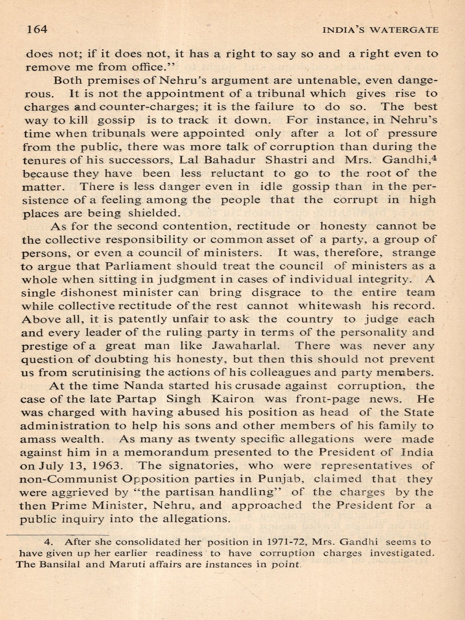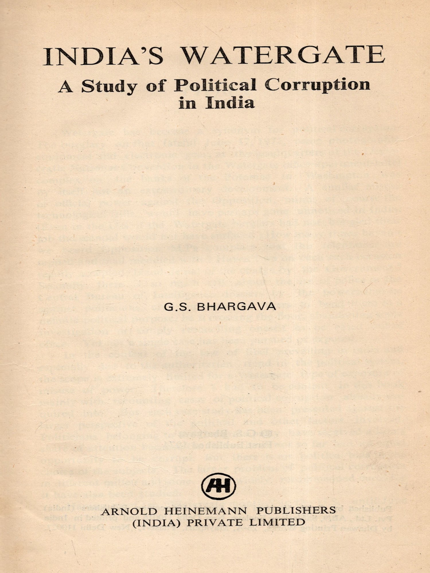 Having spent ten "Watergate months" in the U.S. until June 1974 as a Fellow of Harvard University-I had hit on this title for the book when the political motives behind the break-in, the effort at the highest level to cover up the crime, the attempted use of Executive power, including the intelligence apparatus and the taxation machinery, to silence persons engaged in bringing the culprits to book, the lies, the sanctimonious hypocrisy that any threat to Nixon's position will affect world peace, all endowed it with the character of full fledged political corruption. But its al-most revolutionary culmination in Richard Nixon's ignominious exit from public life brought out the positive dimension of the episode that the system has health enough to purge itself of the filth. I hope in India, too, we will develop similar strength of character at different levels to wage war on political corruption because as the Santanam Committee pointed out without ensuring ministerial integrity at the Centre and in the States graft in the administration cannot de tackled, and a dishonest administration, especially in Indian conditions, distorts national growth. In the short run, it is adding to the people's distress, though it is fashionable among some politicians and journalists to decry parliamentary and public preoccupation with the problem of corruption as waste of time to be better devoted to economic and political issues. If my prayer is answered and if we are able to forge effective methods of exposing and fighting political corruption it will be a vindication of the choice of the title for the book.