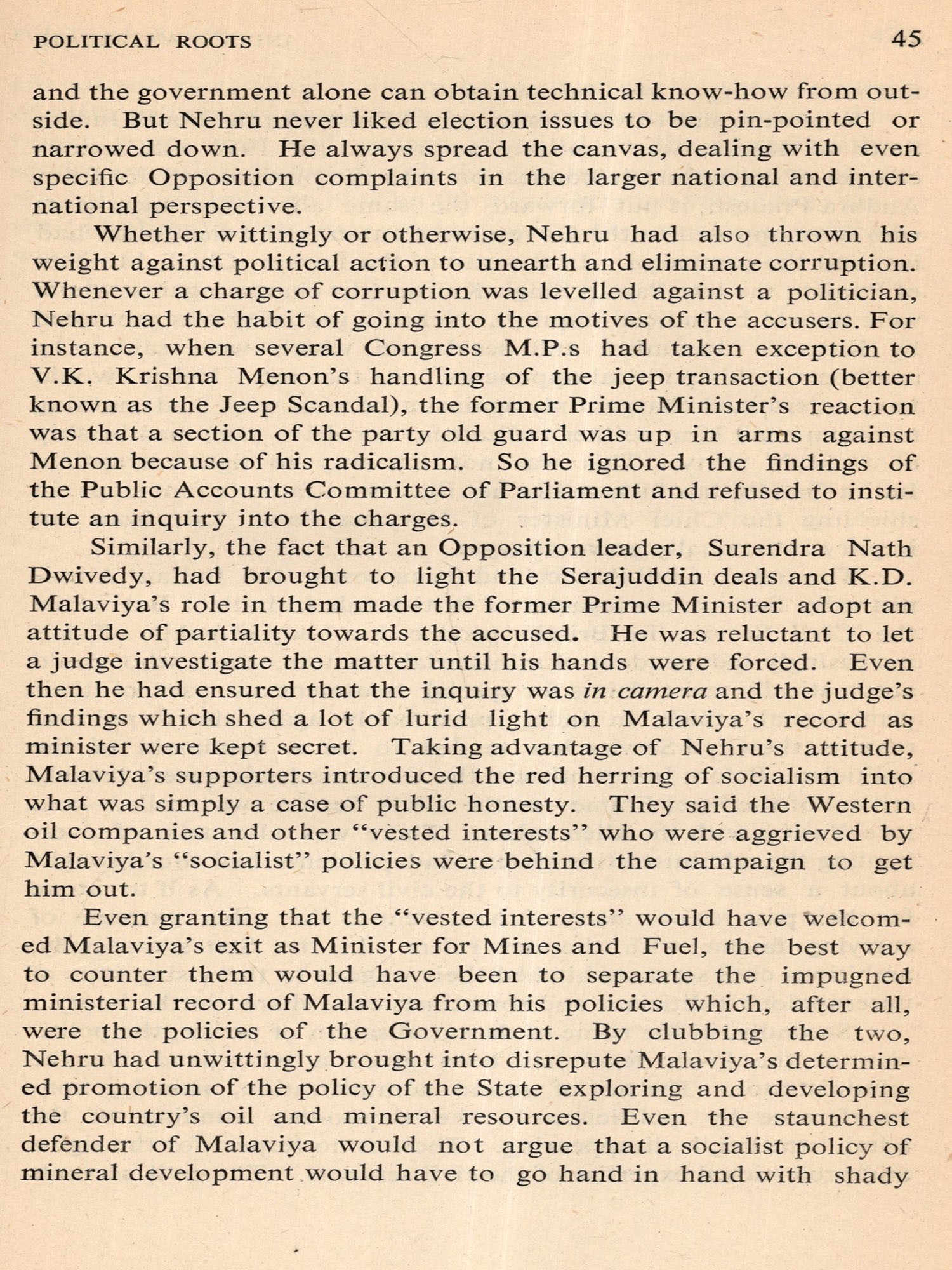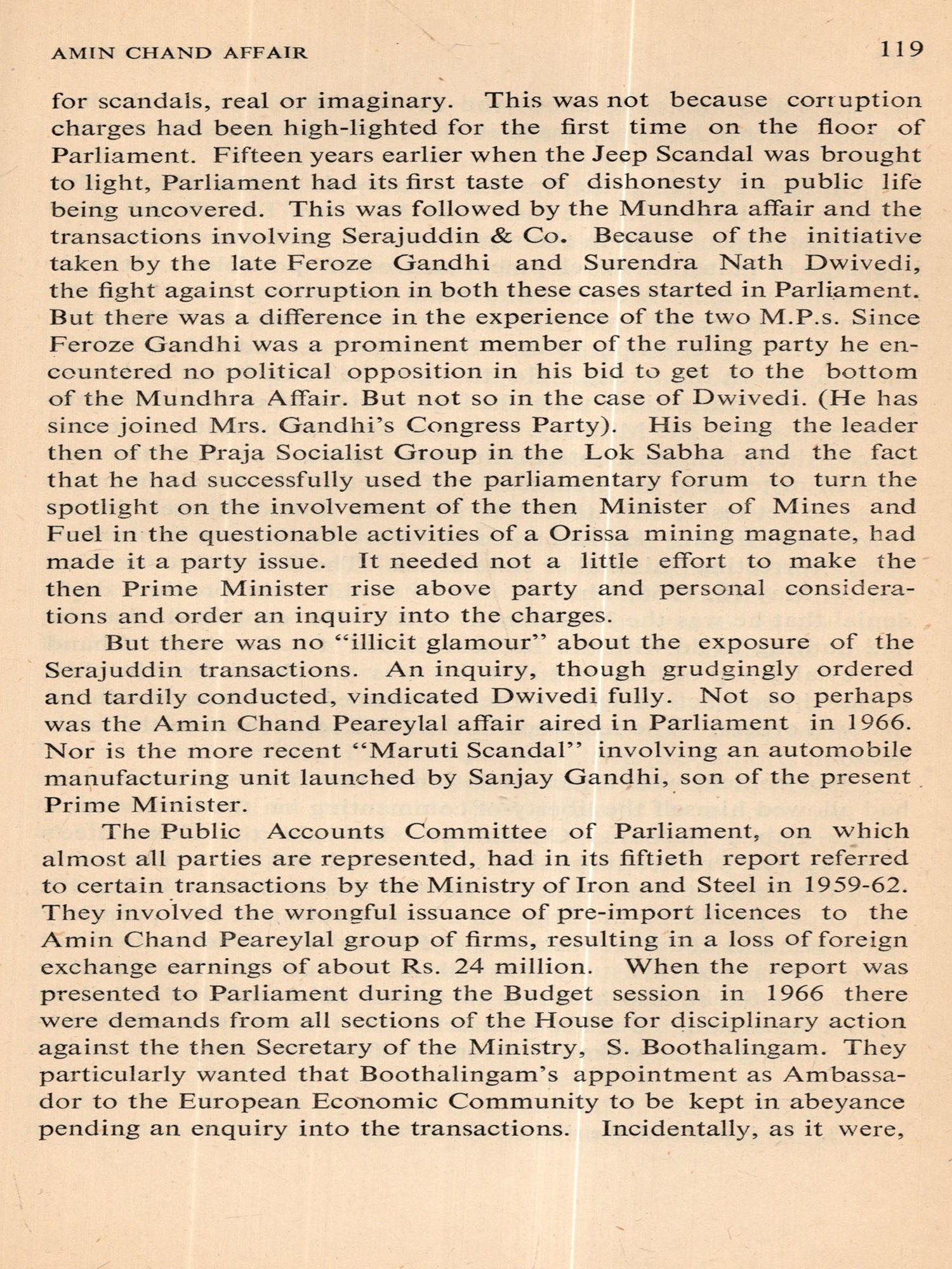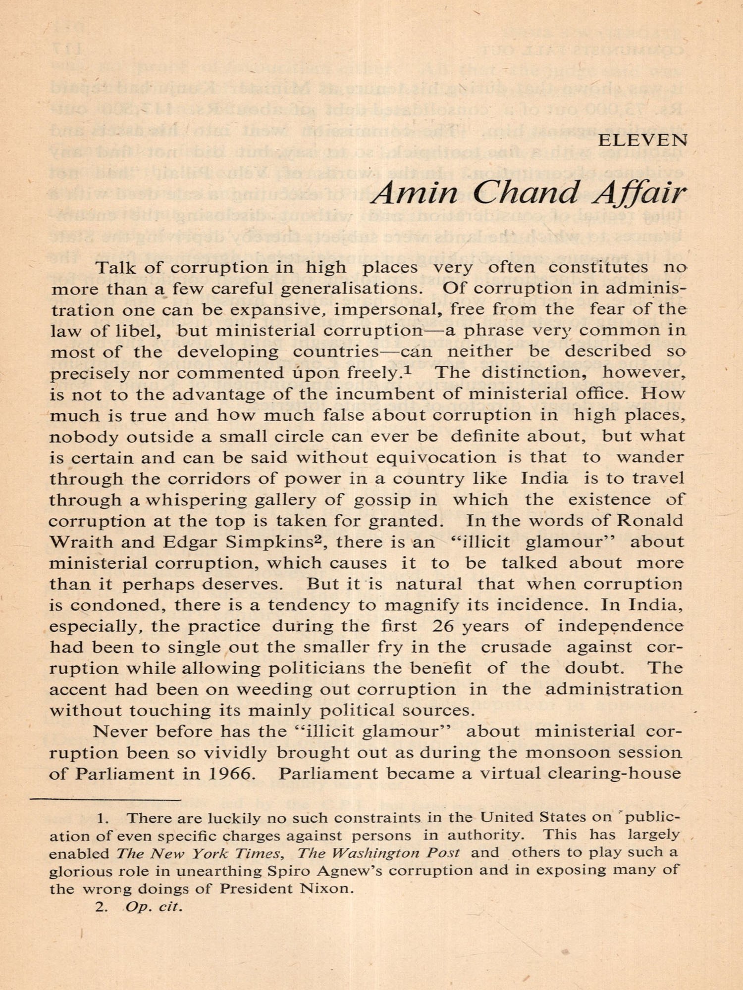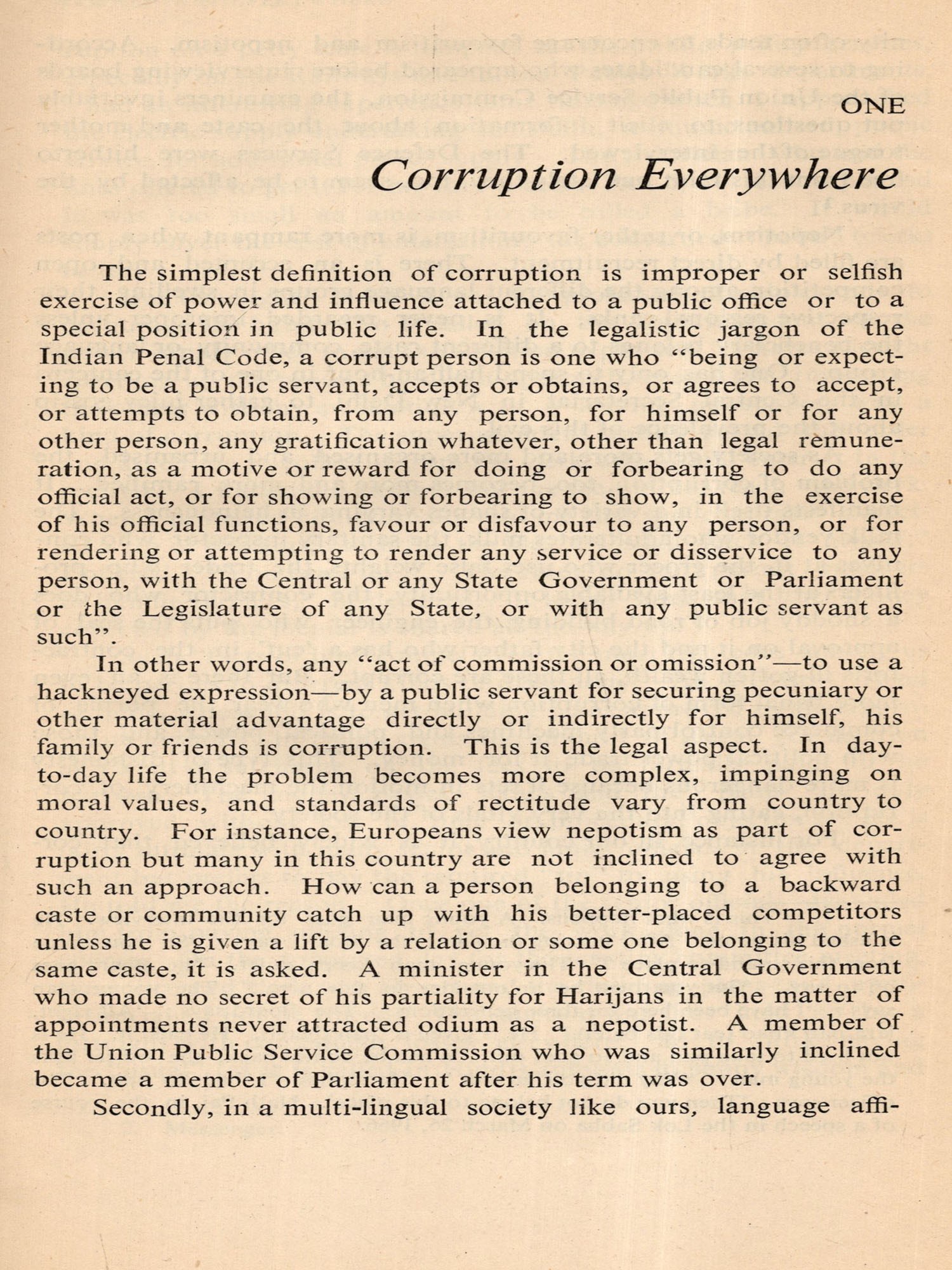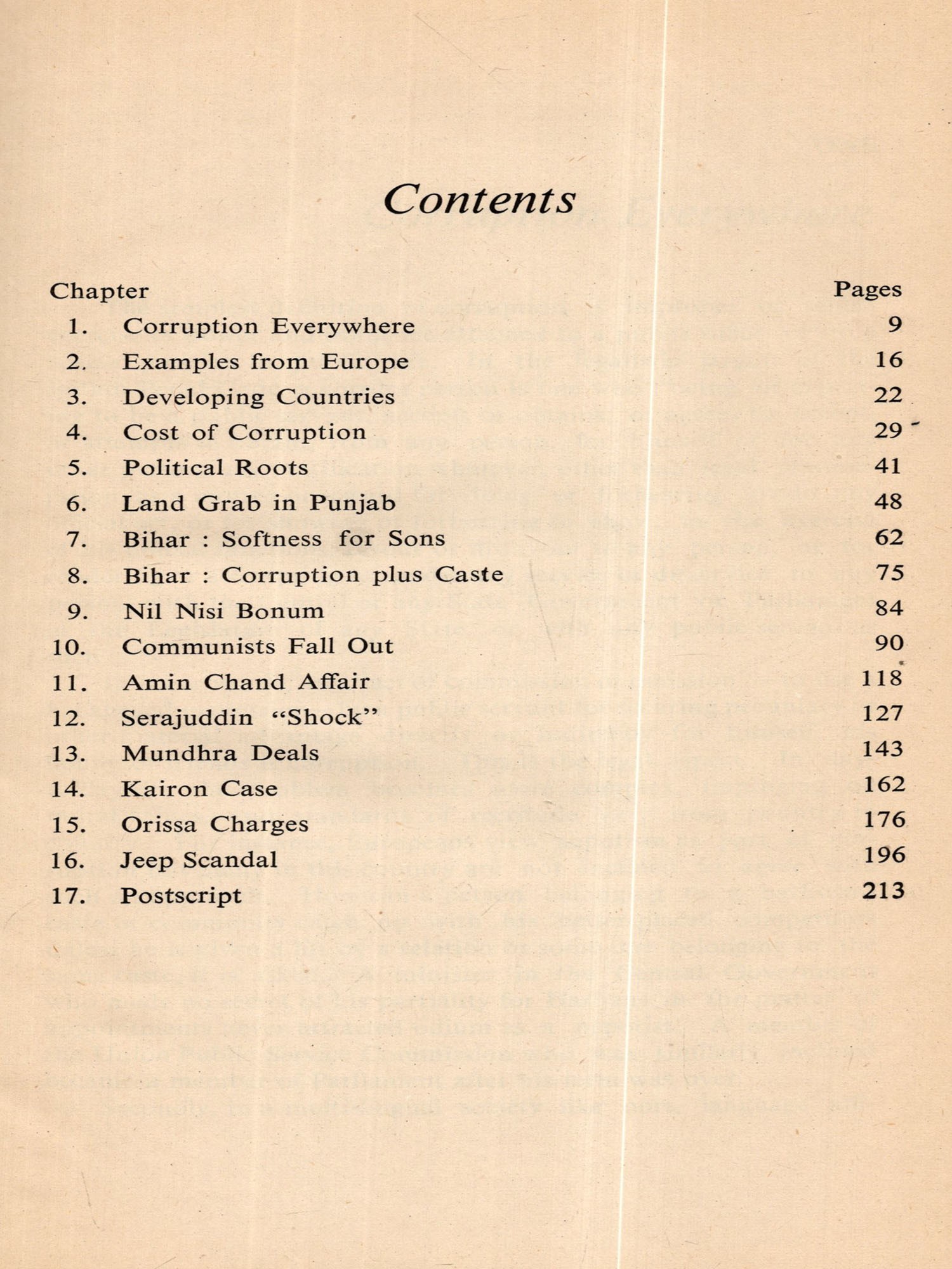 In the context of the law of libel prevailing in India and especially due to the authoritarian trend in the political system, the scope is extremely limited for a Watergate type of exposure of misuse of power. Therefore I had to be content in this book mainly with recounting cases of political corruption already enquired into. But each case study has been presented against the larger perspective of the political and other factors involved. Politicians belonging to the Congress party have received a lion's share of attention because the others have not so far had an equal opportunity to be corrupt. But there is no political bias in the choice of the subjects. The larger problem of political corruption in different milieu and some of the widely recommended cures for it have also been studied.
