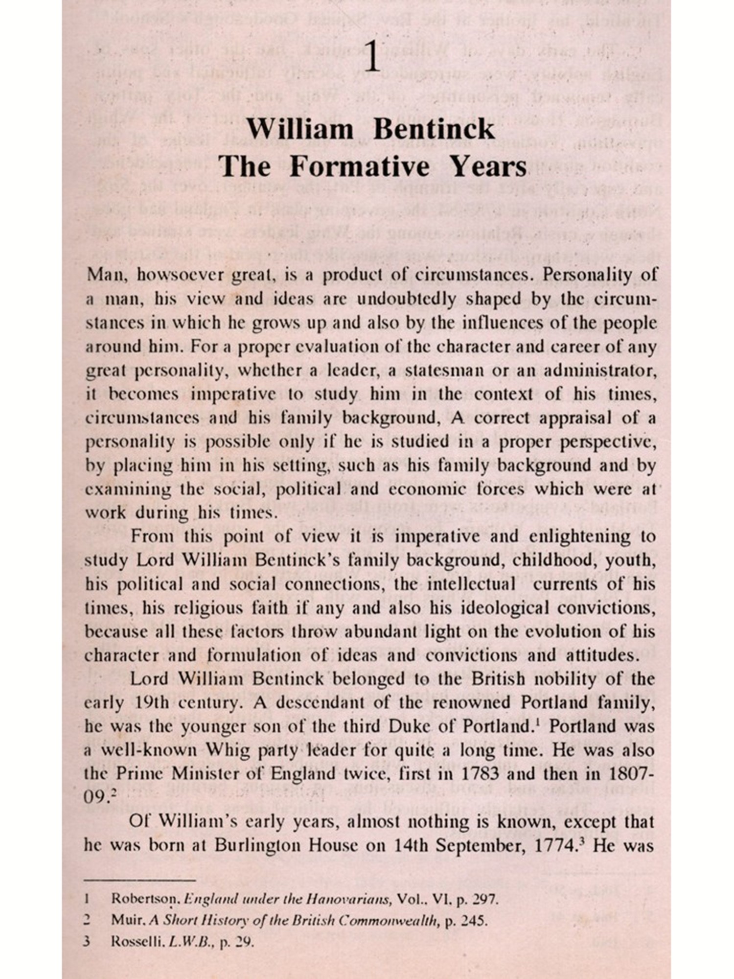 This research work is an attempt to find answers to the above raised questions. It aims at studying the administrative tenure of Lord Bentinck in its correct historical perspective. It is intended to critically examine his administrative measures in the context of the social, political, economic and intellectual forces, currents and cross currents which were operating both in England and India at the time of Bentinck, the real objectives and basic politics of his masters in London, together with his own political views and philosophy, if any, the early ideological influences during his formative years and his early career. Such a study alone can bring to light the underlying motives of Bentinck in adopting an apparently reformist stance.