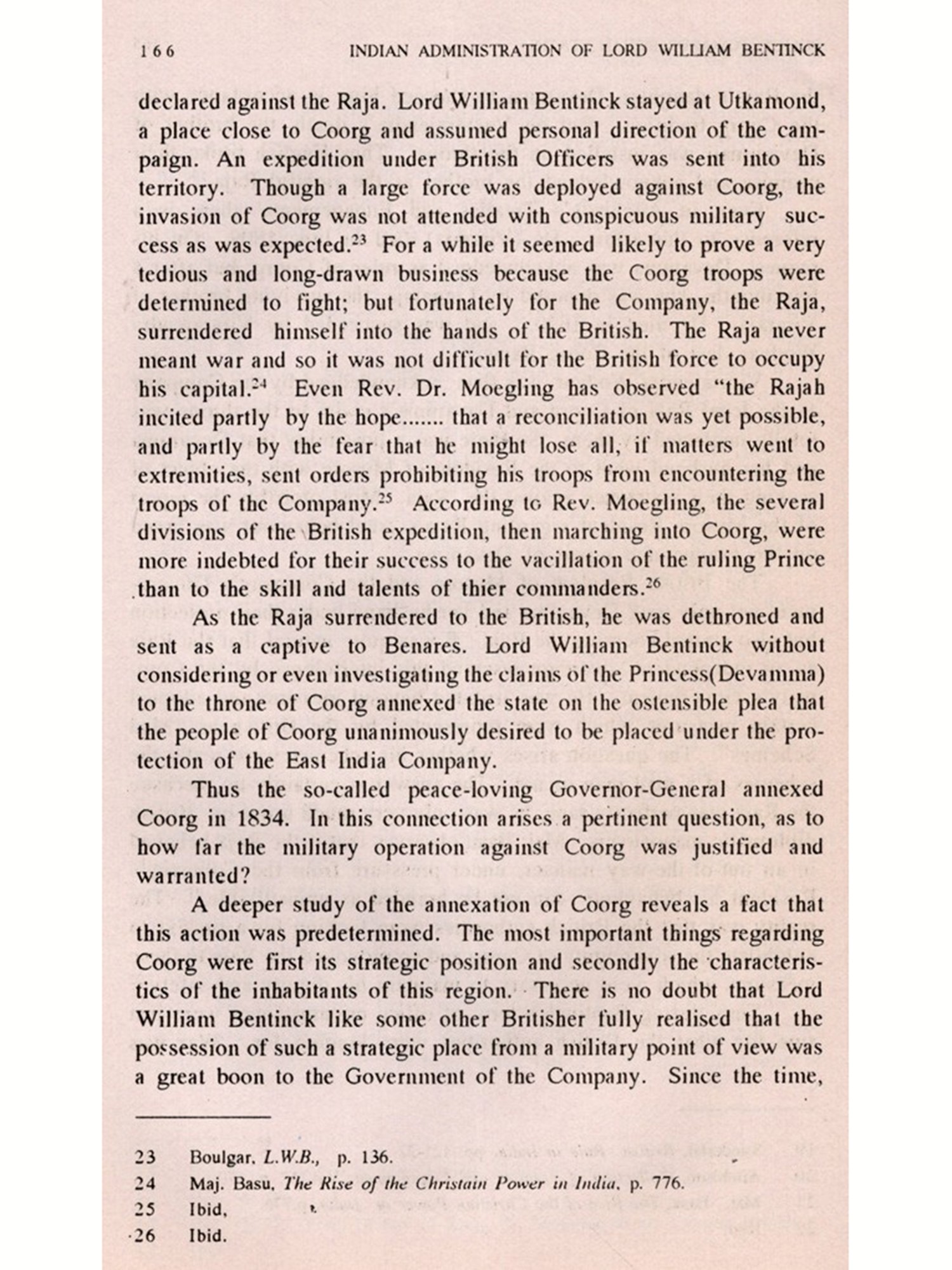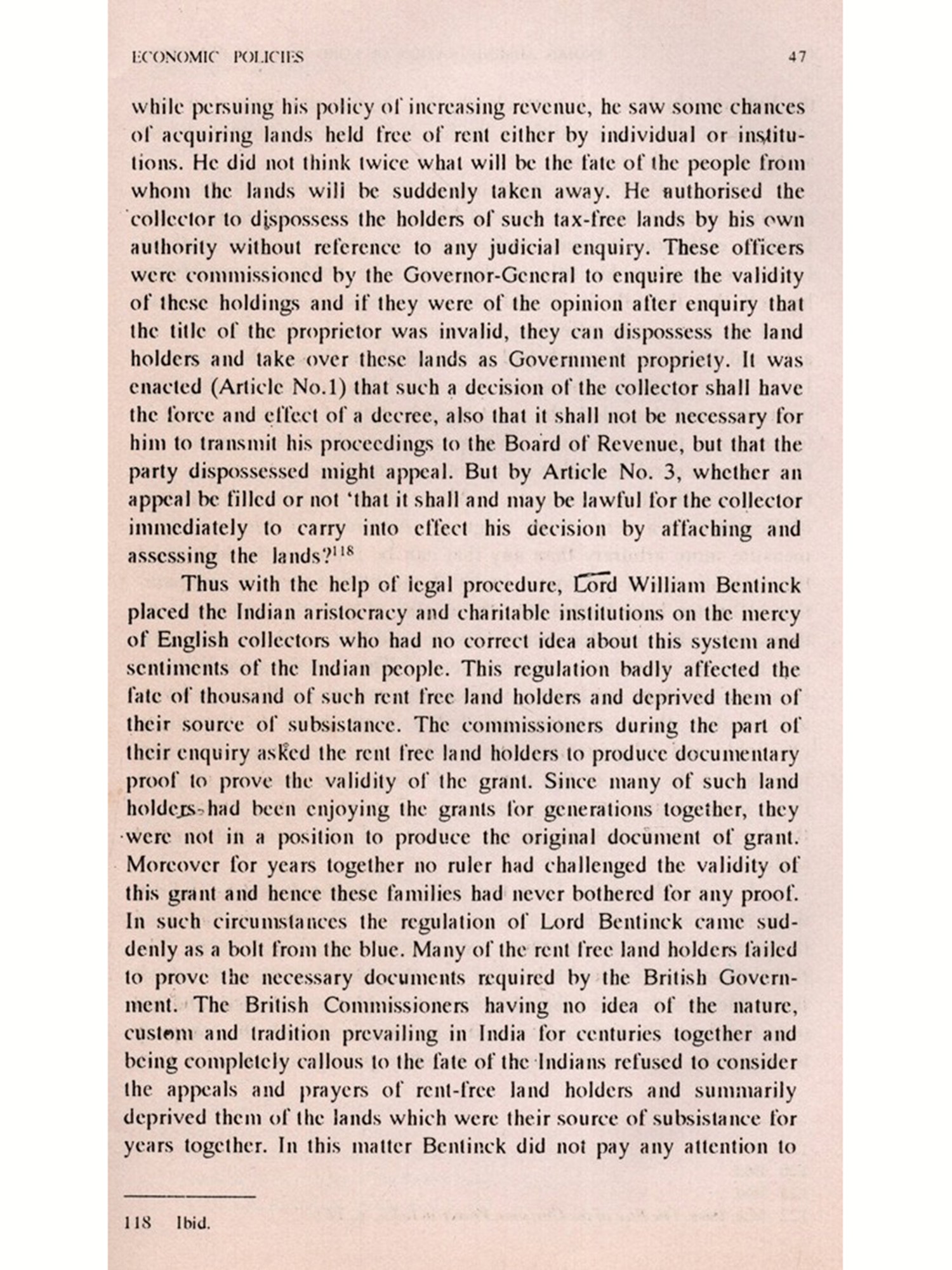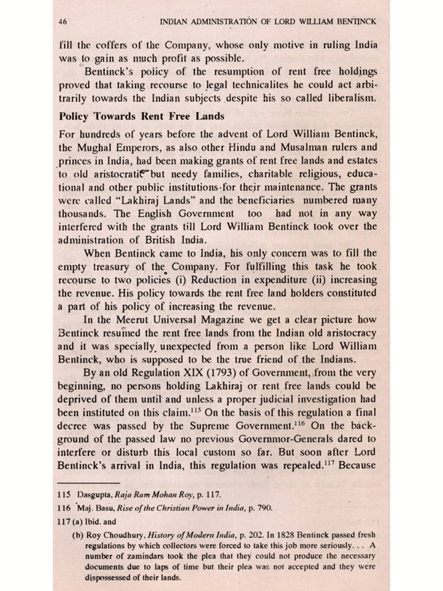 However, this commonly projected image of Lord William Bentinck does not appear to be in consonance with the policy of mercantile colonialism adopted by the English East India Company in India. Since the sole object of the Company's Government of India was to bold India in total subjection with a view to promote British interests, it seems unbelievable that Bentinck acted on a purely liberal impulse to promote the welfare of the subject race. Moreover, he does not appear to have developed any conflict with the Home authorities due to his liberal reforms in India, as it happened during the tenure of Lord Ripon. Therefore, it is reasonable to deduce that there must be some secret underlying motives behind his so-called reforms. It is revealing to note the observation of one of his contemporaries, Sir Fredrick Shore, that "his good intentions were never to interfere with the main principle of British Indian Government that is-profit to themselves and their masters at the expense of the Indian People". Major Basu the Indian historian has gone a step further by commenting that, "every political and administrative measure that he carried out in India was for their benefit and was calculated to do harm to the natives of the soil".