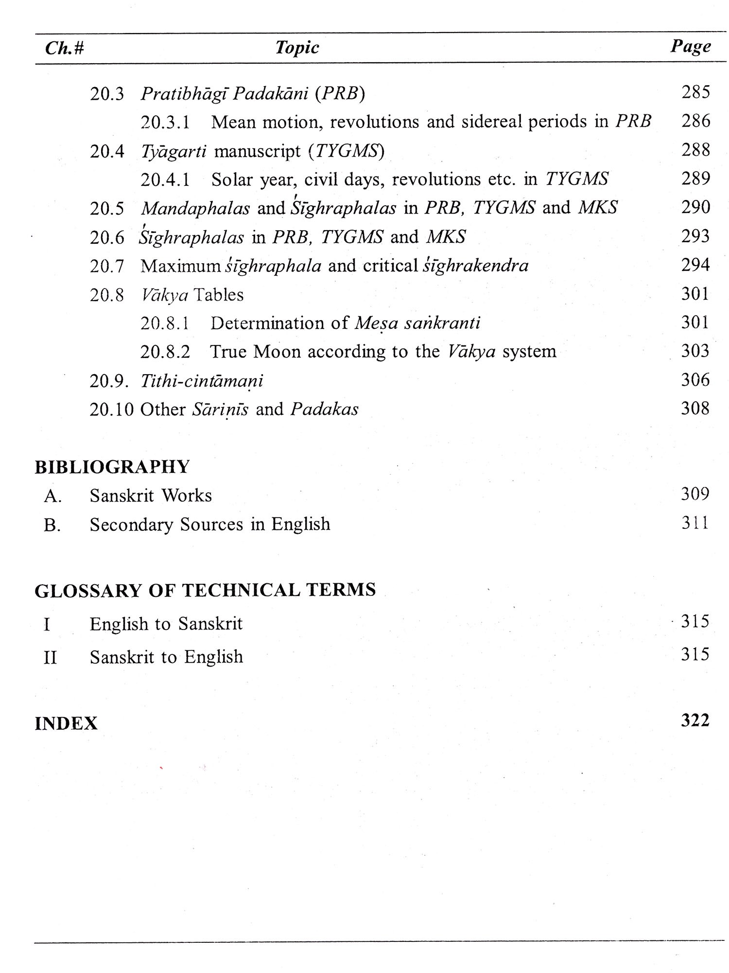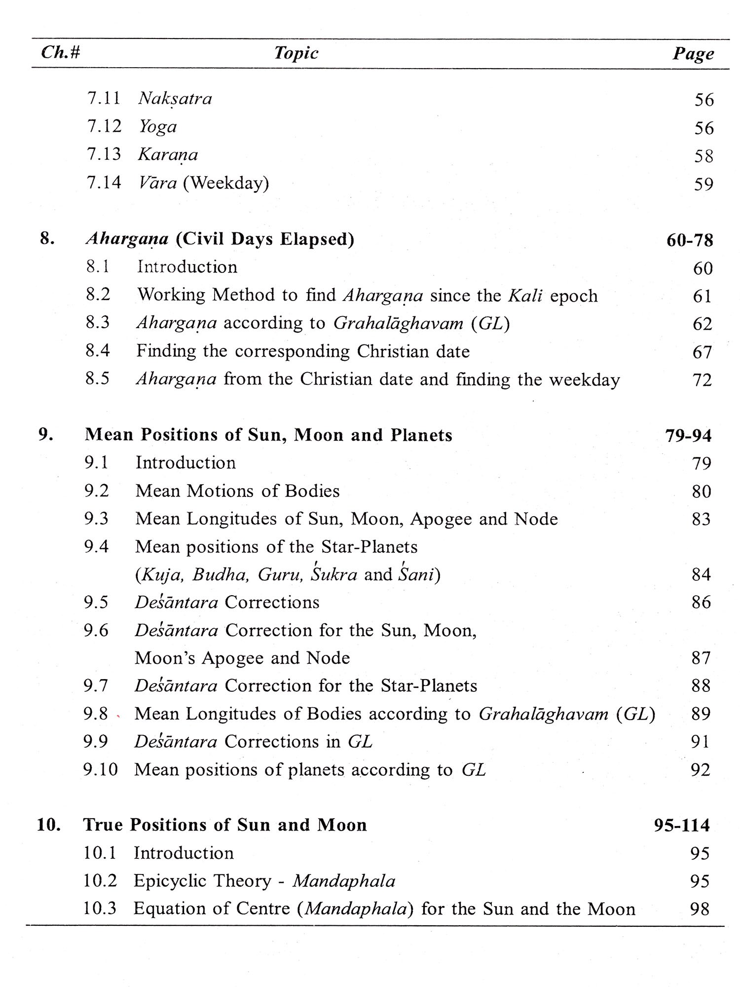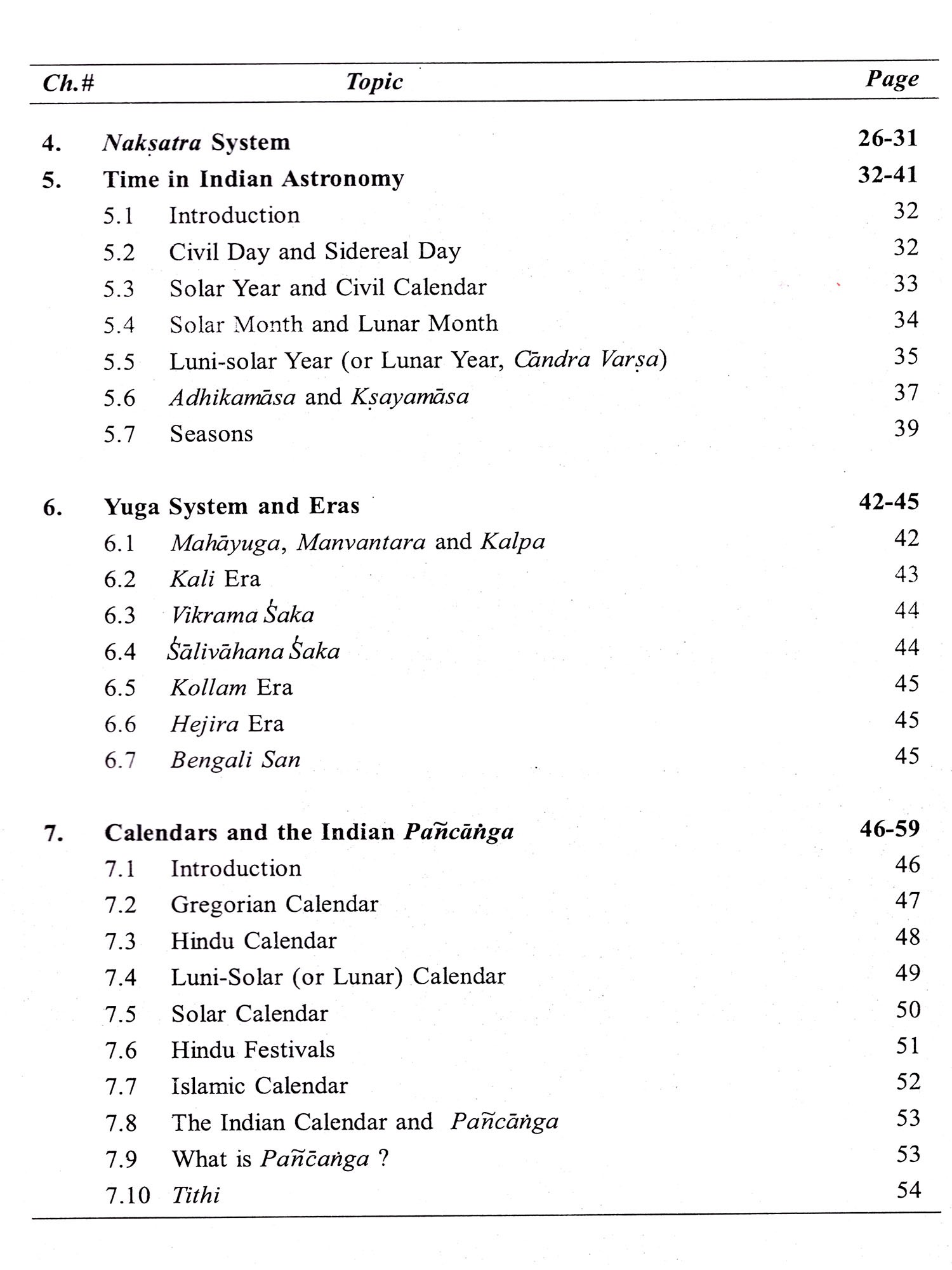 The yuga system and the different eras are discussed in Chapter 6. Calendar systems, viz., the Gregorian, Hindu and Muslim solar and lunar systems and the five limbs (paricanga) -tithi, vara, naksatra, yoga and karana-form the subject matter of Chapter 7. The methods of finding ahargana (number of civil days from a chosen epoch) are dealt with in Chapter 8.