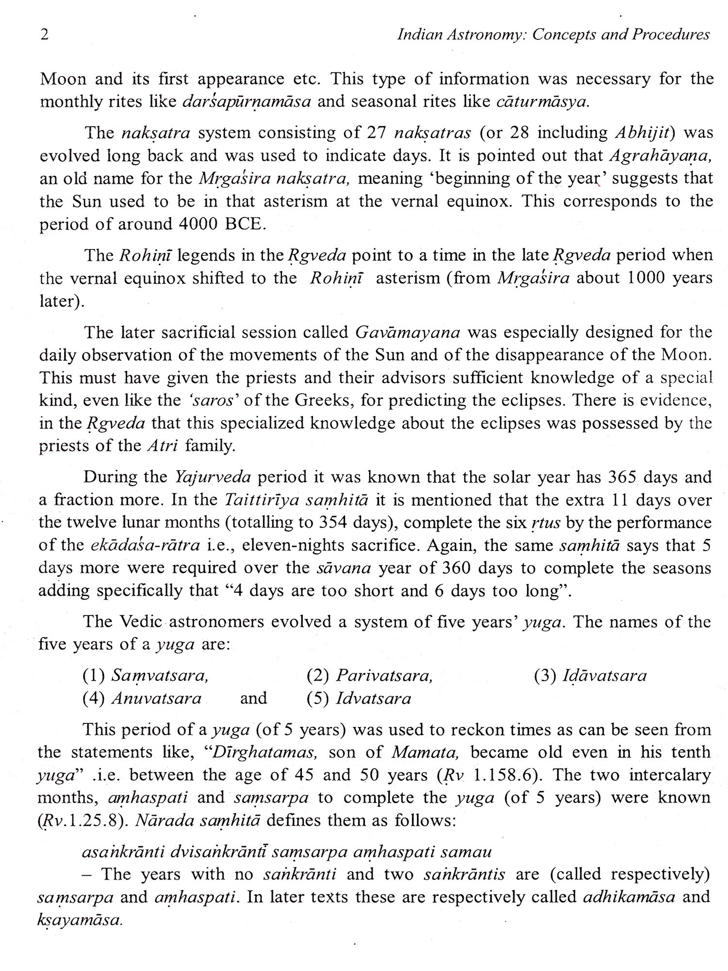 The basic concepts of the celestial sphere, zodiac, constellations, equinoxes, etc. are discussed in Chapter 2. The different coordinate systems, viz., celestial longitude and latitude, right ascension and declination, azimuth and altitude, transformation of coordinates, the phenomenon and effects of the precession of the equinoxes constitute Chapter 3. The naksatra system is explained in Chapter 4. Division of time into convenient units like civil day and sidereal day, solar and civil calendars, solar and lunar months, adhikamāsa (intercalary months) and ksayamasa and the six rtus (seasons) are explained in Chapter 5.