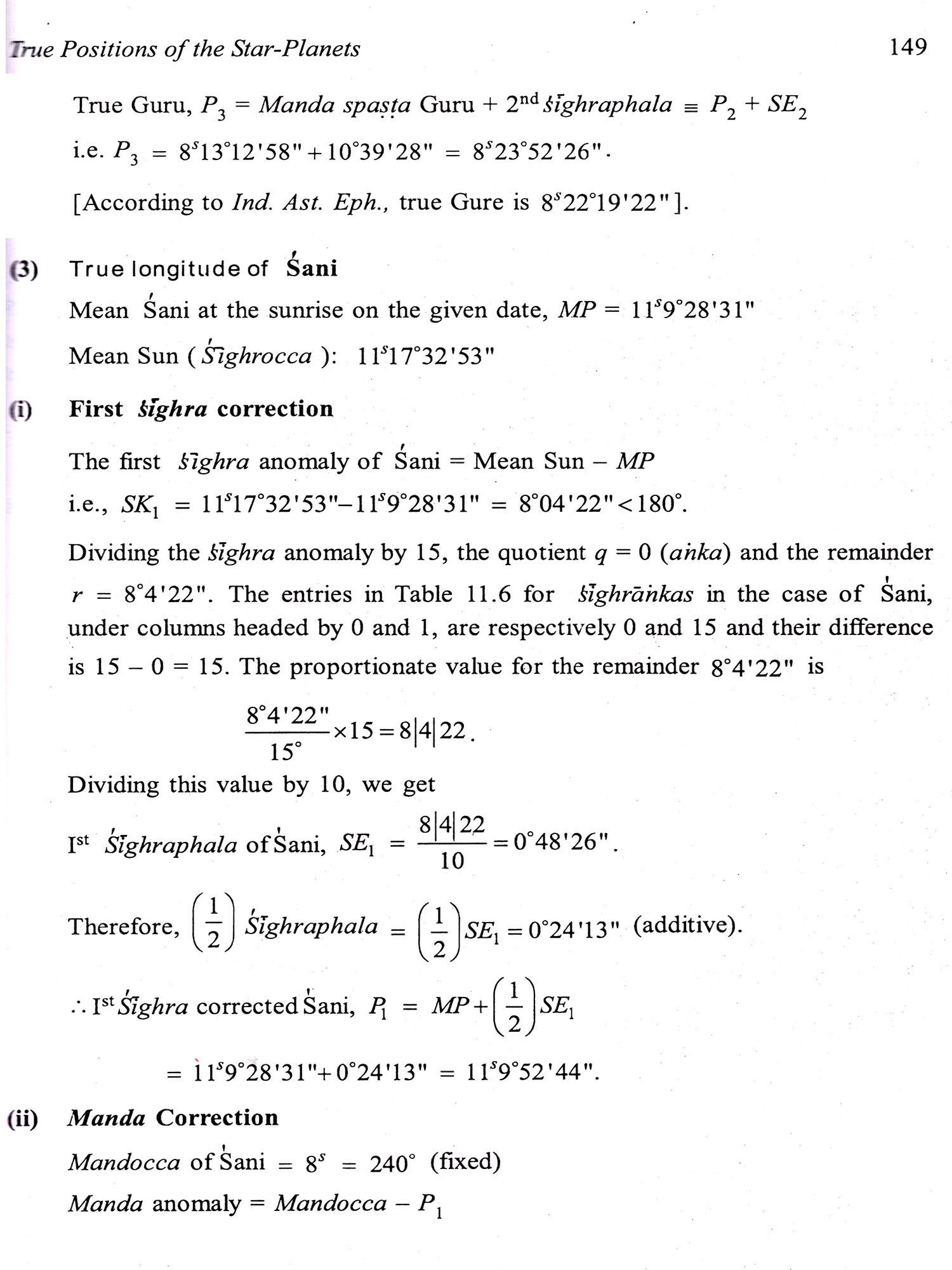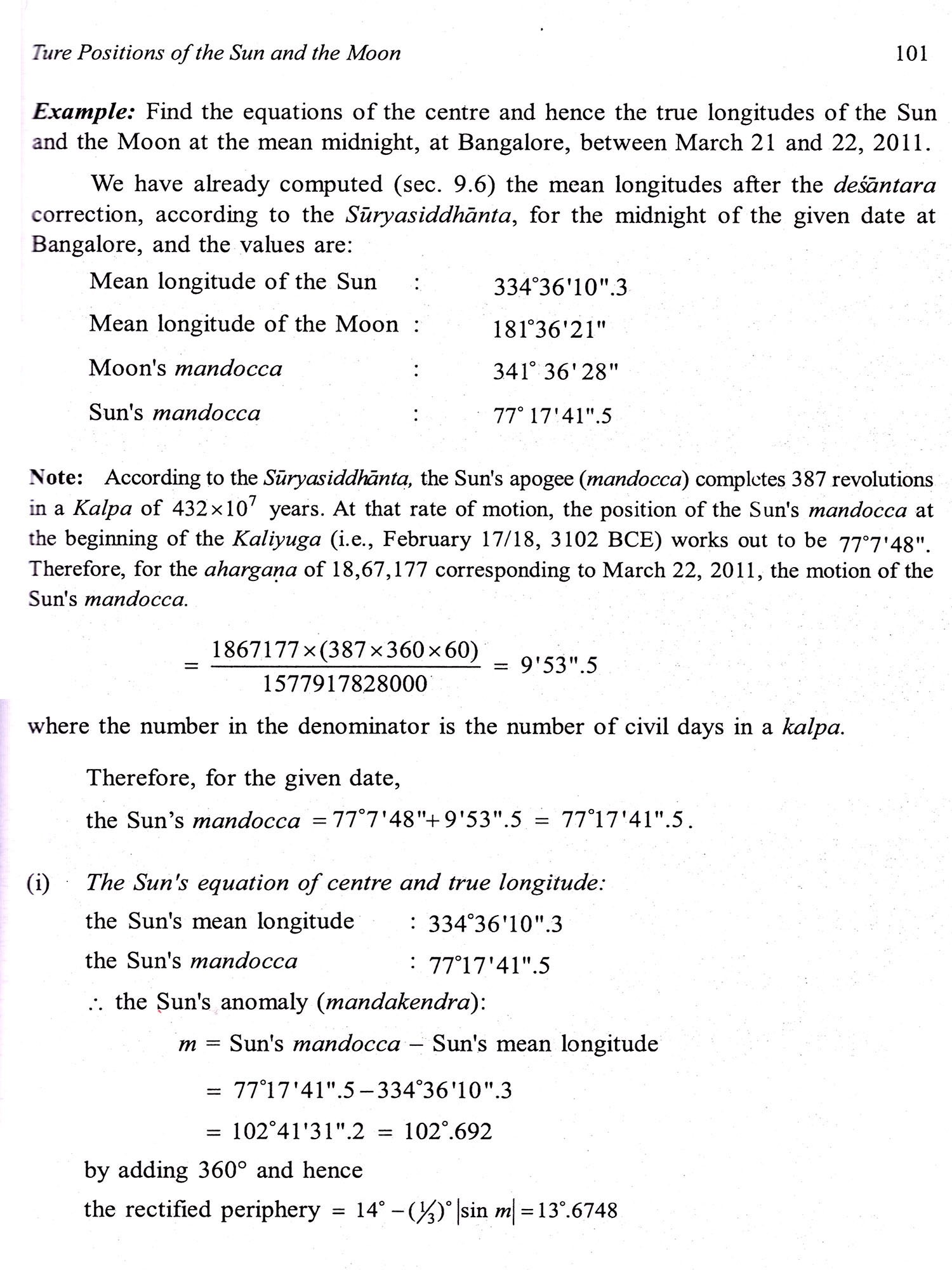 From the mean positions of the Sun and the Moon, their true positions can be obtained by applying the 'equation of the centre" (mandaphala). For this purpose, Indian astronomers have prescribed the peripheries(paridhi) of the manda epicycles of different heavenly bodies. These aspects as well as the true daily motions of the Sun and the Moon, the bhujantara correction, etc. are elaborated in Chapter 10.