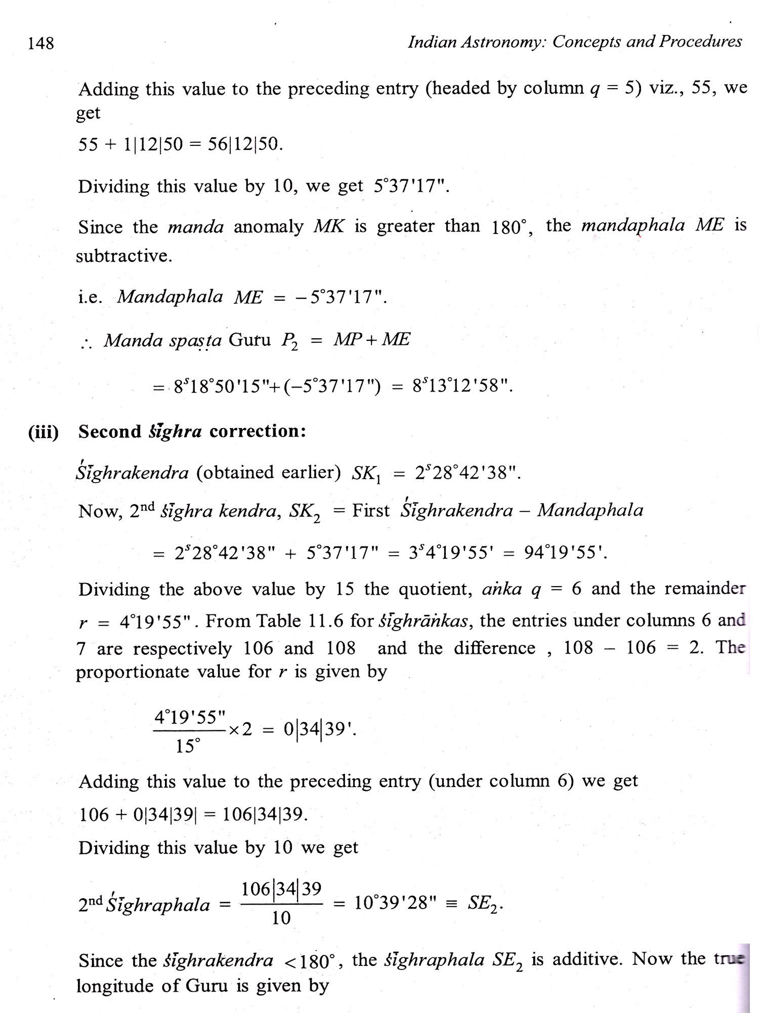 In the case of the five planets, in addition to the mandaphala (equation of the centre), one more important equation called sīghra samskara (equation of conjunction") has to be applied. Here again, Indian astronomers have considered the peripheries of fighra epicycles. Chapter 11 deals with these equations for the determination of true longitudes of the planets as well as their true daily motions, retrograde motion (vakra gati) and the bhujantara correction for the so-called taragrahas (star planets),
