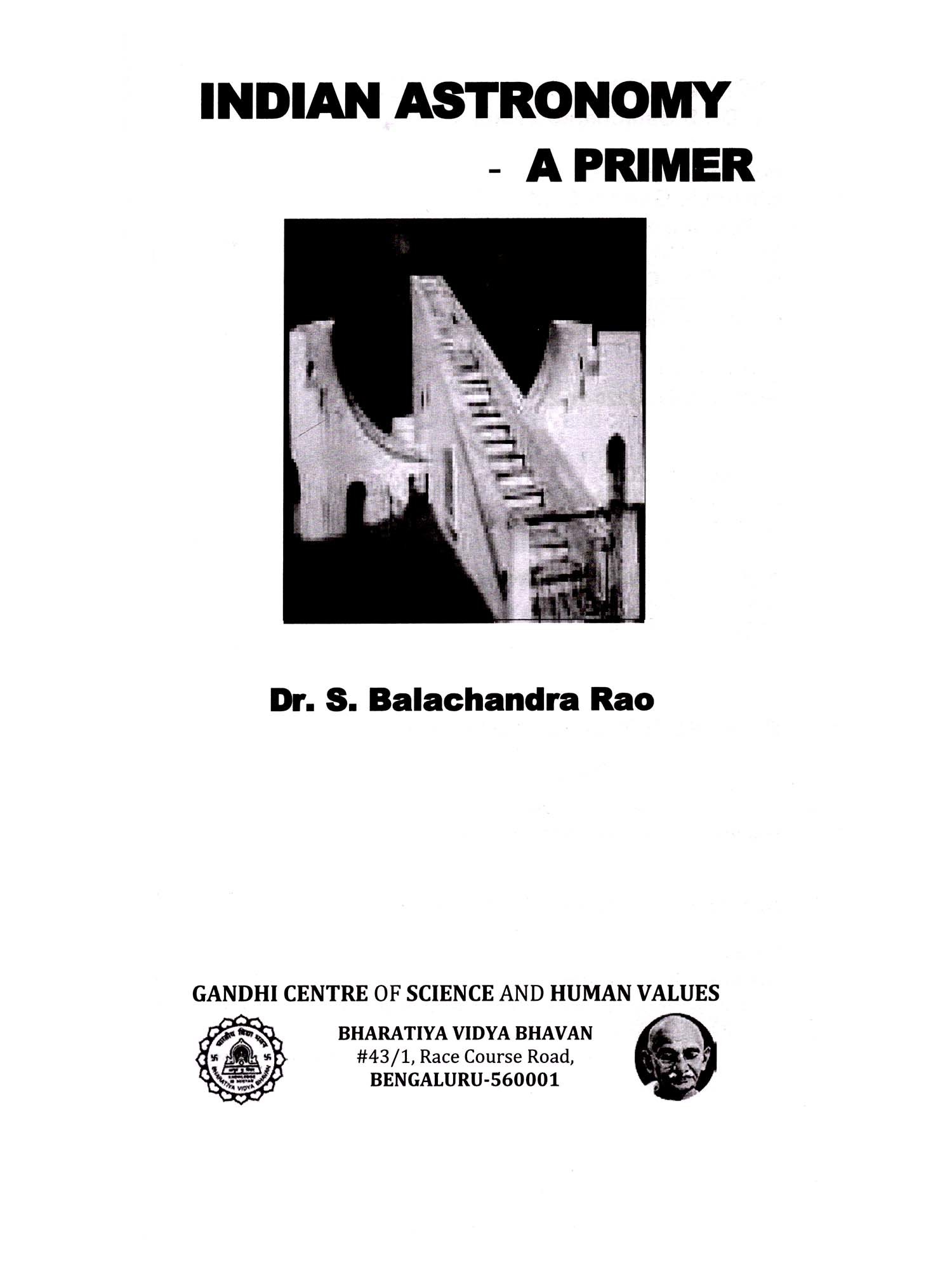 One of the main objectives of the Bharatiya Vidya Bhavan's Gandhi Centre of Science and Human Values is the dissemination of scientific knowledge among the public. The executive committee of the Bhavan's Gandhi Centre thought it appropriate to bring out among its publication series, the book "Indian Astronomy A Primer". It is hoped that this step will result in a larger circulation of the book not only among students but also among the discerning public both in this country and abroad, and also lead to a proper appreciation of the role of our ancient Indians in the development of astronomy and mathematics. The book is specially designed for the beginners, to provide an insight into the contributions of Indians from the Vedic period to the recent times i.e. from Vedanga Jyotisa, contributions of Aryabhata, Bhaskara upto Ganesha Daivajna and Samanta Chandrasekhara Simha (19th Cent.). The Centre is most grateful to Dr. S.Balachandra Rao for his researched and painstaking work. We hope that the book "Indian Astronomy - A Primer" will be received well. The Centre is grateful to Sri C.Gangadhar and Sri V.Ganesha for the pre-press job of this book and also to the Sreeranga Printers for their good and timely job of printing.