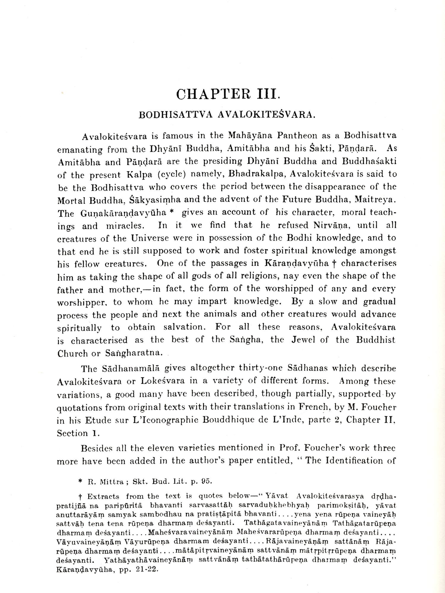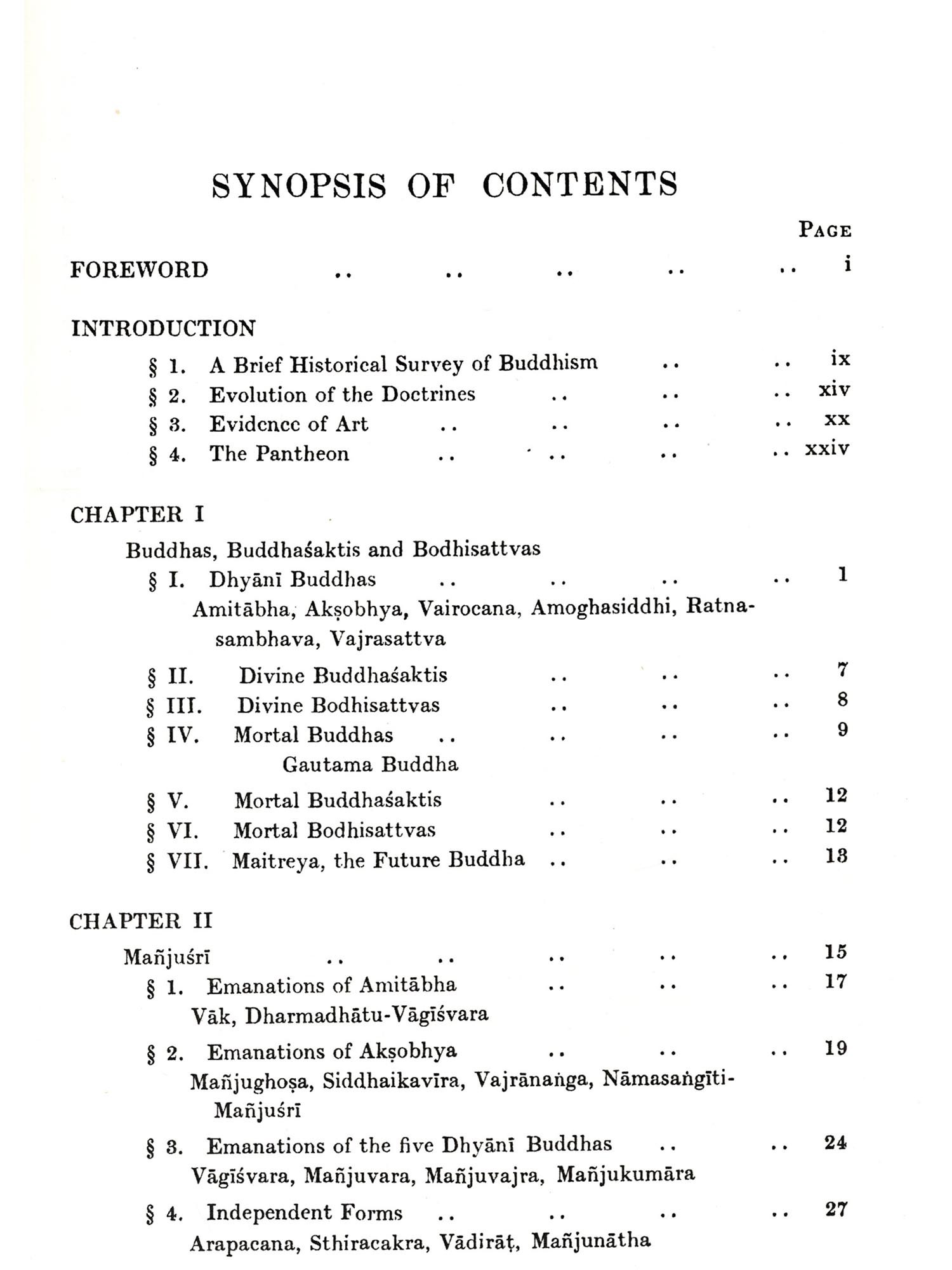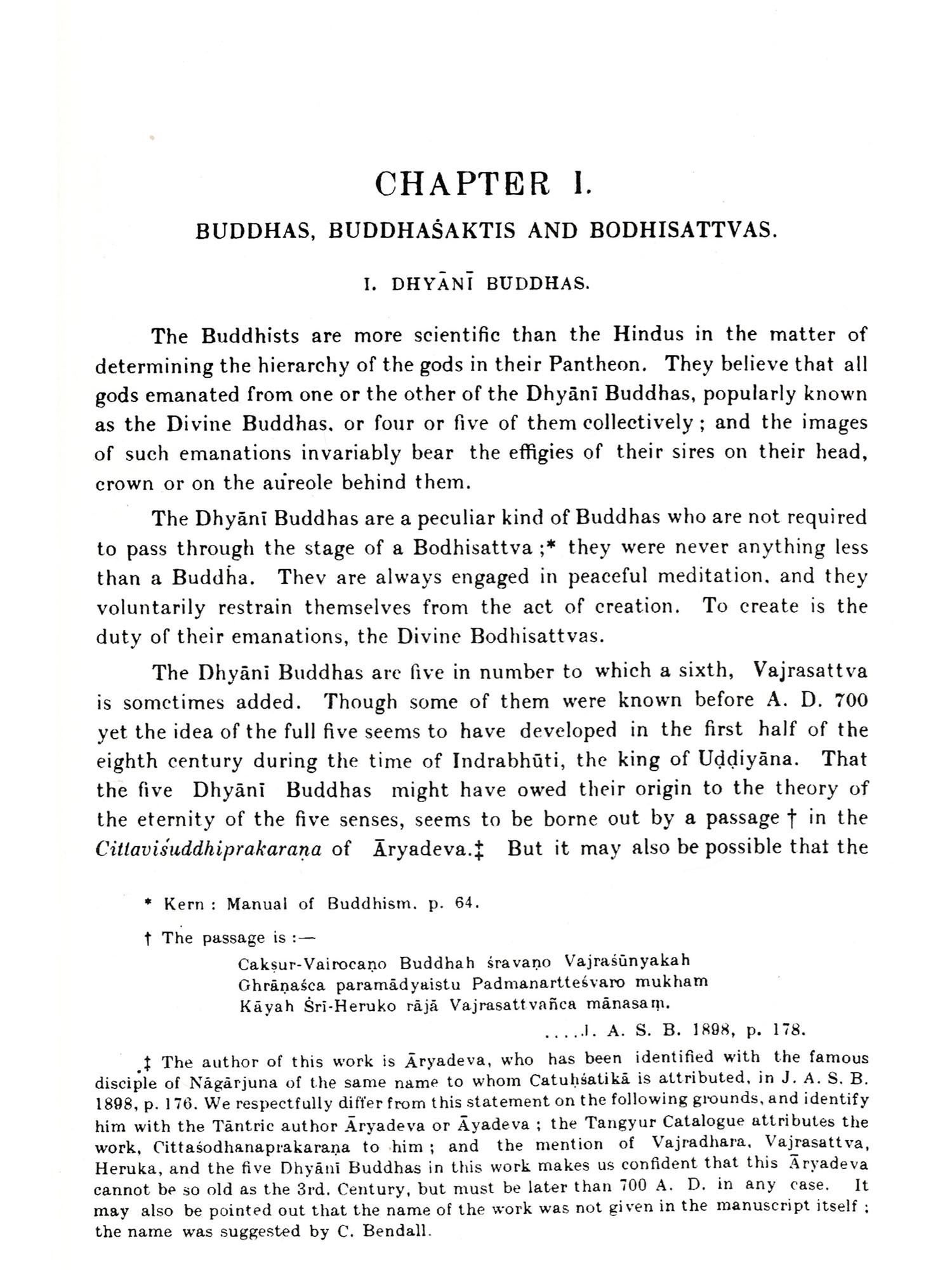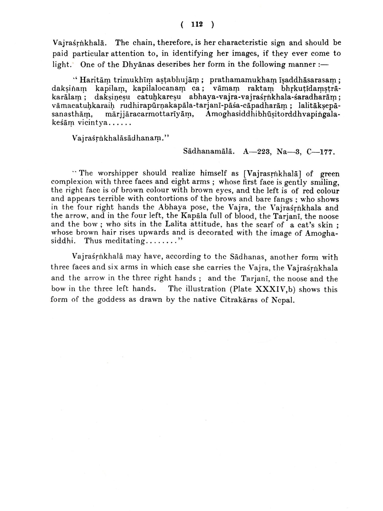 This volume represents part of the work done by me as a Government Research Scholar in Iconography for four years from 1920 to 1924. It is an attempt to write a comprehensive work on the Buddhist Iconography of India, and is mainly based on a Sanskrit text prepared from seven recensions of the Sadhanamälä aliar Sadhanasamuccaya in the libraries of the Asiatic Society of Bengal, Nepal, and Cambridge University. This text so collated I hope to publish as soon the opportunity presents itself. The text has been illustrated by pictures representing images in several museums in India and elsewhere and in the collections of numerous Nepalese monasteries. Where images could not be obtained or photographing was impossible or unsatisfactory the text has been illustrated with the help of drawings prepared by Nepalese Citrakaras of Buddhist origin from the ancient albums of their forefathers. Where no drawing could be obtained only the original text has been quoted with a translation. The publication of this work necessitated, on my part, a prolonged visit to Nepal whither my father, Mahamahopadhyaya Haraprasad Shastri, was proceeding on an invitation from His Highness the Maharaja of Nepal. It also necessitated a visit to the museums of Calcutta, Dacca, Patna, Sarnath, Lucknow, Mathura, and Ajmere, to the Cave-temples at Ellora and Ajanta, to the excavations at Nalanda, and to Vikrampur, the seat of Bengal Buddhism. In several ways I have been very fortunate in carrying out my researches. First, I have had the proud privilege of working under Professor A. Foucher, the accredited authority on Indian Buddhist images, during the period he was in charge of the Archæological Section, Indian Museum. Secondly, through the kindness of the Maharaja of Nepal I was able to secure a number of MSS. from the Durbar Library for collation and study. Thirdly, through the kindness of Mr. P. J. Hartog, M.A., C.I.E., Vice-Chancellor of the Dacca University, I secured the loan of one of the three Cambridge MSS. of the Sadhanamala which I had absolutely no chance of getting otherwise. Fourthly, during the first two years the most valuable library of the Asiatic Society of Bengal was thrown open for my use. Fifthly, the Dacca University gave me all facilities whenever applied for.