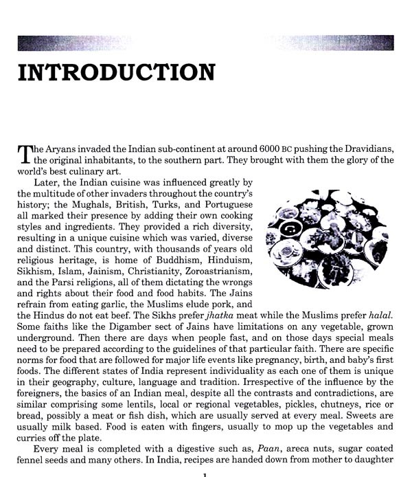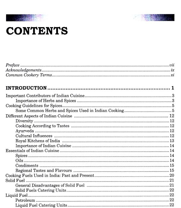 The book serves a platter of history of spices, their origin, the religious and medicinal impact of these spices, different cooking utensils and their usage, various methods of cooking and many finger-licking recipes. The text discusses the traditional and special delights of the four broad regions-East, West, North and South. The staple food and their occasion-oriented backdrop dominate all the descriptions. The recipes are simple, tested and standardized so that they can be easily adaptable by the students and professionals of college and food service organizations.