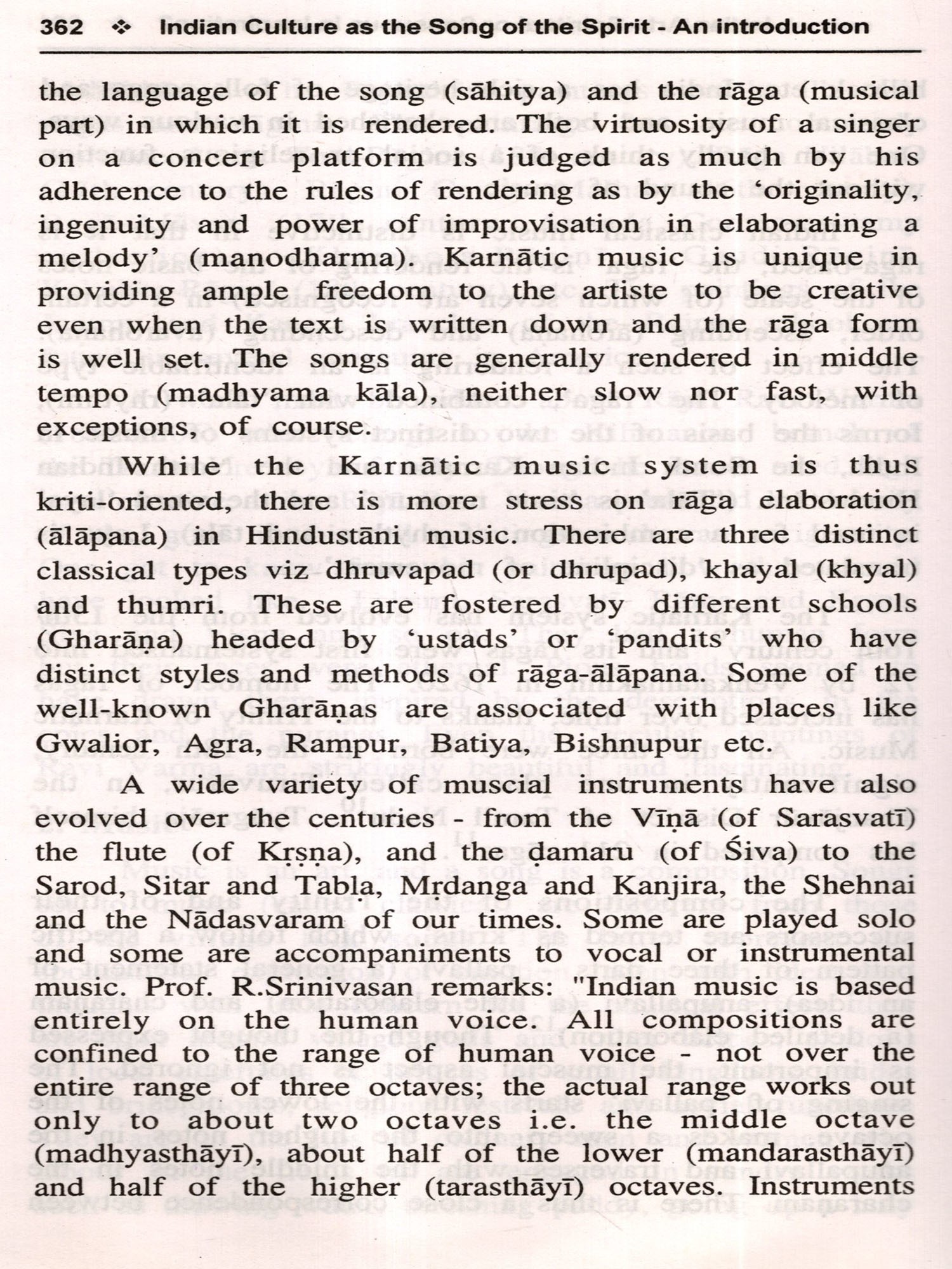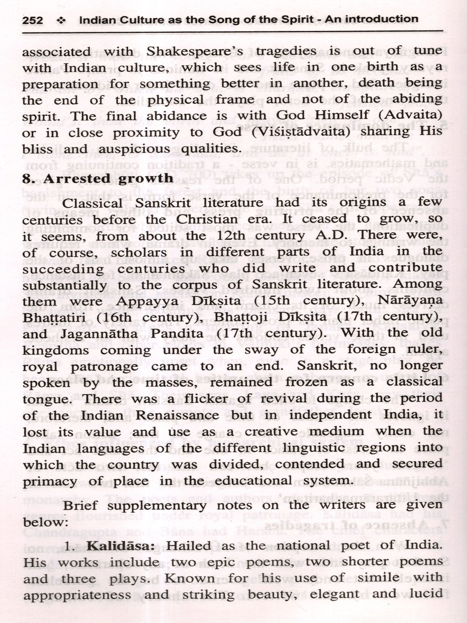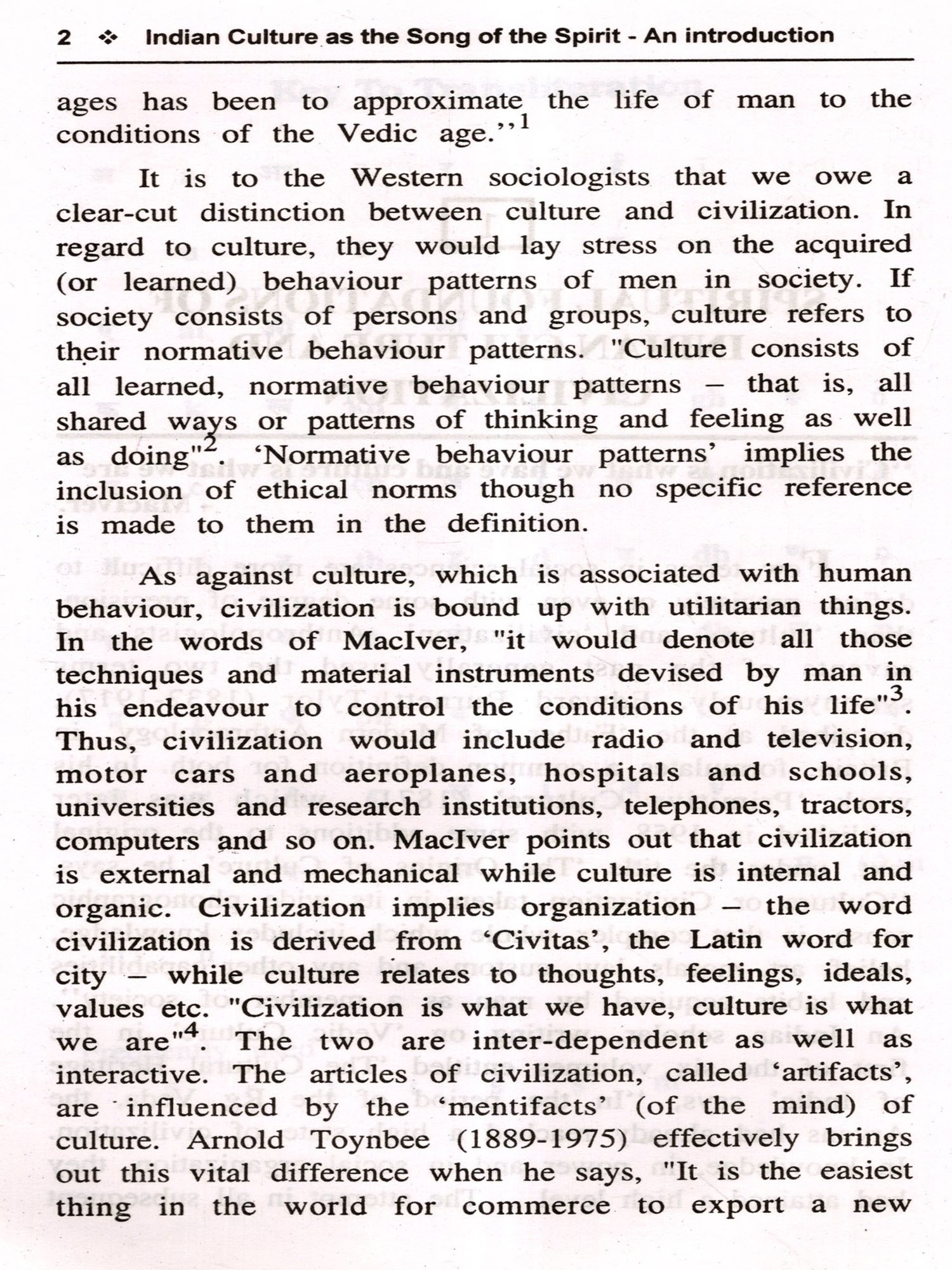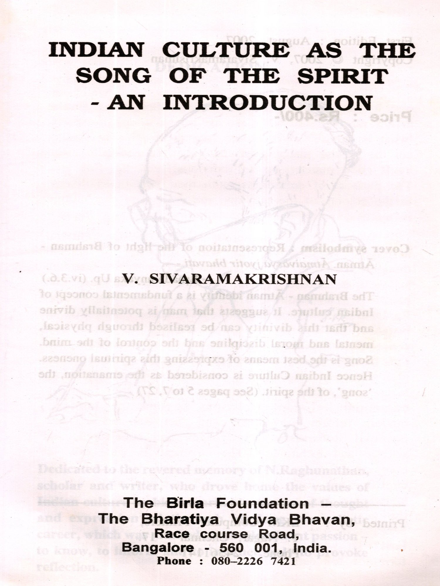 'Indian Culture as the Song of the Spirit' represents an attempt at breaking new ground. In dealing with Indian culture, my friend, Shri V.Sivaramakrishnan, has a method and a point of view. His method is to interpret Indian culture in terms of the definition of culture given by the British anthropologist, Edward Burnett Tylor (1832-1917); his point of view is that, it derives its strength and vitality, which account for its continuity compared to other cultures, from being a thing of the spirit. In holding this view, he relies for support on Sri Aurobindo and Dr.S.Radhakrishnan. Not only in his basic standpoints but in the exposition of his subject, of which he has a firm grasp, he goes to the basic texts and the well of scholarship at which generations have drunk deep.