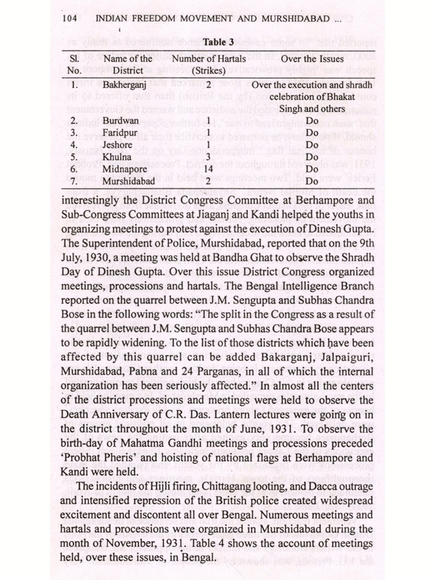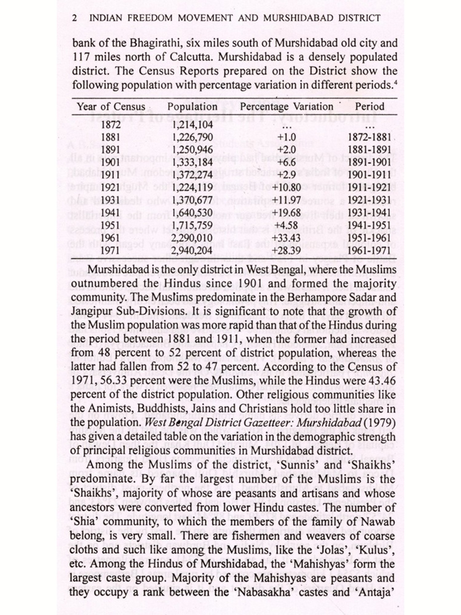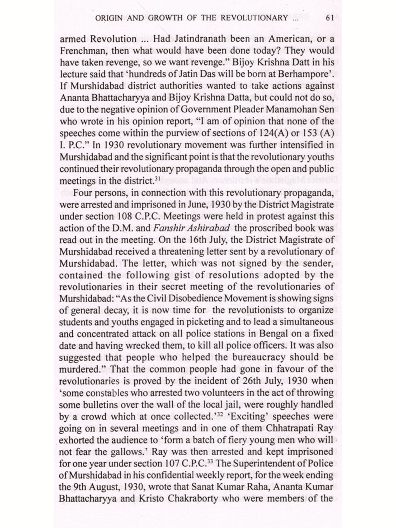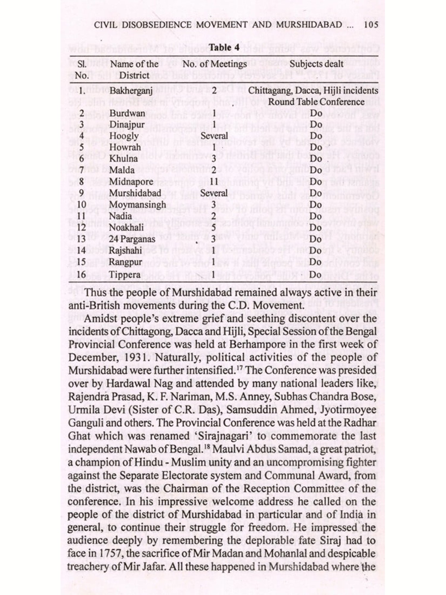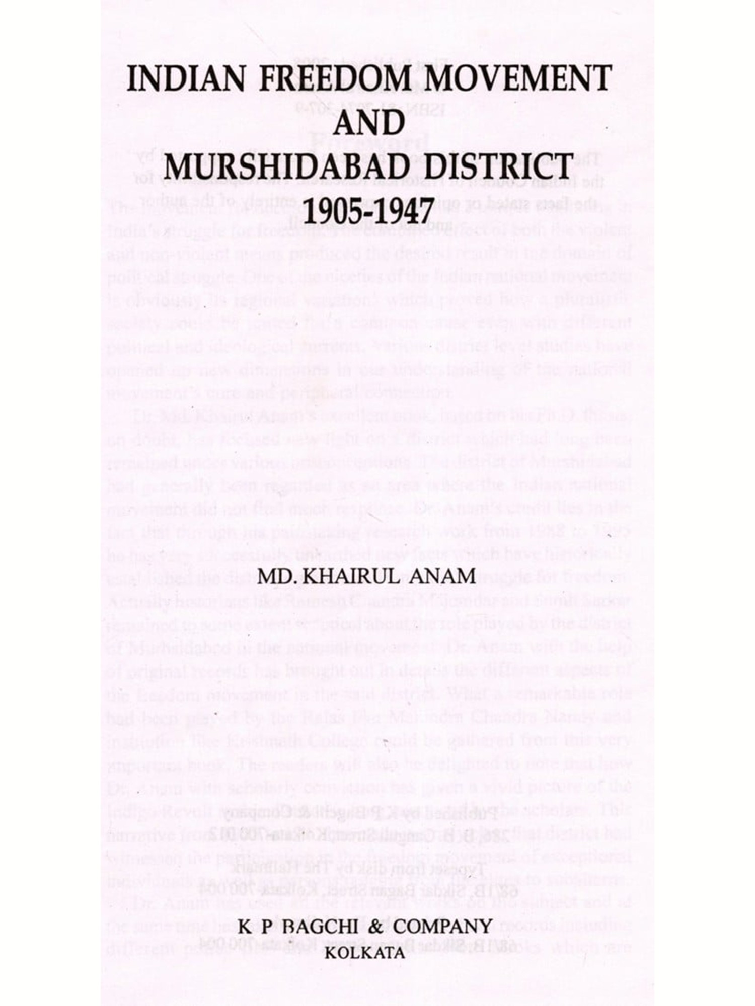 The movement for decolonization in Asia had a unique beginning in India's struggle for freedom. The combined effect of both the violent and non-violent means produced the desired result in the domain of political struggle. One of the niceties of the Indian national movement is obviously its regional variations which proved how a pluralistic society could be united for a common cause even with different political and ideological currents. Various district level studies have opened up new dimensions in our understanding of the national movement's core and peripheral connection. Dr. Md. Khairul Anam's excellent book, based on his Ph.D. thesis, no doubt, has focused new light on a district which had long been remained under various misconceptions. The district of Murshidabad had generally been regarded as an area where the Indian national movement did not find much response. Dr. Anam's credit lies in the fact that through his painstaking research work from 1988 to 1995 he has very successfully unearthed new facts which have historically established the district's glorious role in India's struggle for freedom.