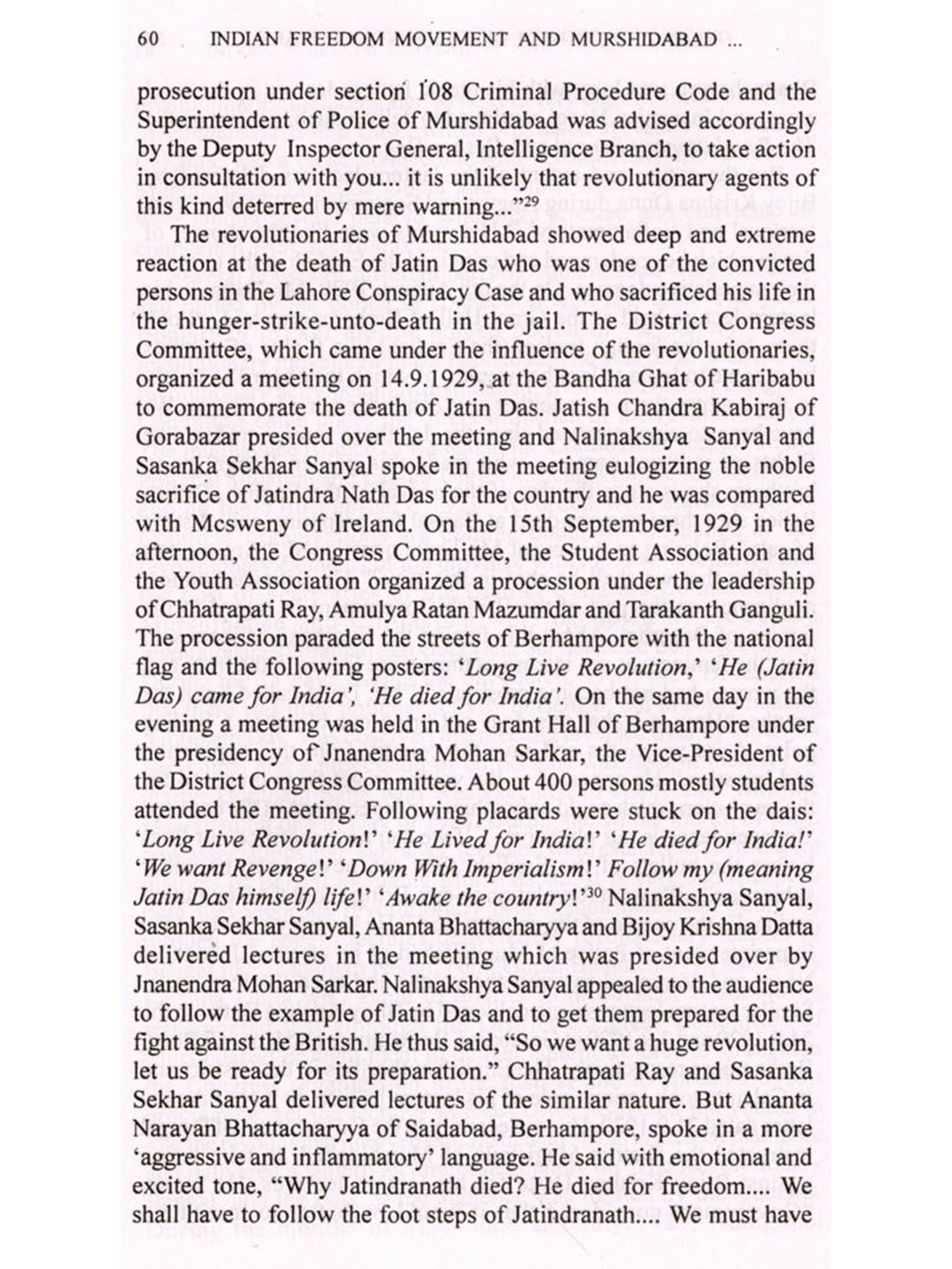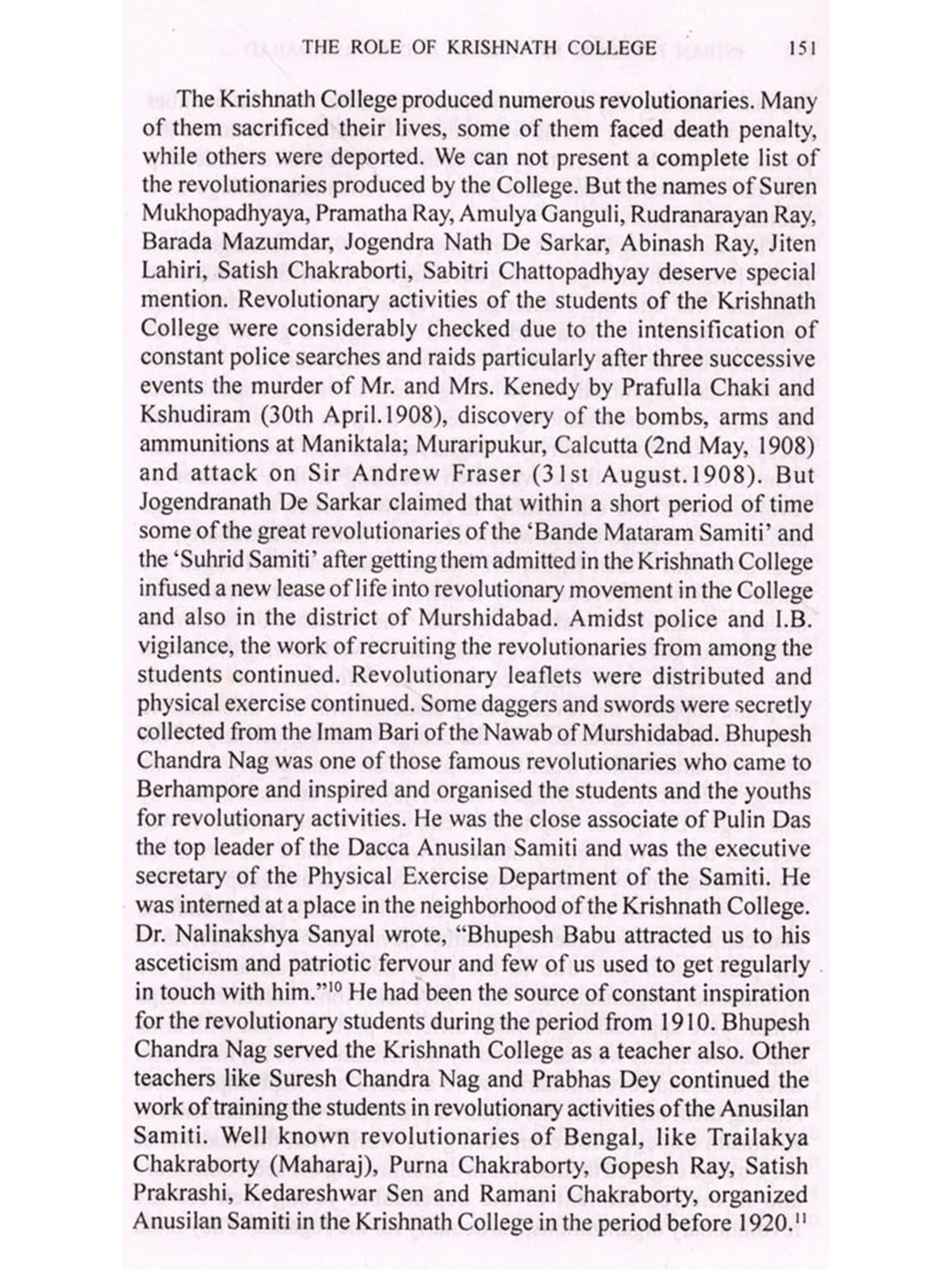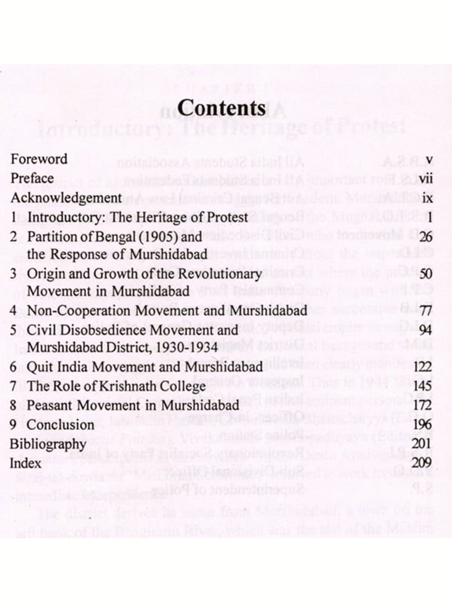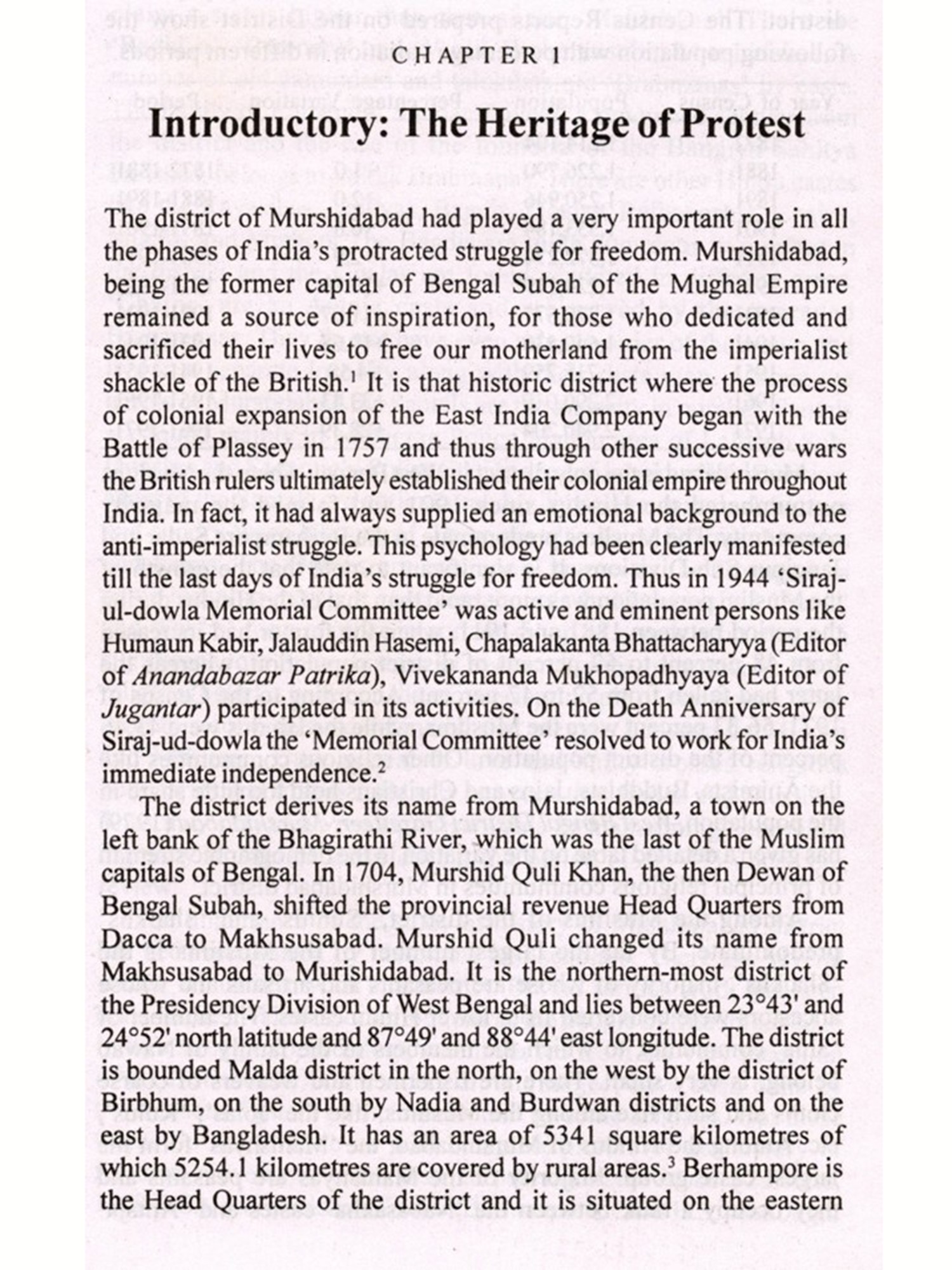 The role of the district of Murshidabad has not unfortunately been duly recognized by our historians. Very little attempt had hitherto been made to examine the aspirations and thoughts of the people of Murshidabad in different phases of our freedom movement. On the contrary, most of the historical writings on Murshidabad have often been dominated by a set idea that as a backward district Murshidabad had no importance in our national liberation struggle. But this book, which is the result of untiring research works of more than seven years, shows that there had been a tremendous impact of the changing political movements of India on the district of Murshidabad. Moreover, I want to present in this book a comprehensive picture of the history of the freedom movement in Murshidabad which was long overdue.