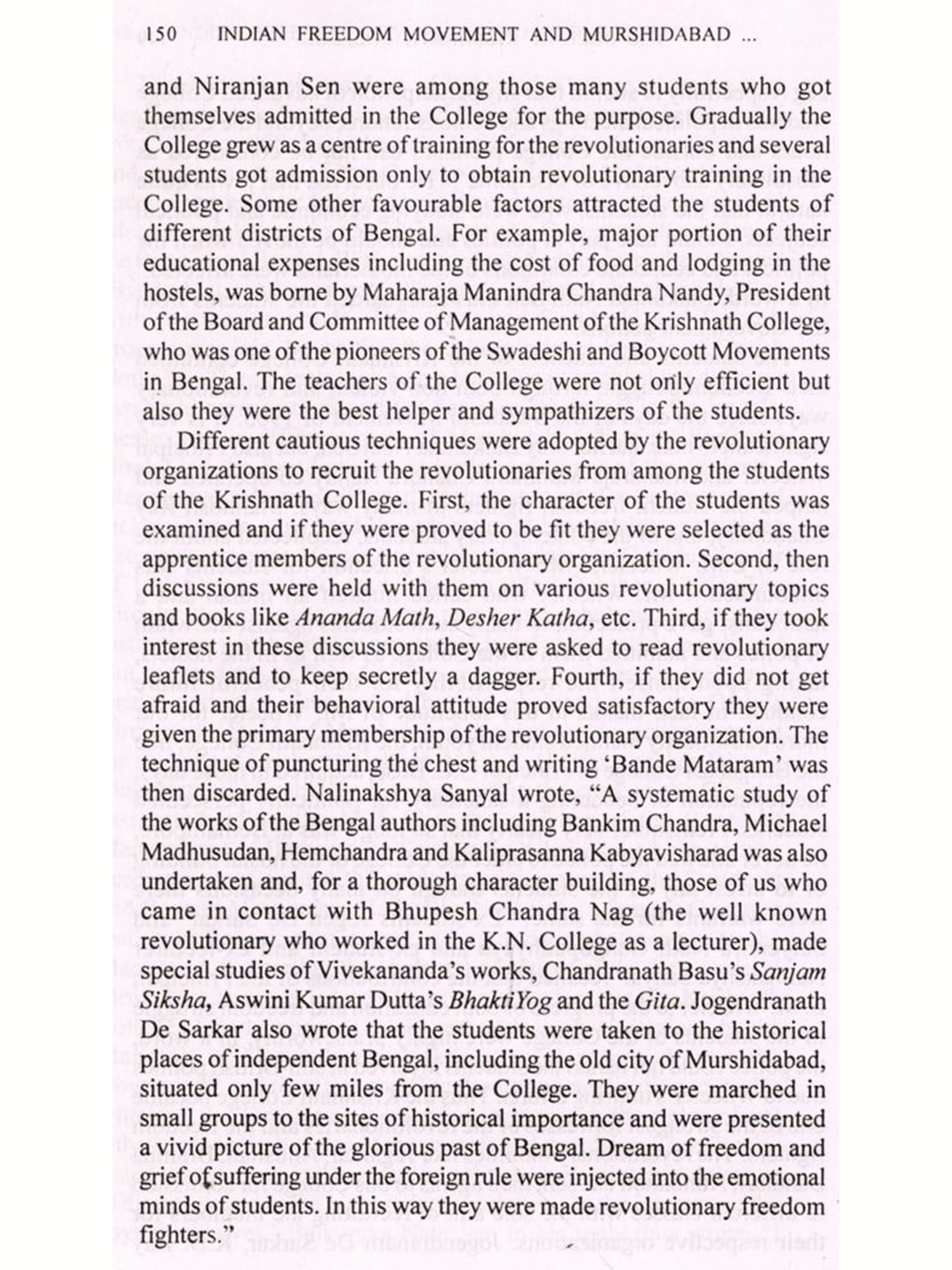 Actually historians like Ramesh Chandra Majumdar and Sumit Sarkar remained to some extent sceptical about the role played by the district of Murhsidabad in the national movement. Dr. Anam with the help of original records has brought out in details the different aspects of the freedom movement in the said district. What a remarkable role had been played by the Rajas like Manindra Chandra Nandy and institution like Krishnath College could be gathered from this very important book. The readers will also be delighted to note that how Dr. Anam with scholarly conviction has given a vivid picture of the Indigo Revolt in this district so long unnoticed by the scholars. This narrative from 1905 to 1947 has made it amply clear that district had witnessed the participation in the freedom movement of exceptional individuals as well as persons ranging from the elites to subalterns.