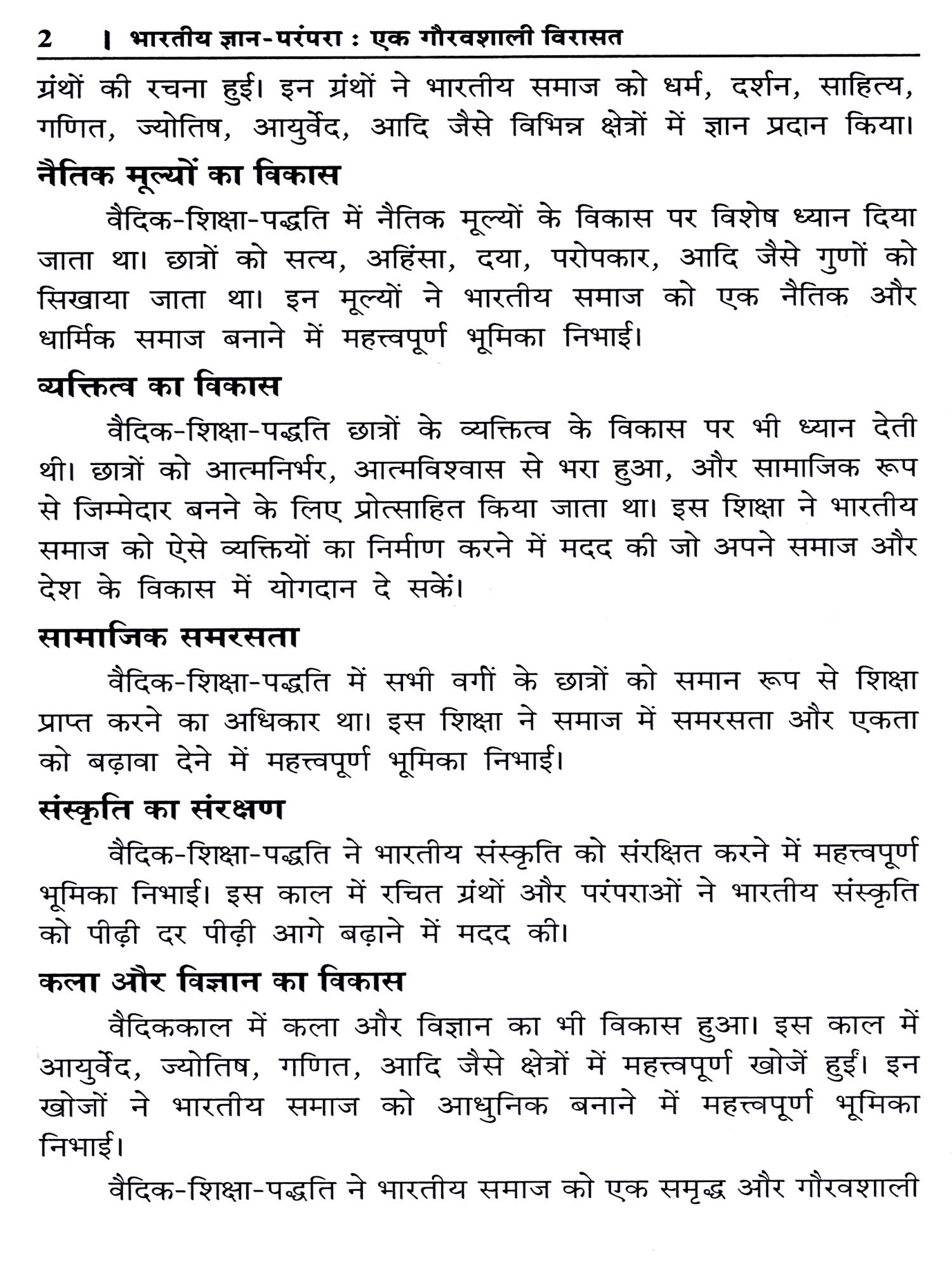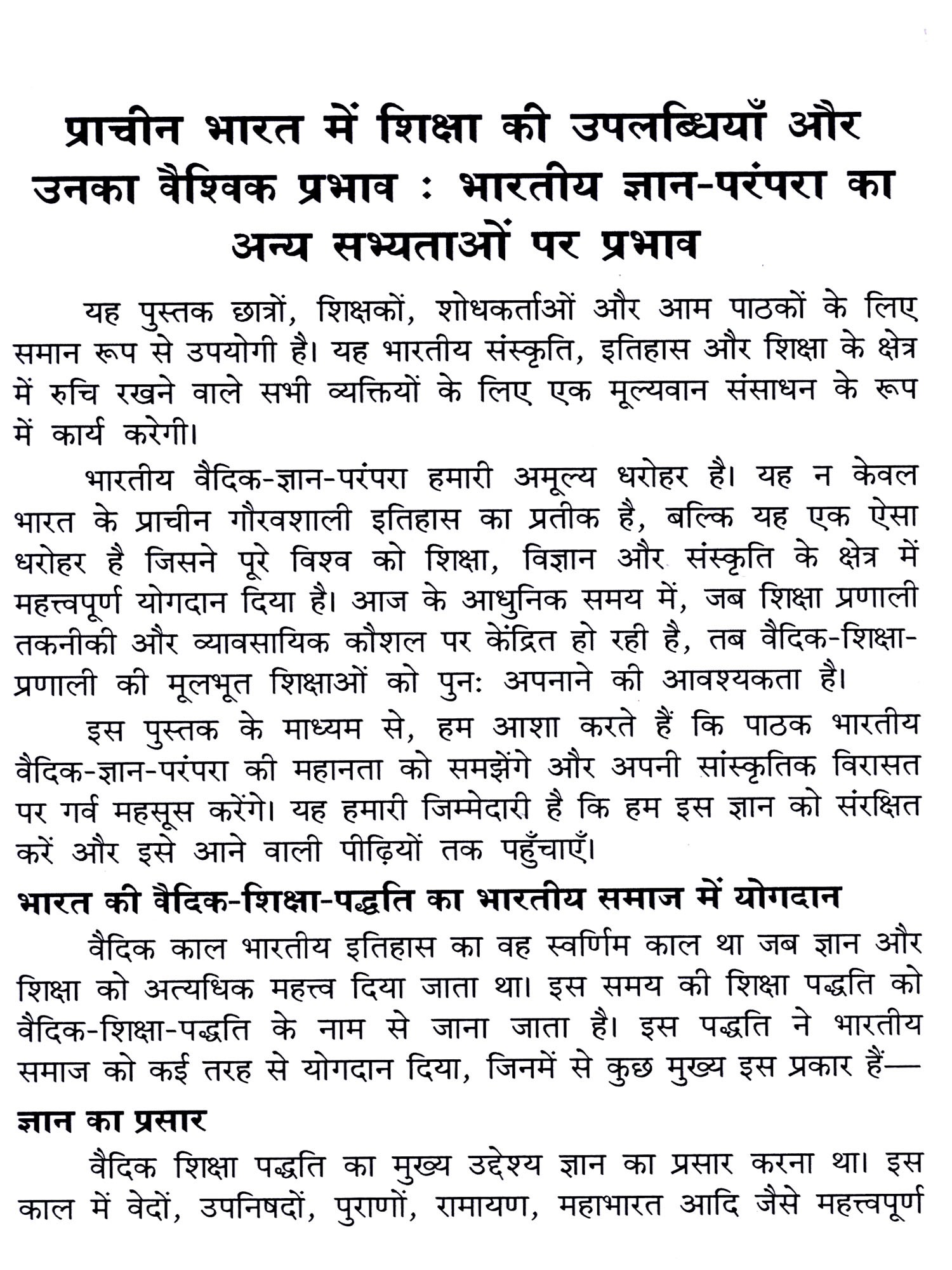 प्राचीन भारत में शिक्षा की पद्धति गुरुकुल प्रणाली पर आधारित थी। गुरुकुलों में विद्यार्थी ब्रह्मचर्य व्रत का पालन करते हुए वेदों, उपनिषदों, धर्मशास्त्रों और अन्य शास्त्रों का अध्ययन करते थे। यह शिक्षाप्रणाली केवल पुस्तकीय ज्ञान तक सीमित नहीं थी, बल्कि इसमें नैतिकता, अनुशासन, आत्मनिर्भरता और समाज सेवा का भी विशेष महत्त्व था। विद्यार्थी न केवल विद्वान् बनते थे, बल्कि वे समाज में नेतृत्व प्रदान करने में सक्षम होते थे। आज जब हम आधुनिक शिक्षाप्रणाली की ओर देख रहे हैं, तो यह आवश्यक हो जाता है कि हम अपनी प्राचीन वैदिक-शिक्षा-प्रणाली और ज्ञान-परम्परा को समझें और उसकी प्रासंगिकता को स्वीकार करें। भारतीय वैदिक ज्ञान परम्परा न केवल भारत के बौद्धिक उत्थान का प्रमाण है, बल्कि यह विश्व को एक समृद्ध दार्शनिक और वैज्ञानिक दृष्टिकोण प्रदान करने में भी सहायक रही है।