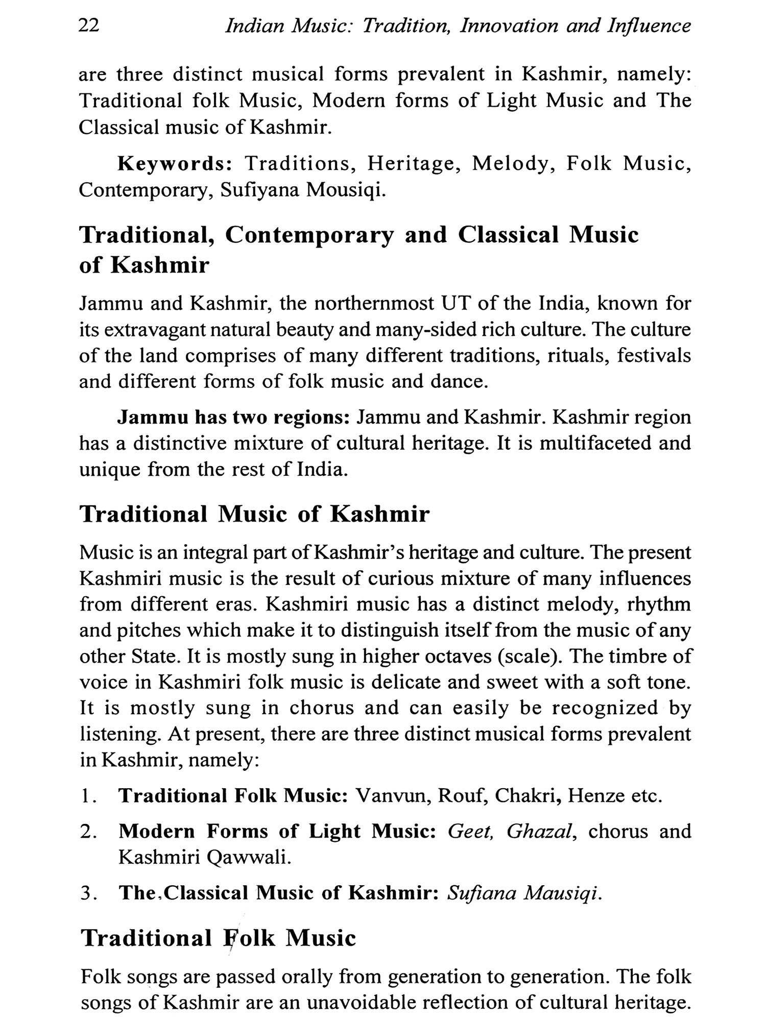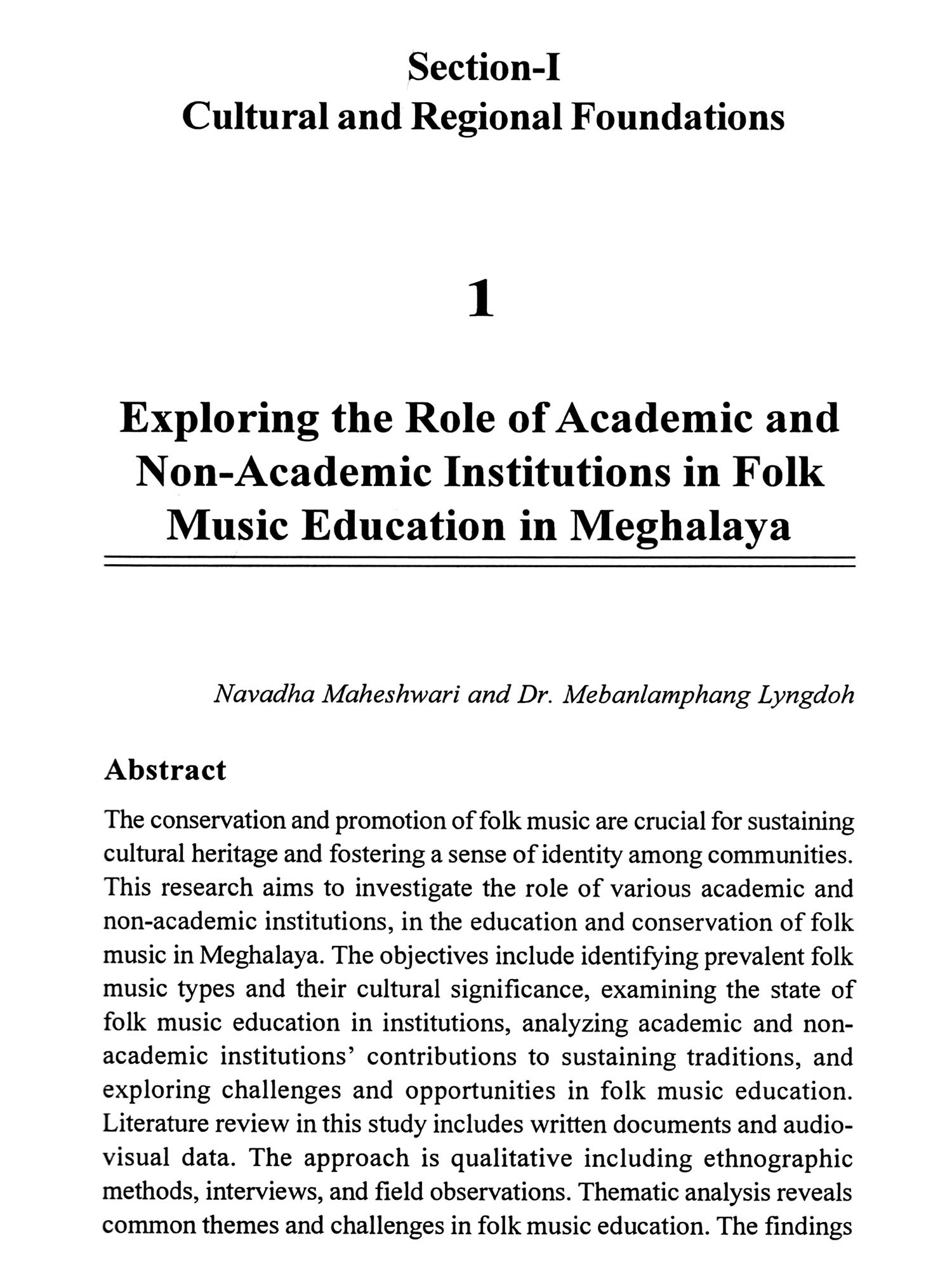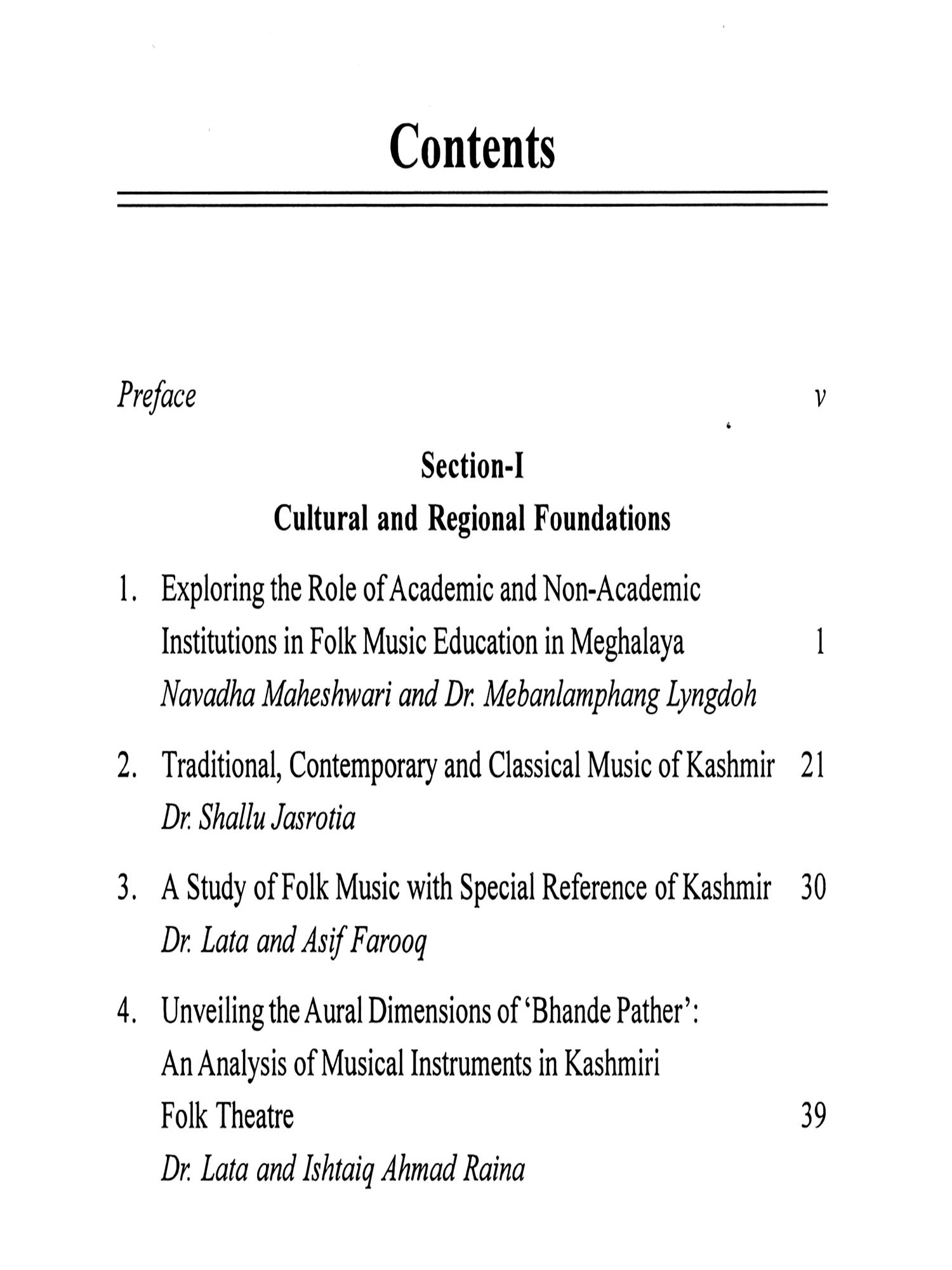 Section I: Cultural and Regional Foundations begins with a study of academic and non-academic institutions in Meghalaya, highlighting their role in preserving indigenous folk traditions through curricular and infrastructural reforms. The musical mosaic of Kashmir is richly represented in two chapters-one capturing the interrelationship between traditional, contemporary, and classical styles, and the other offering a detailed ethnographic lens on Kashmiri folk music. This section culminates in a nuanced exploration of Bhand Pather, analyzing the instrumentation of this unique Kashmiri folk theatre form to unveil its layered aural dimensions.