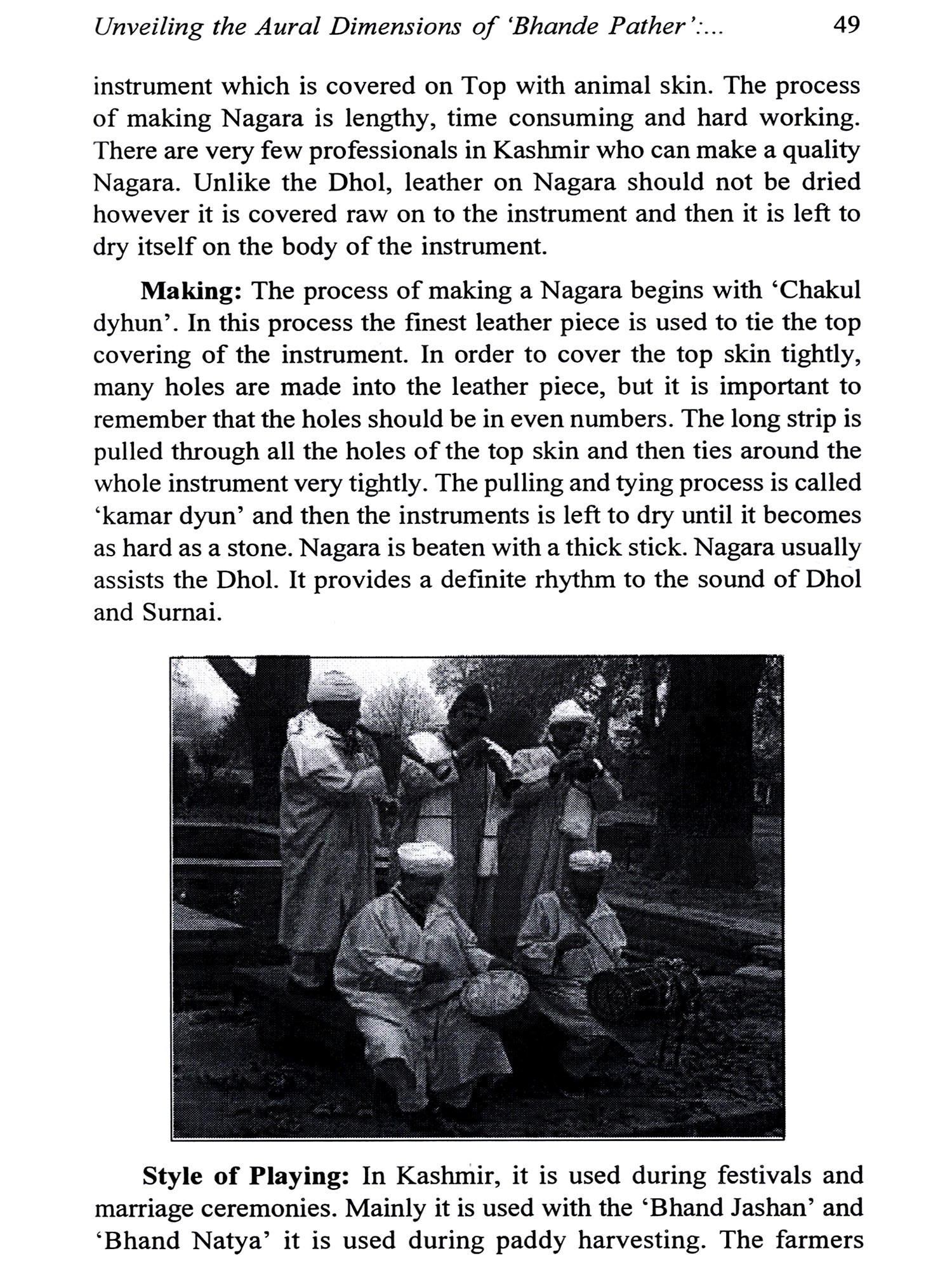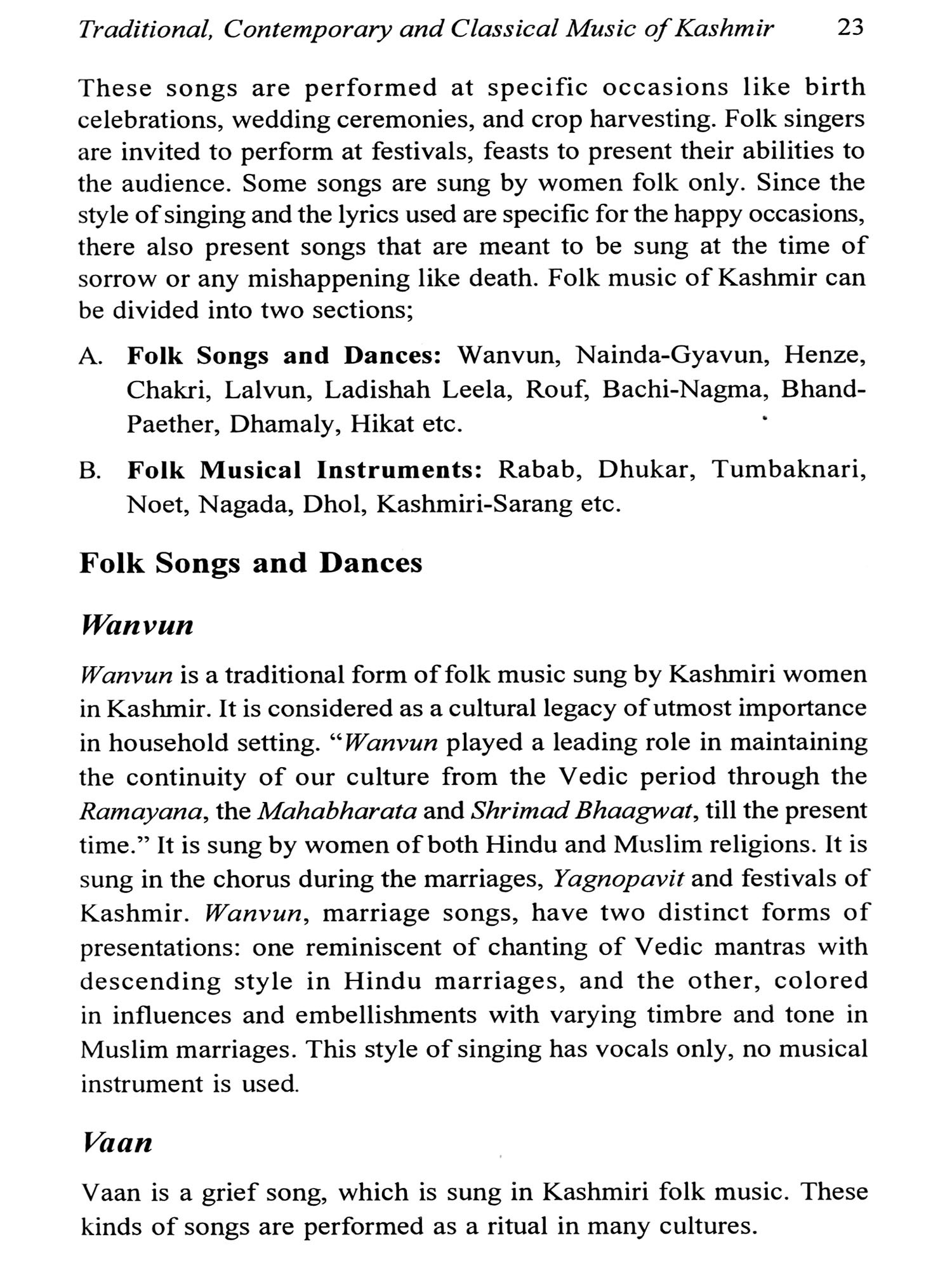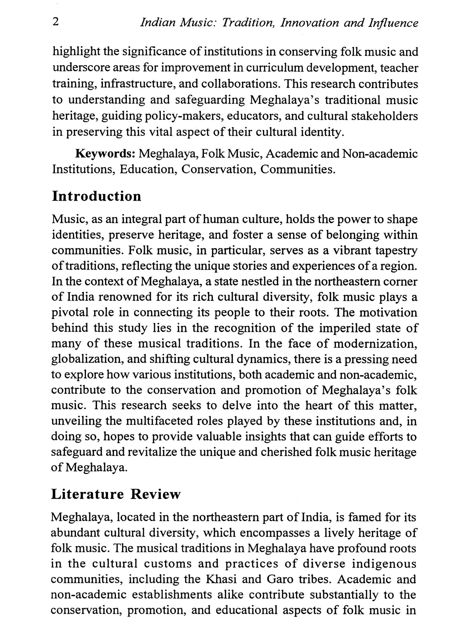 Section I: Cultural and Regional Foundations begins with a study of academic and non-academic institutions in Meghalaya, highlighting their role in preserving indigenous folk traditions through curricular and infrastructural reforms. The musical mosaic of Kashmir is richly represented in two chapters-one capturing the interrelationship between traditional, contemporary, and classical styles, and the other offering a detailed ethnographic lens on Kashmiri folk music. This section culminates in a nuanced exploration of Bhand Pather, analyzing the instrumentation of this unique Kashmiri folk theatre form to unveil its layered aural dimensions.