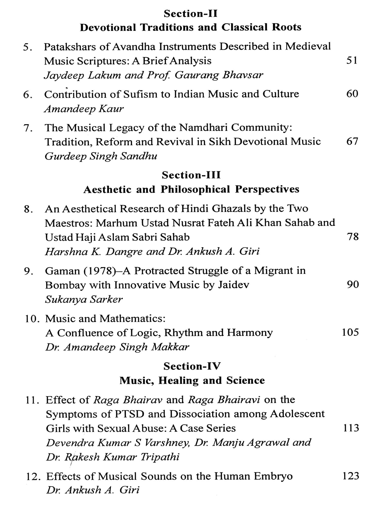 Section II: Devotional Traditions and Classical Roots delves into India's sacred musical lineages. It features an analysis of patakshars from medieval musical texts as applied to Avandha percussion instruments, underscoring the codified rhythmic knowledge of ancient times. Another chapter traces the spiritual and cultural contributions of Sufism to Indian music, especially through devotional genres like qawwali. The final contribution in this section examines the musical legacy of the Namdhari Sikh community, focusing on their disciplined pedagogy, liturgical formats, and resistance to colonial influences, all while upholding the purity of raga traditions.