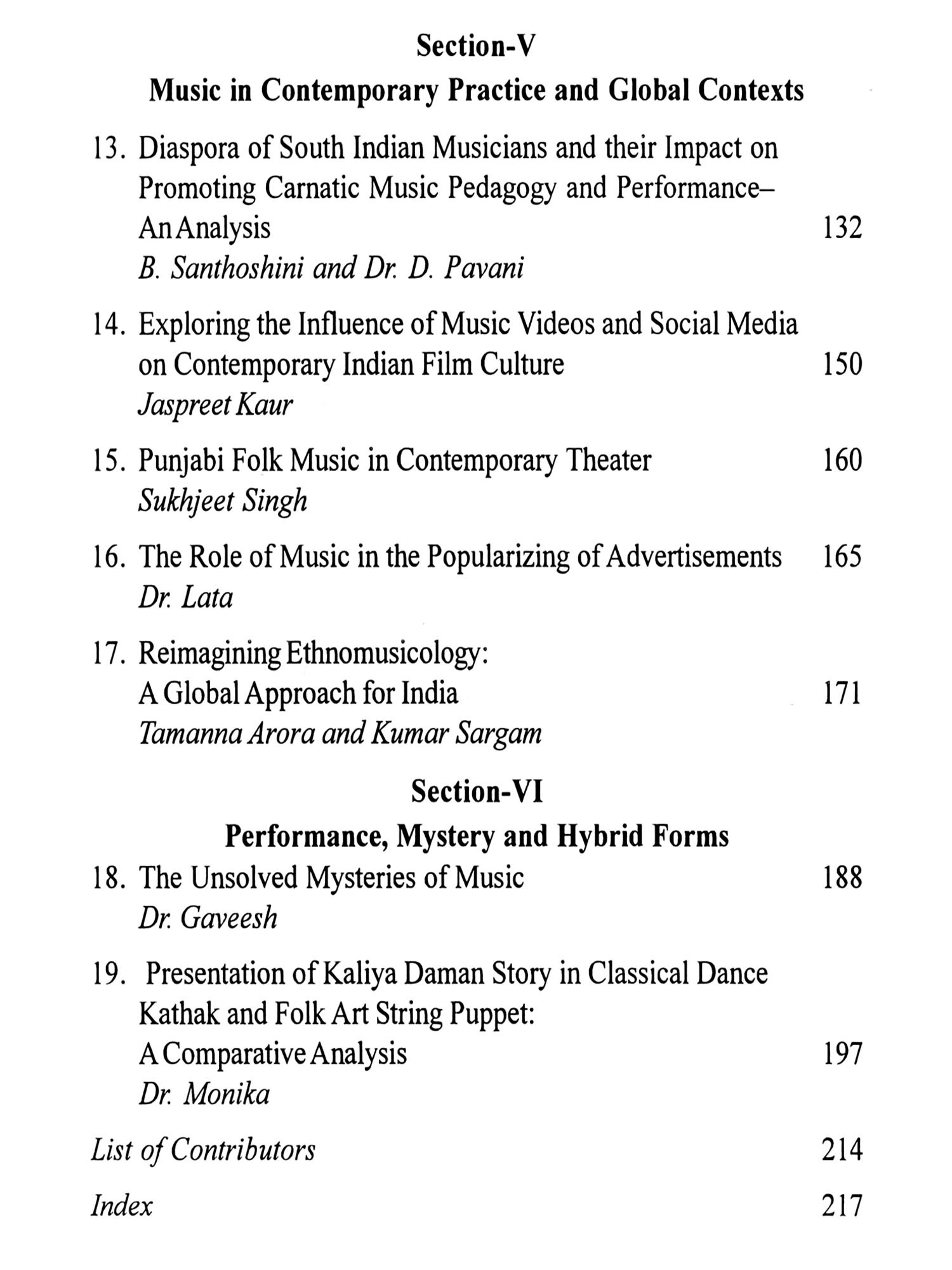 explores the fusion of tradition and innovation in performative arts. One chapter delves into the metaphysical and unresolved enigmas of musical perception and cognition, inviting readers into the mystical terrain of sonic inquiry. Another presents a comparative analysis of the Kaliya Daman story as portrayed in classical Kathak and folk string puppetry, highlighting how narrative, movement, and music collaborate across genres to convey mythology.