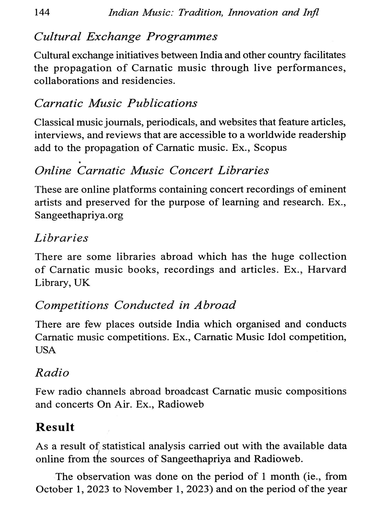 Together, these chapters affirm that Indian music is a dynamic confluence of sacred tradition and contemporary expression sustained through education, performance, community, and critical inquiry. This volume aspires to contribute meaningfully to the discourse on Indian musicology and serve as a reference for scholars, practitioners, educators, and culturally curious readers alike.