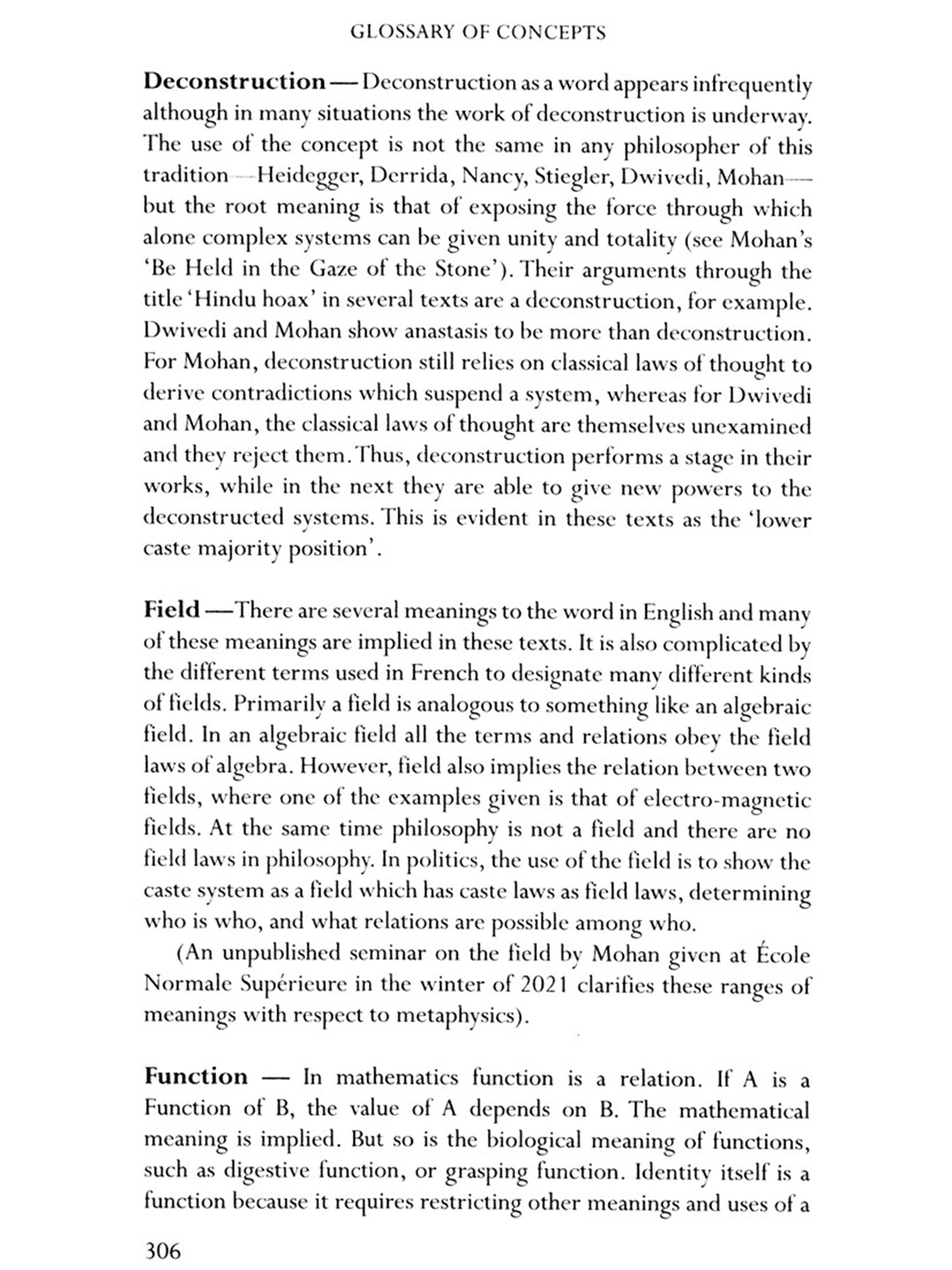 Mohan and Dwivedi are the most well-known philosophers of their generation and belong to the tradition or 'the bastard family' of deconstruction. They developed their philosophical contributions in the intimate friendships with Jean-Luc Nancy and Bernard Stiegler (it was Stiegler who, in fact, introduced me to them both many years ago), both of whom in turn were friends of the renowned inventor/discoverer of the project of deconstruction in the history of philosophy, Jacques Derrida, who used to refer to them as 'post-deconstructive' thinkers. That is how Dwivedi and Mohan have come to be known outside of India as the philosophical heirs to a tradition which begins at least from Husserl. When philosophers write about anything whatsoever their reflections are grounded in their philosophical intuitions and projects such that everything is philosophical.