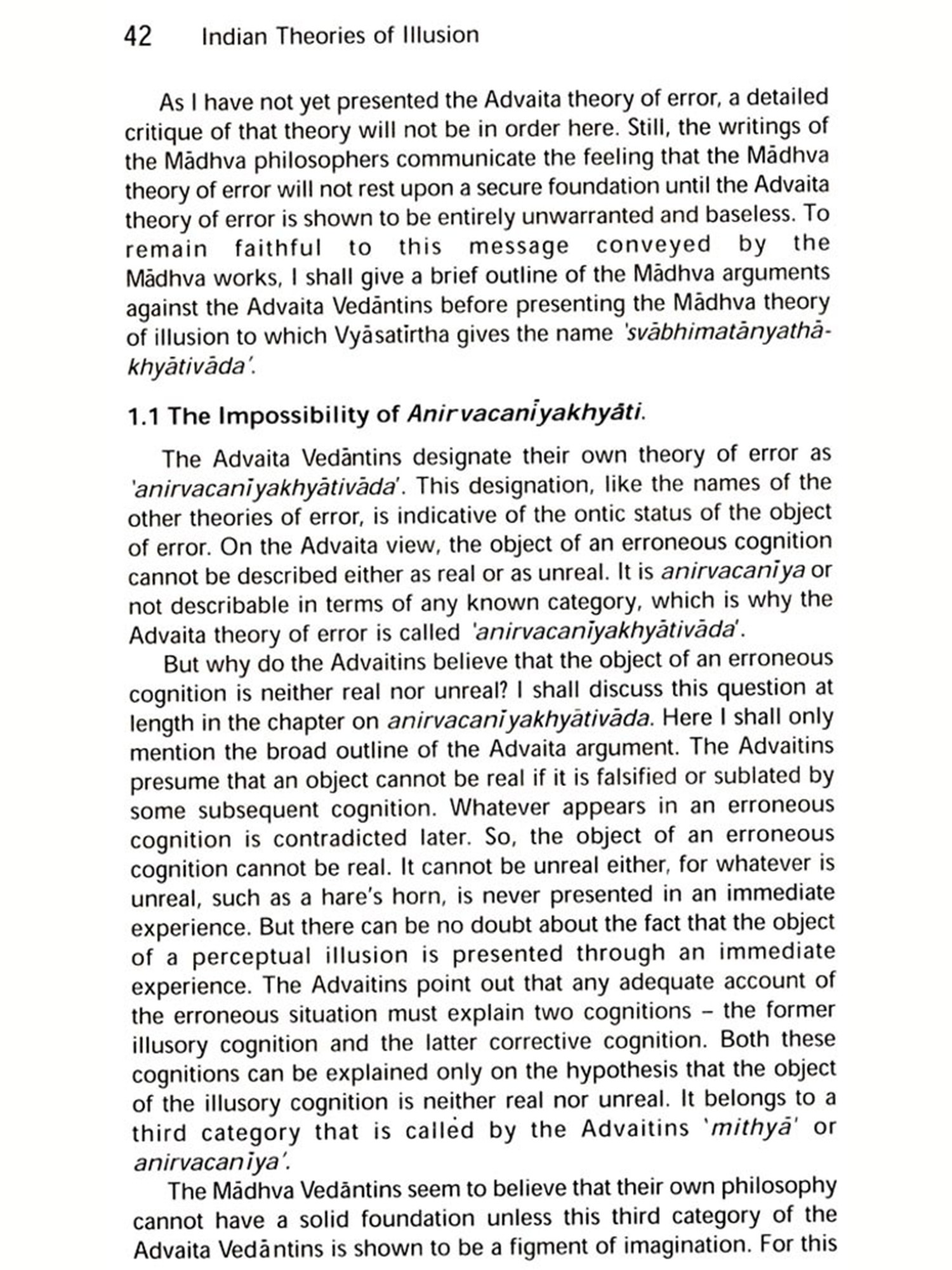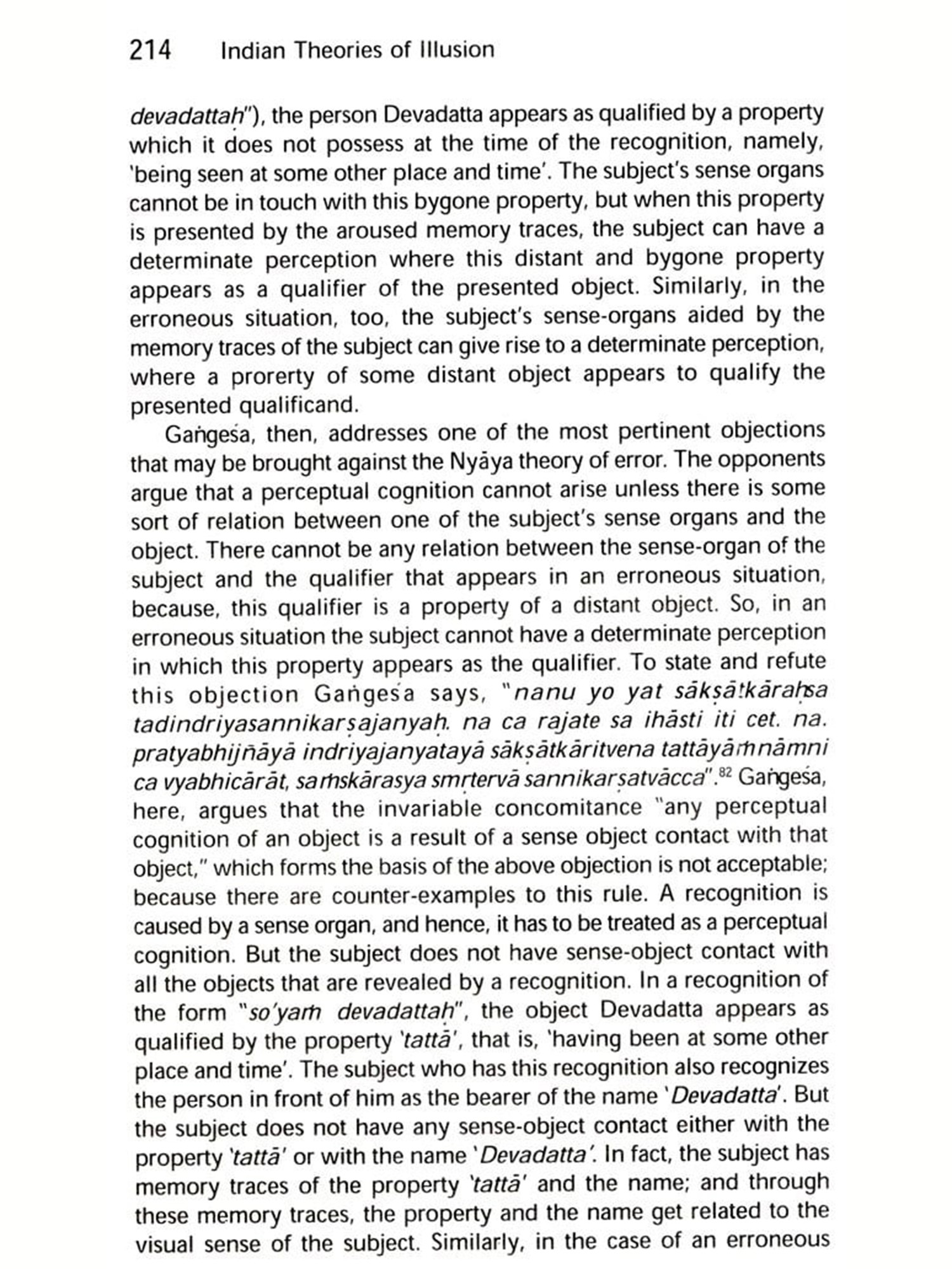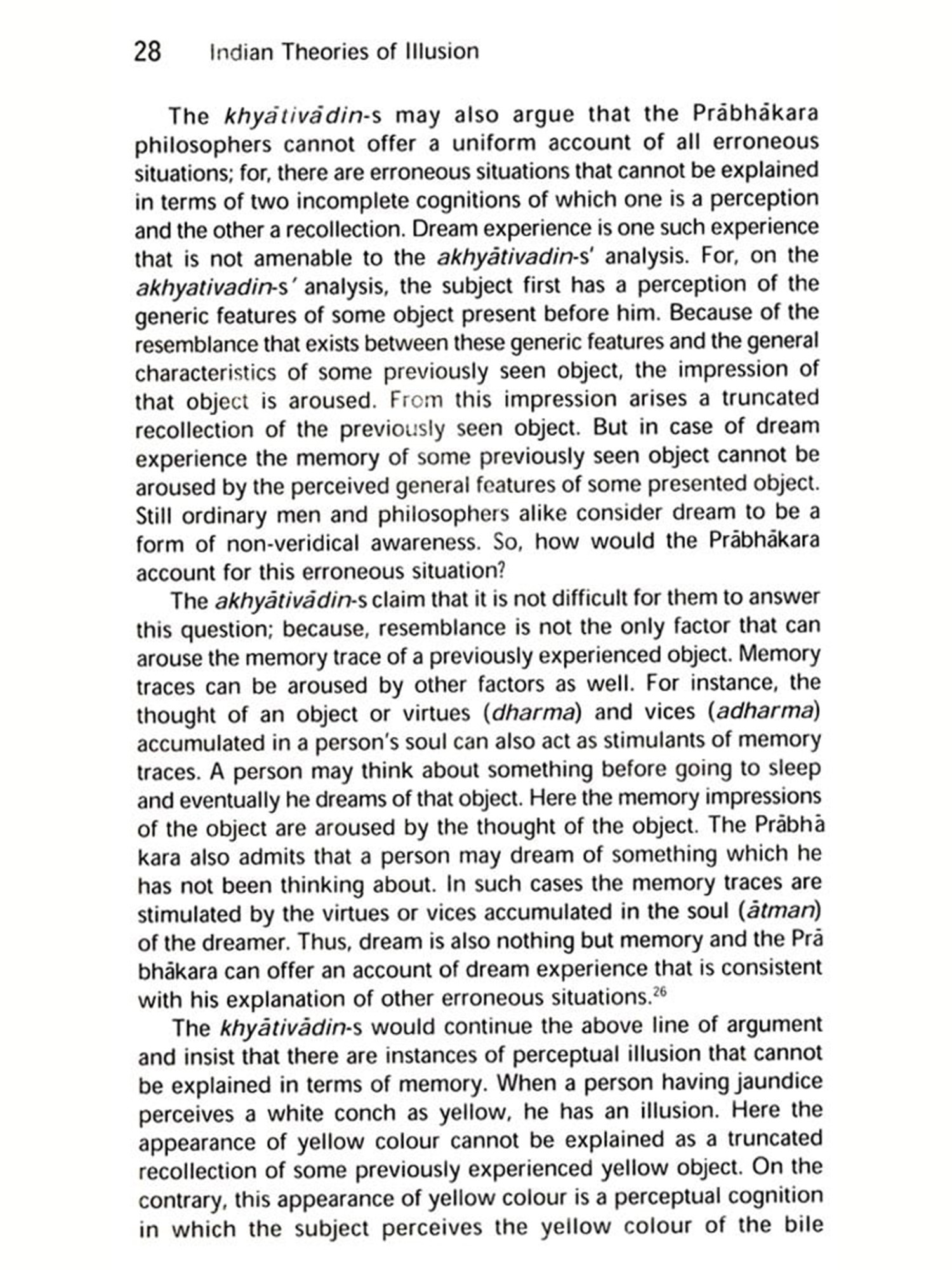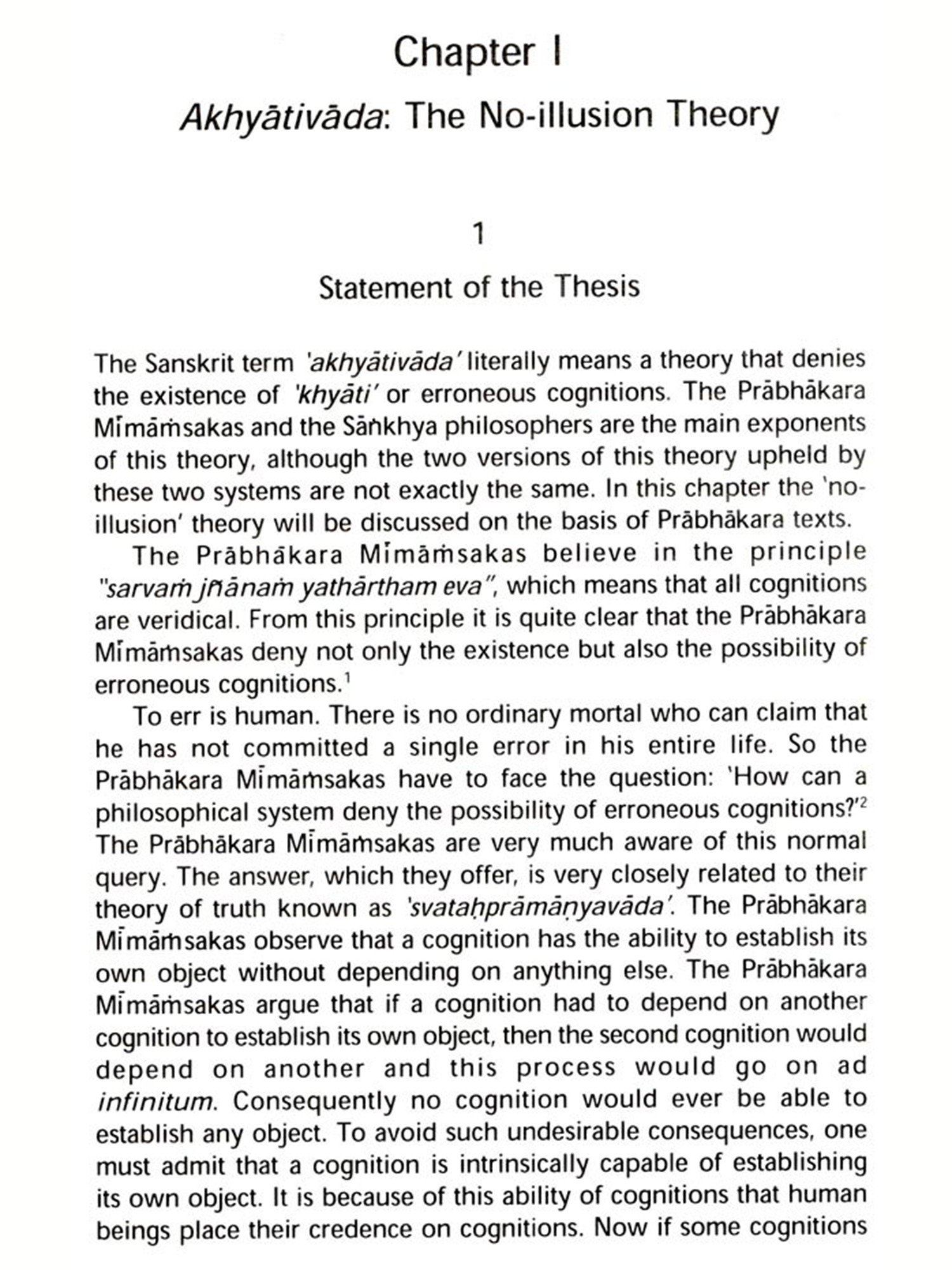 The present work is an attempt to review these ancient Indian theories of error. Although perceptual illusions and hallucinations will be my main concern, I shall refer to other varieties of error whenever it will be necessary to point out the difference between the perceptual and the non-perceptual varieties of erroneous cognition.