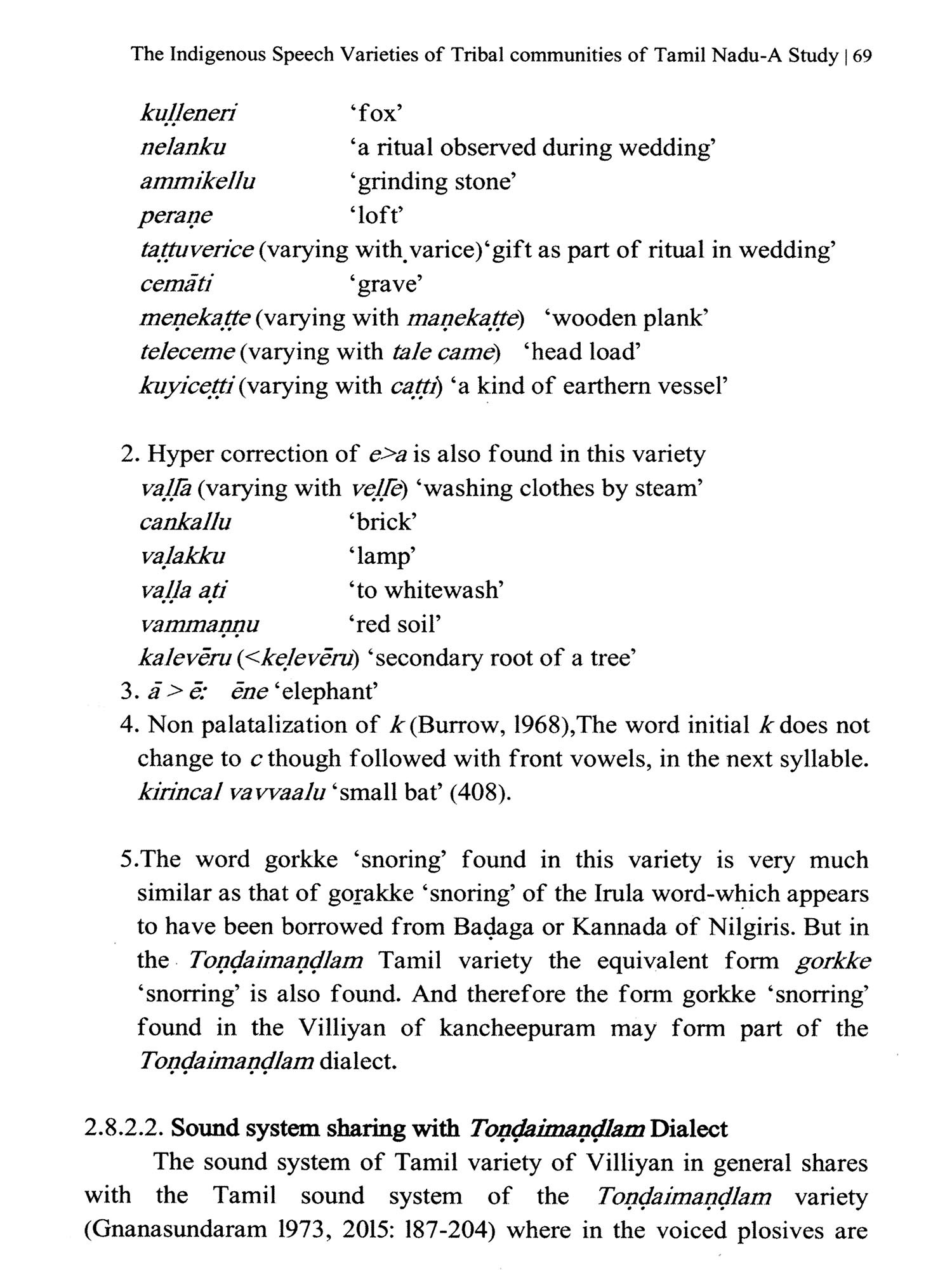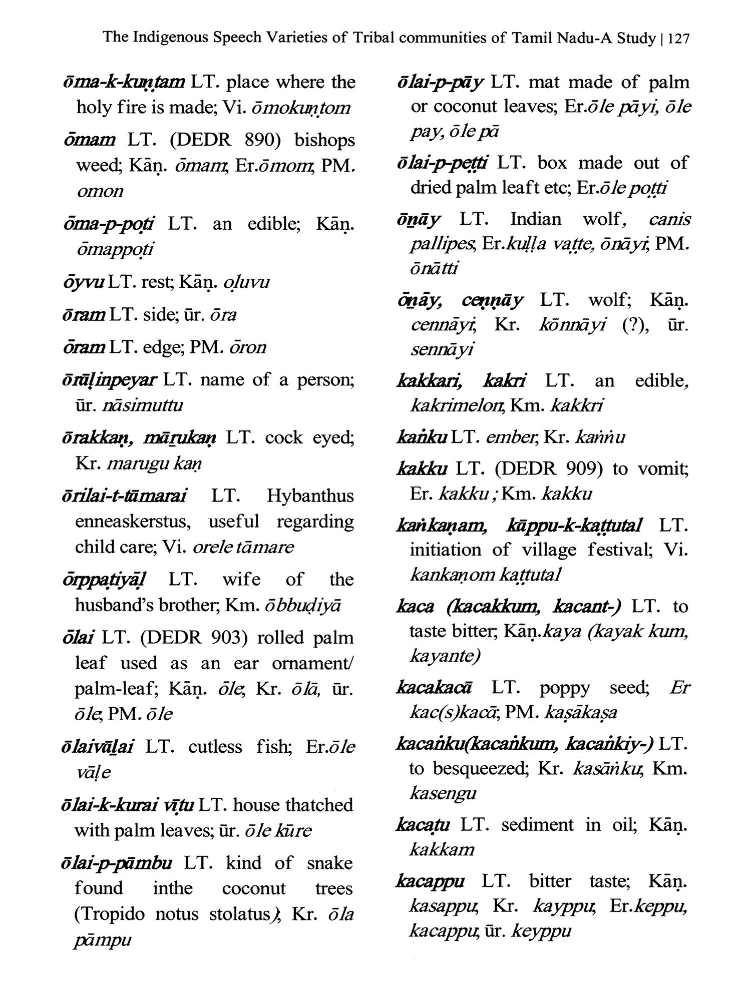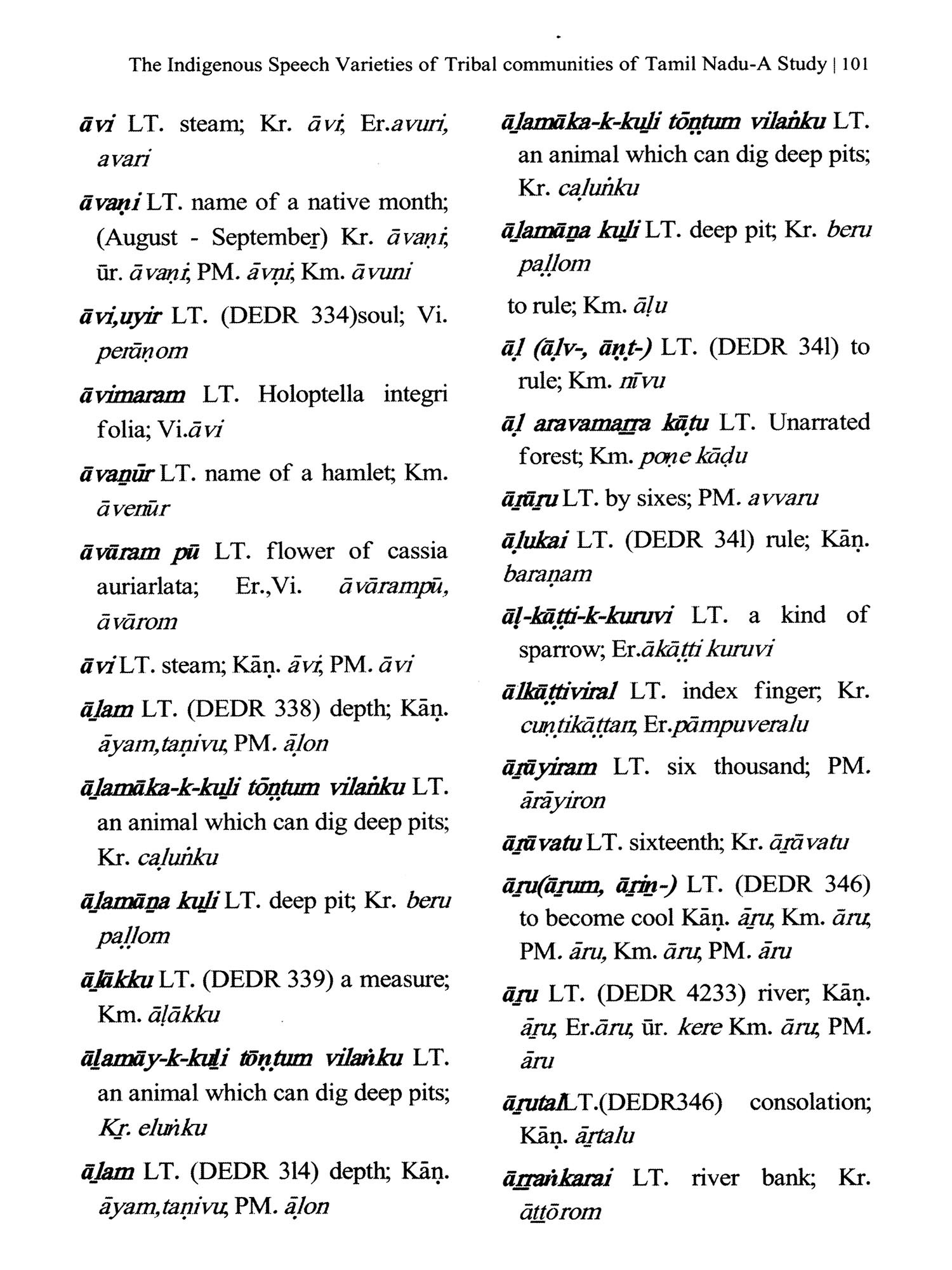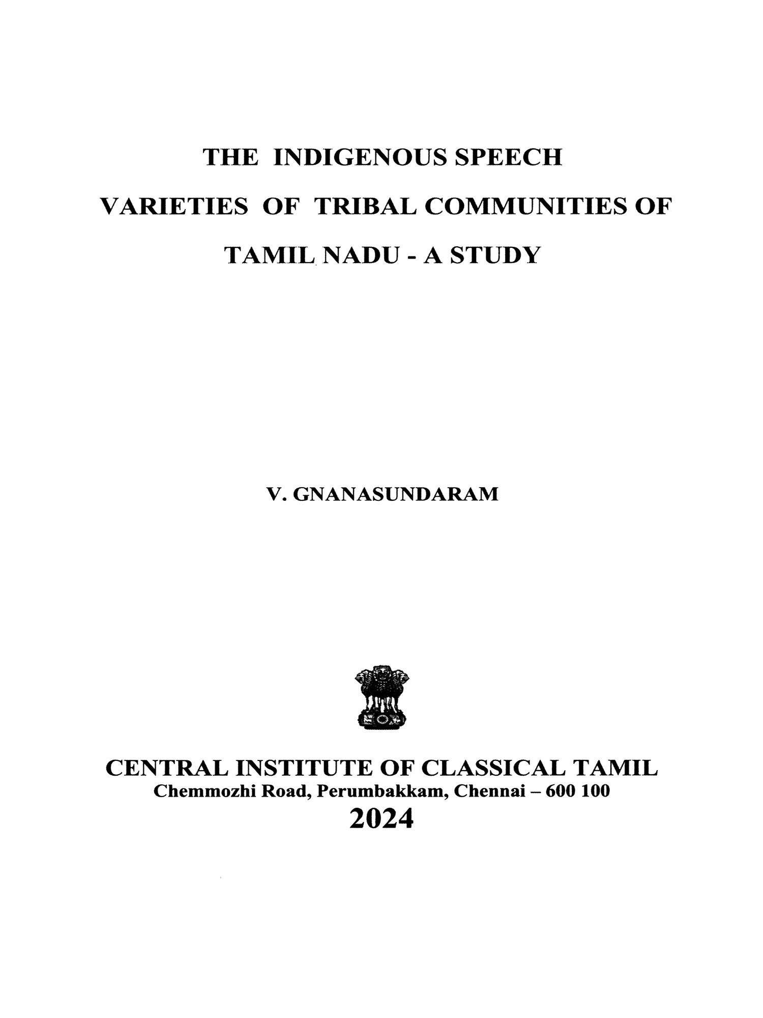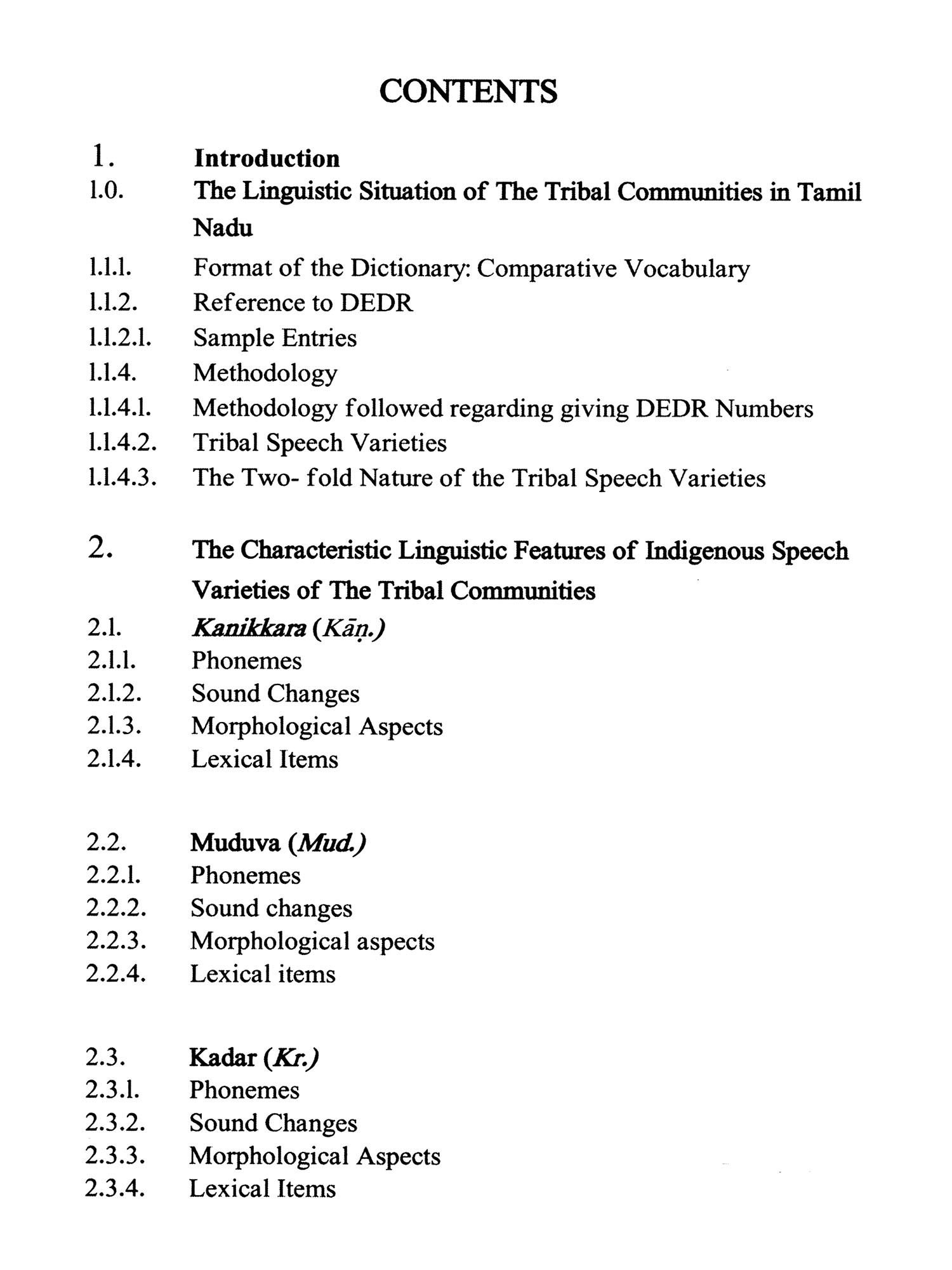The Indigenous Speech varieties of Tribal Communities of Tamil Nadu-A Study, in a way is a compilation of a Dictionary, comprising of the forms of eight indigenous tribal speech varieties spoken in Tamil Nadu. Following the model of Dravidian Etymological Dictionary (DED), the indigenous Tribal language forms, lexical as well grammatical, are chosen on the basis of similarities in form and meaning and presented in a linear order, with the Literary Tamil form as the head word, followed with its number in DED, provided the literary Tamil Form finds its occurrence in DED. Out of the 37 Tribal communities, one can identify broadly, two different sets on the basis of the mother tongue, they speak. One: The communities whose speech is an independent, indigenous tribal mother tongue such as Irula, Kattunayaka, Kota, Betta Kurumba (with other varieties), Paniya, Sholiga, Toda etc. Two: The other Tribal communities such as Adiyan, Irular known as Villiyan in Kancheepuram, Tiruvallur, Malayali with other subgroups etc., speak one or the other variety of Tamil as their mother tongue. From this view point, which is synchronic in nature, there are indigenous tribal varieties that form part of the Tamil dialects and there are indigenous tribal speech varieties that do not form part of Tamil dialects.