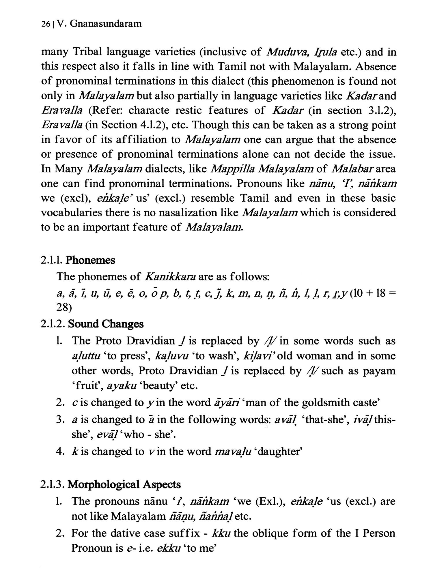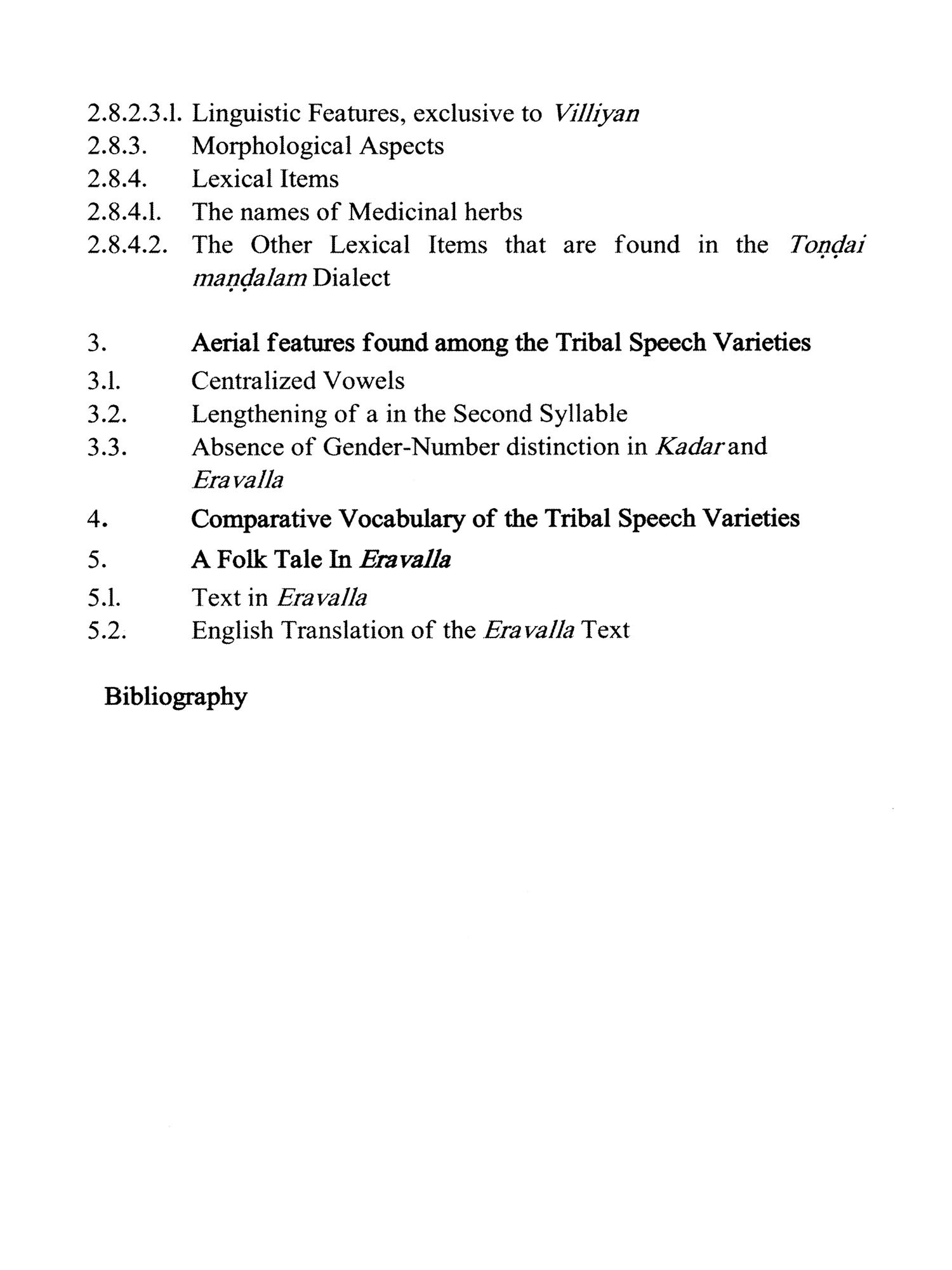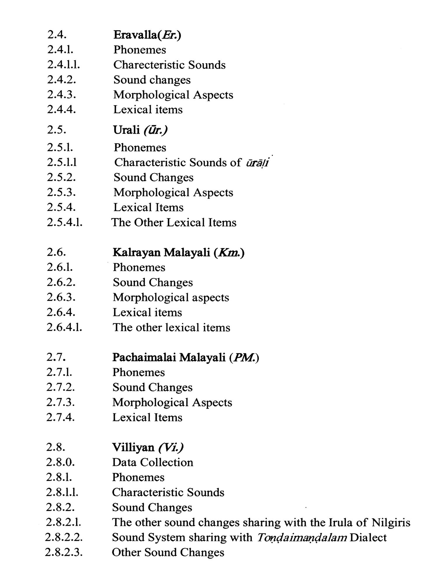 This work has been compiled by the author, viz. Dr. V. Gnanasundaram, keeping in view, the following objectives in mind: (1) The lexical and grammatical forms that appear to be not found in any other Dravidian Languages may draw one's attention, so as to be included in DED, when DED is undertaken for further revision; (2) On the basis of sample data provided in this work, other related studies such as 'Aerial Studies' etc., especially in the 'Nilgiris Biosphere Reseve' may be taken up, as there is ample scope to take up such studies that are related to historical linguistics. I hope, the work presented here may stimulate the other researchers in this field to take up similar works wherein the other left over indigenous tribal speeches, spoken in Tamil Nadu and elsewhere be taken up. In this context, I congrajulate the author of this work and as well the other linguists, especially the Linguists of CAS in Linguistics, Annamalai University, whose descriptive grammars in the indigenous tribal speeches of Tamil Nadu helped very much for the preset study.