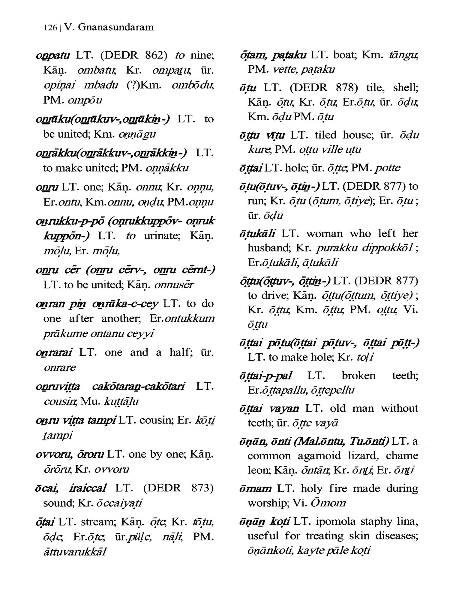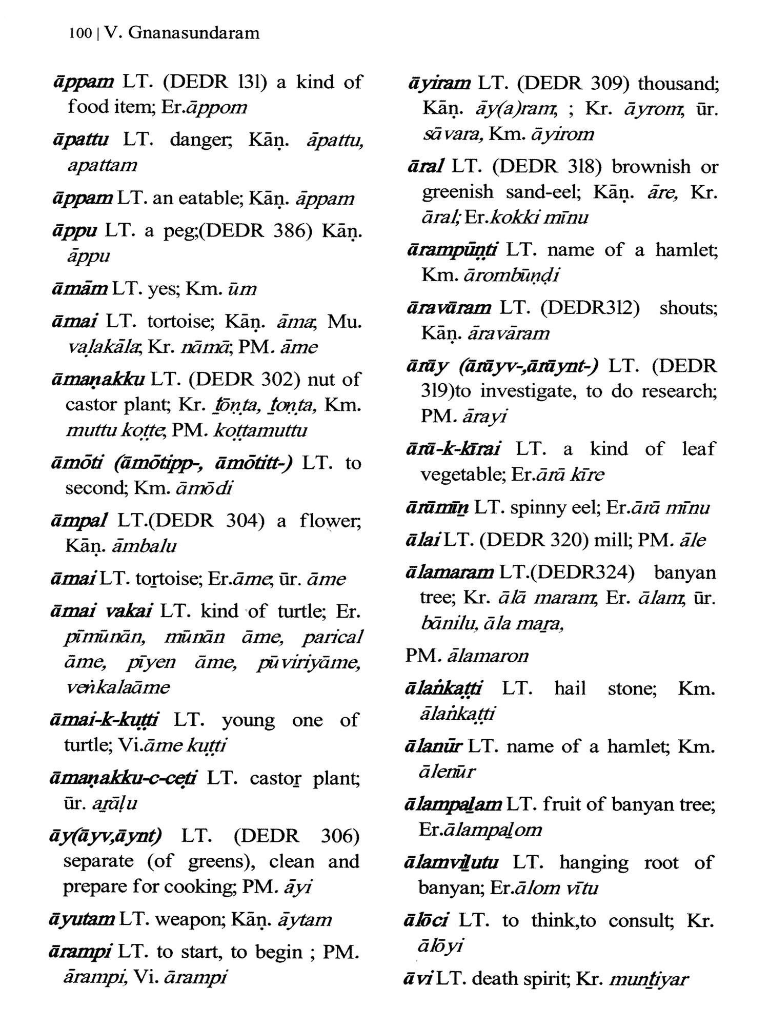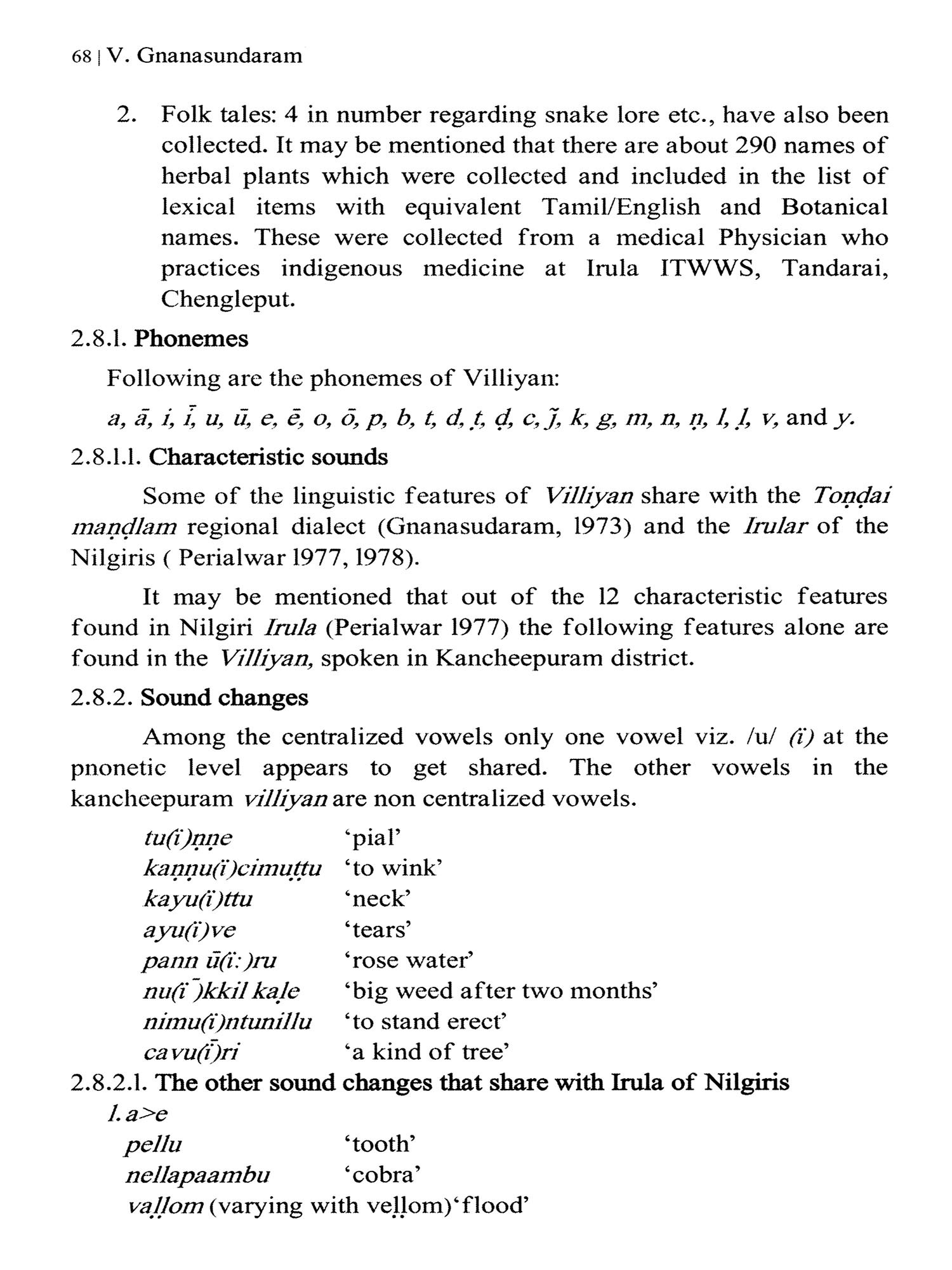This work has been compiled by the author, viz. Dr. V. Gnanasundaram, keeping in view, the following objectives in mind: (1) The lexical and grammatical forms that appear to be not found in any other Dravidian Languages may draw one's attention, so as to be included in DED, when DED is undertaken for further revision; (2) On the basis of sample data provided in this work, other related studies such as 'Aerial Studies' etc., especially in the 'Nilgiris Biosphere Reseve' may be taken up, as there is ample scope to take up such studies that are related to historical linguistics. I hope, the work presented here may stimulate the other researchers in this field to take up similar works wherein the other left over indigenous tribal speeches, spoken in Tamil Nadu and elsewhere be taken up. In this context, I congrajulate the author of this work and as well the other linguists, especially the Linguists of CAS in Linguistics, Annamalai University, whose descriptive grammars in the indigenous tribal speeches of Tamil Nadu helped very much for the preset study.