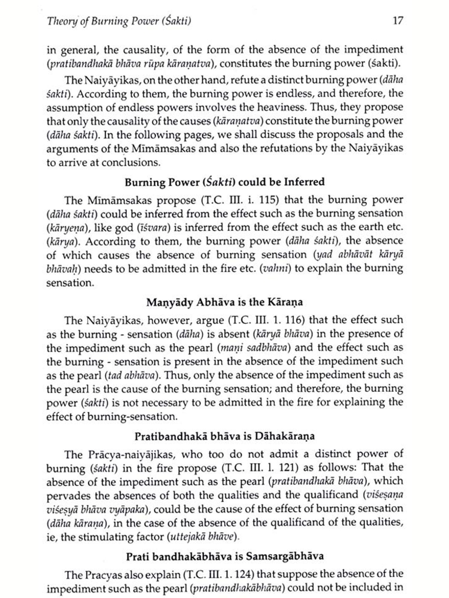 The book "Inference of god also establishes that the separate category of burning power (daha sakti) need not be admitted as the same burning power amounts to only the causality of the cause of fire. (karanatva).