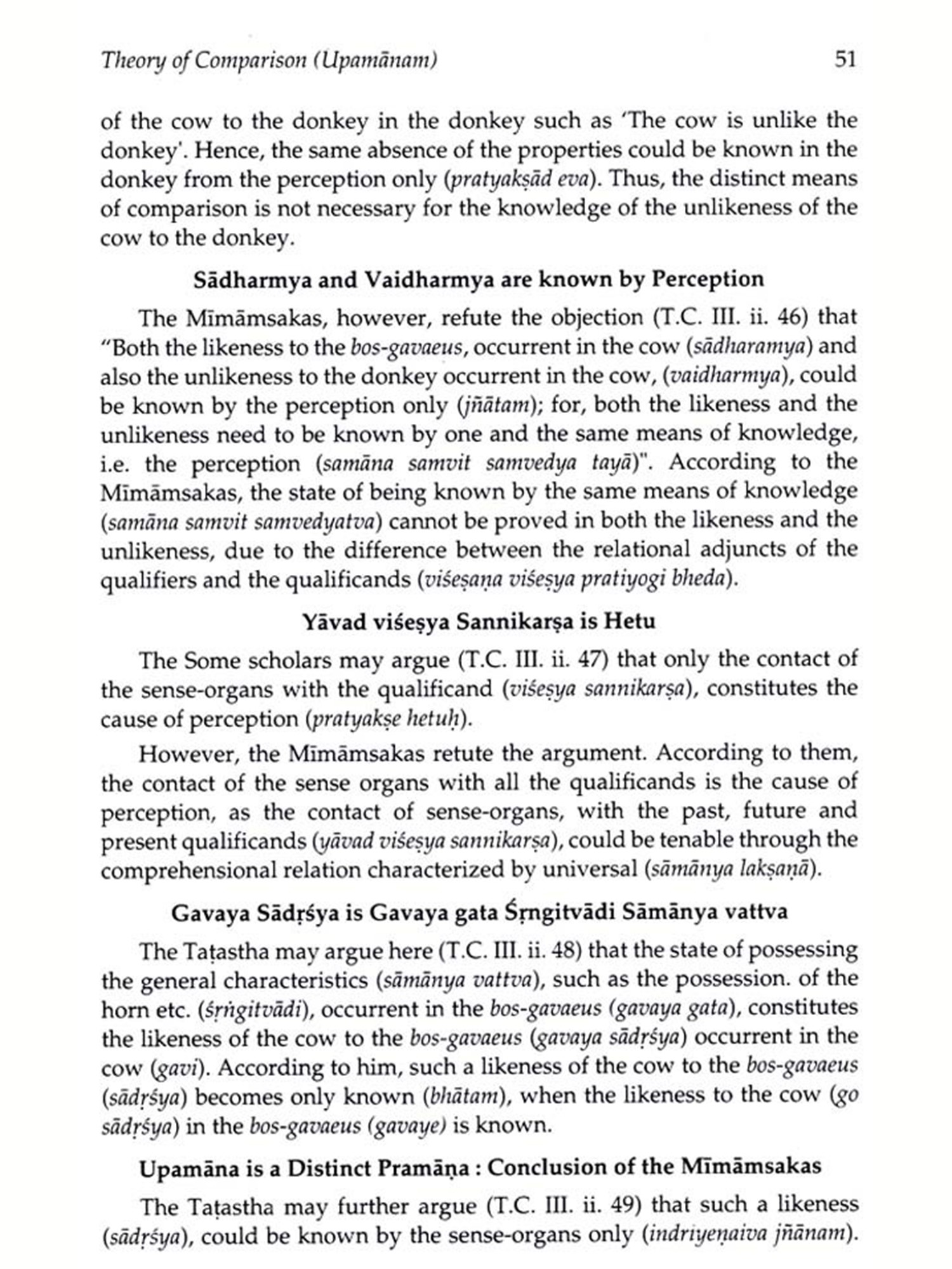 Also, the book 'Comparison' establishes the Pracya-nyāya position that the knowledge of the likeness, associated with the recollection of the meaning of the instructive analogical statement (atidesa vakyartha smarana), ie. comparison (upamana), produces the knowledge of the distinction of the particular cause of the use of the word 'bos-gavaeus', ie, the bos-gavaeusness (pravrtti nimitta visesa) .