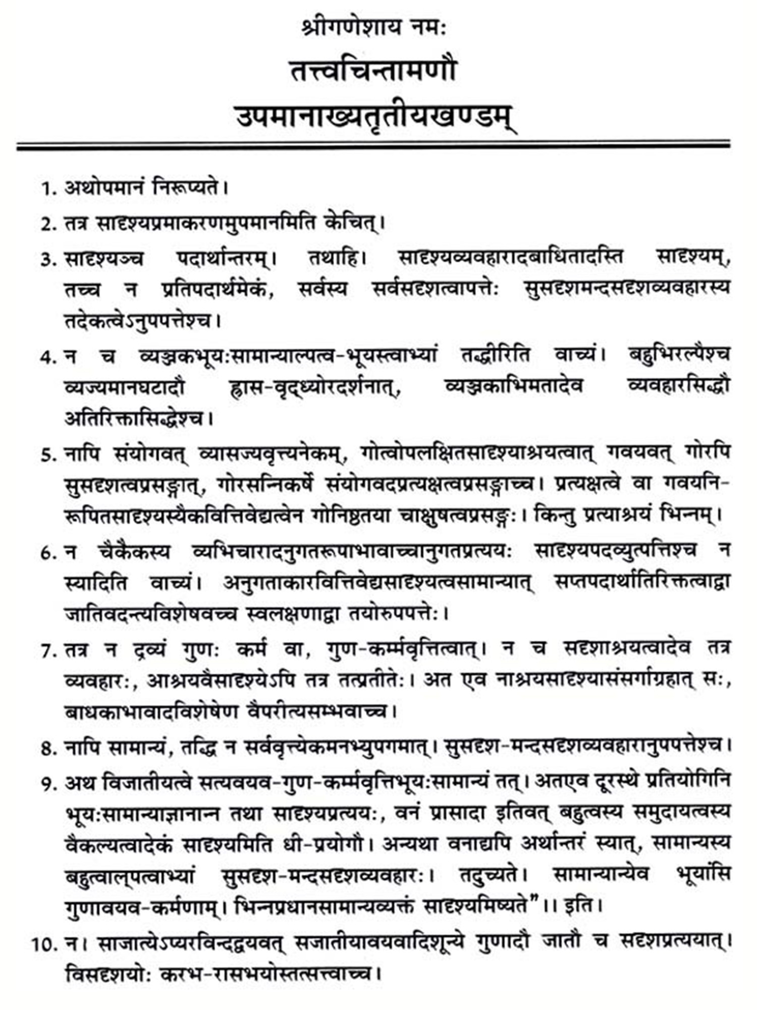 The Methodology adapted for the translation of 'Inference of good' (anumana) and 'Comparison' (upamana) is a standard one. The books of 'Inference of god' (Anumana) and 'Comparison' (upamana) of T.C. are numbered as III.1. and III. ii. respectively in both Sanskrt texts and corresponding English translations. Also, the English translations of all the passages, which are numbered, are followed by explanatory notes for the ellucidation of the technicalities of the passages. Further, the General introduction provides subject matters of both 'Inference of god' and 'Comparison' for introducing the readers with the subject matters of both.