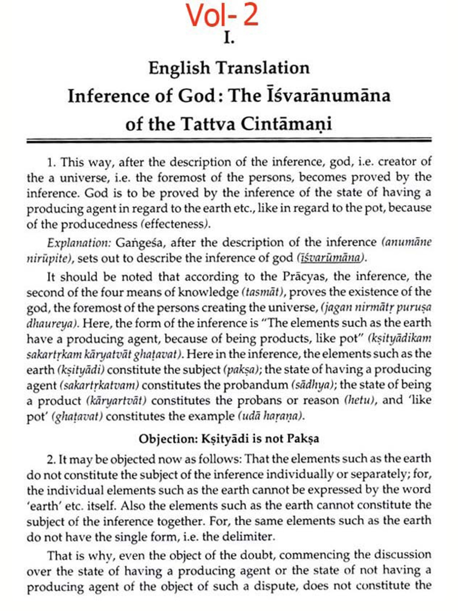 The book 'Inference of god' (isvaranumana) establishes the existence of god by the inference such as "The elements such as the earth (ksityadi) have a producing agent (sakartykam), because of being products or effects (karyatvat)".
