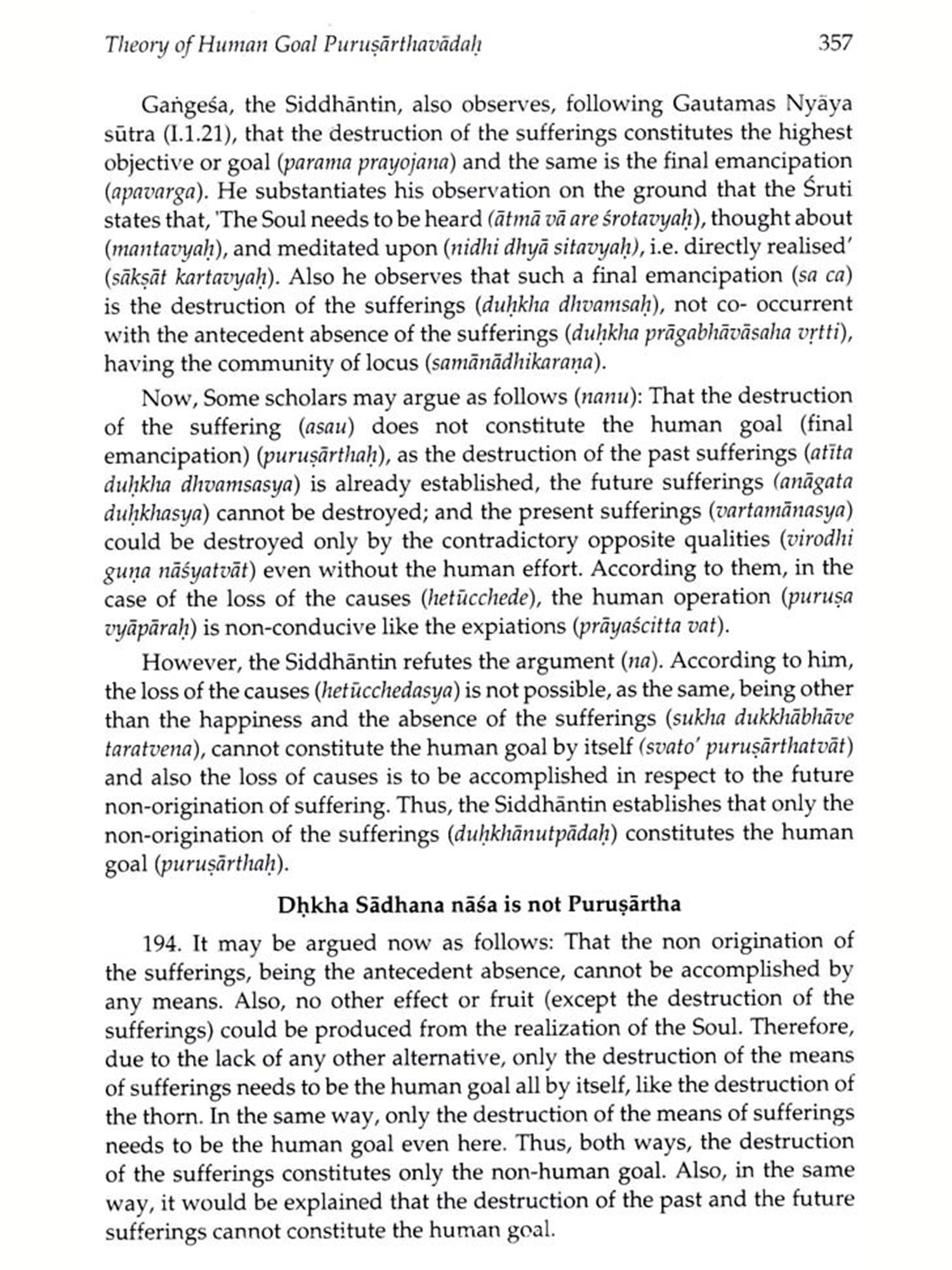 Also, the book "Inference of god" establishes that only the destruction of the sufferings (duhkha dhavamsa) constitutes the final emancipation (moksa) or human goal (purusartha).