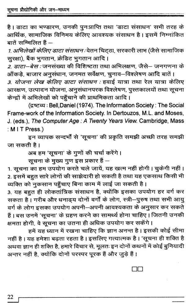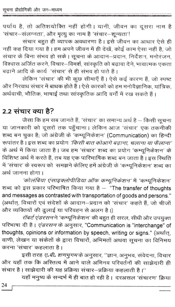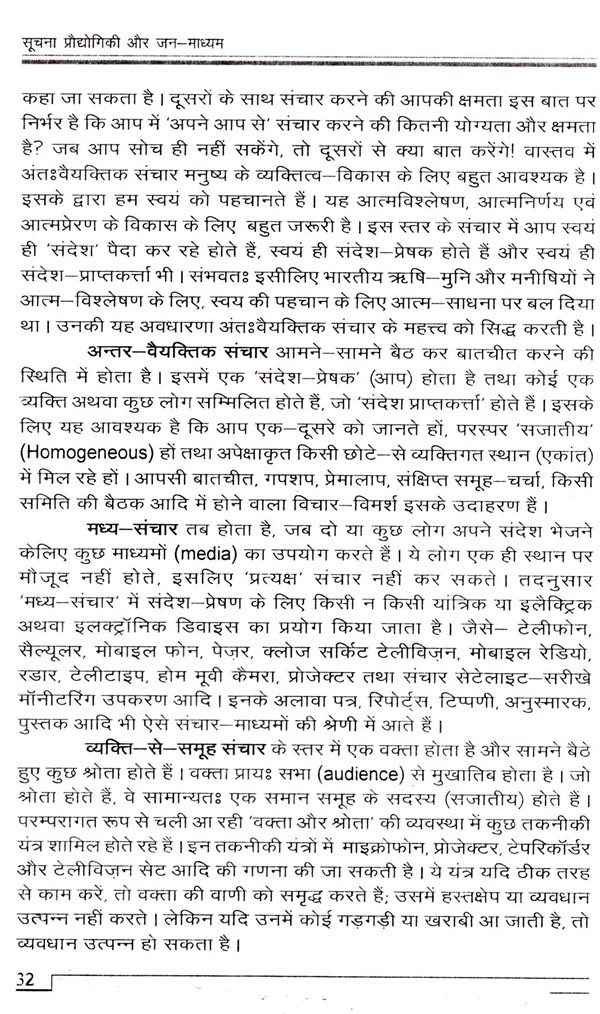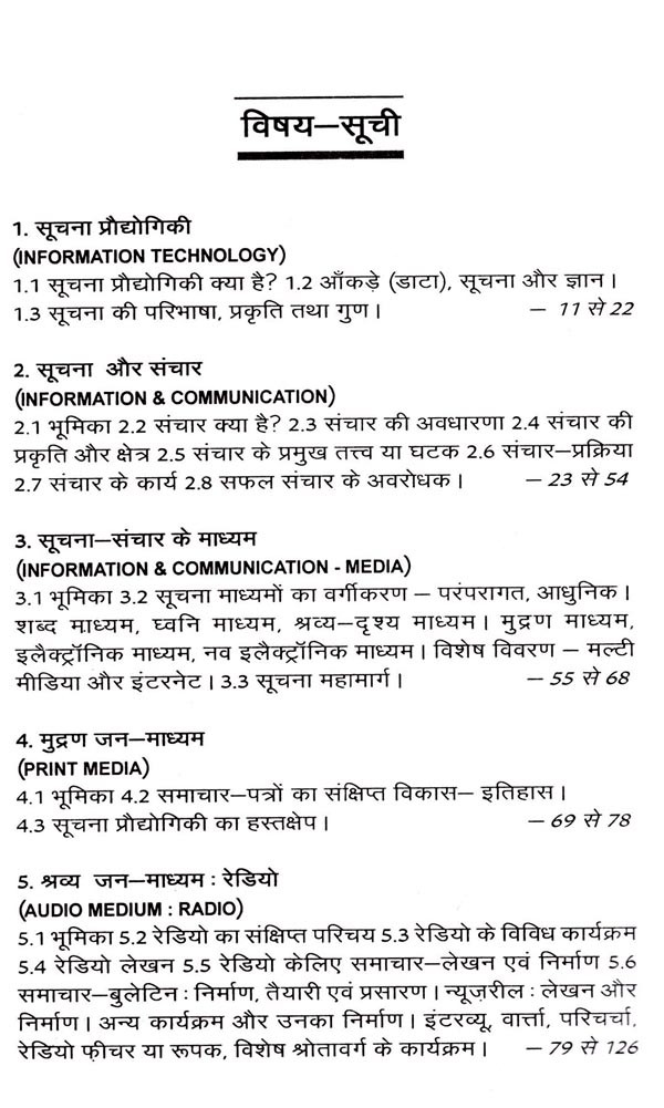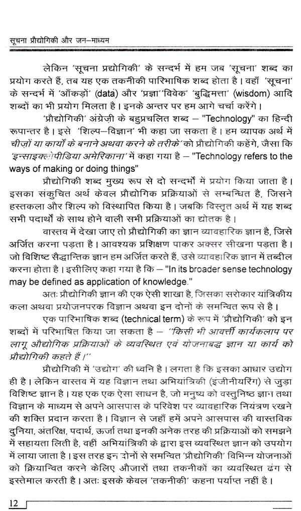सूचना प्रौद्योगिकी आधुनिक युग का सबसे बड़ा वरदान है, जिसे मनुष्य ने अपने परिश्रम और अन्वेषणकारिणी बुद्धि से विकसित किया है। यह ऐसा क्रांतिकारी विज्ञान है, जिसने हमारे जीवन को एक साथ बड़ी तीव्र गति से बदल दिया है। जैसा कि हम सब जानते हैं. 'सूचना प्रौद्योगिकी' एक ऐसा अनुशासन है, जिसमें सूचना का संचार अथवा आदान-प्रदान त्वरित गति से, दूरस्थ समाजों में, विभिन्न तरह के साधनों तथा संसाधनों के माध्यम से सफलतापूर्वक किया जाता है। वास्तव में यह एक शिल्प-विज्ञान है, जिसमें वे सब उपकरण तथा तरीके सम्मिलित हैं, जो सूचना के प्रबंधन से संबंध रखते हैं। 'सूचना' इस शिल्प-विज्ञान का प्रथम लक्ष्य है। 'सूचना' किसी भी समाज की प्रगतिगामी गतिविधियों का मुख्य आधार है। हमारी सारी आर्थिक तथा सामाजिक प्रगति सूचना के एक स्थान से दूसरे स्थान तक भेजने पर निर्भर है। सूचना प्रौद्योगिकी क्योंकि सूचना का विज्ञान और शिल्प है, इसलिए इसका सर्वाधिक निकट संबंध जनसंचार अथवा विशेष रूप से कहें, तो पत्रकारिता से है। इस पुस्तक में 'सूचना प्रौद्योगिकी और इसके केन्द्रीय तत्त्व- 'सूचना' का स्वरूप समझाते हुए, संचार और संचार के विविध माध्यमों की कार्य-प्रणाली को सामने रखा गया है। आधुनिक जन-माध्यमों, विशेष रूप से प्रिंट मीडिया, रेडियो तथा टेलीविजन से संबंधित सामग्री का विवेचन है। इस पुस्तक में विश्व की नई सूचना-संचार व्यवस्था की जानकारी का भी समावेश है। जो आज के समय की सबसे बड़ी चुनौती और आवश्यकता बनकर सामने आ रही है। यह पुस्तक सूचना प्रौद्योगिकी तथा मास मीडिया विषय के अध्येताओं के लिए अत्यंत उपयोगी तथा एक अनिवार्य पुस्तक है।