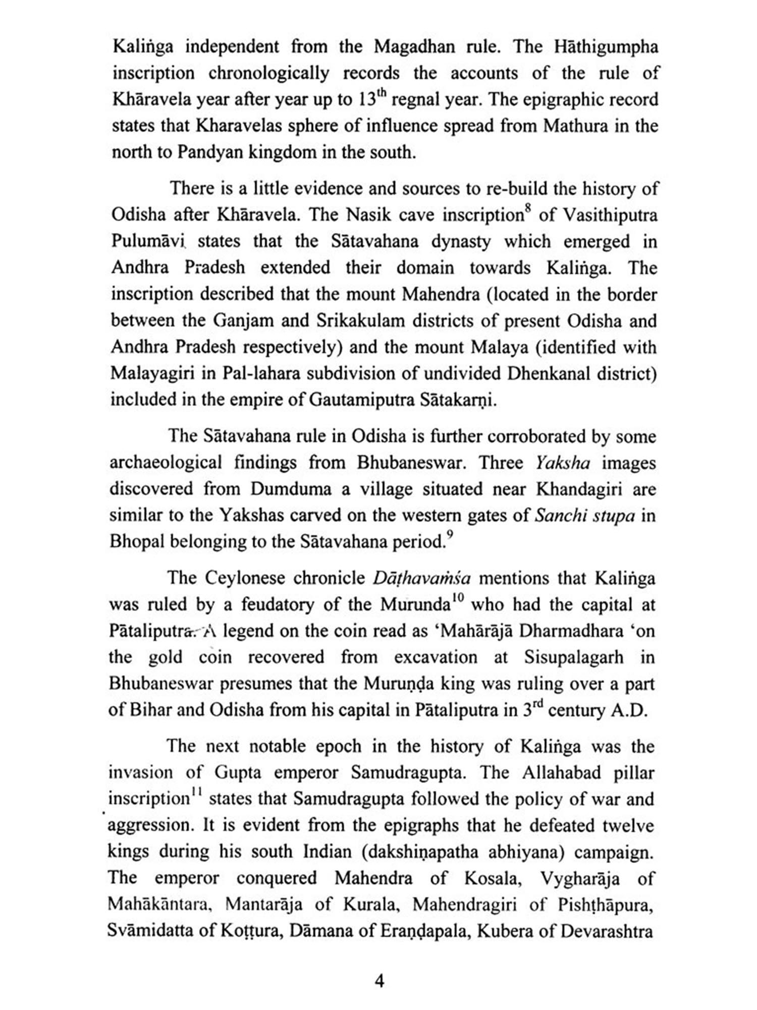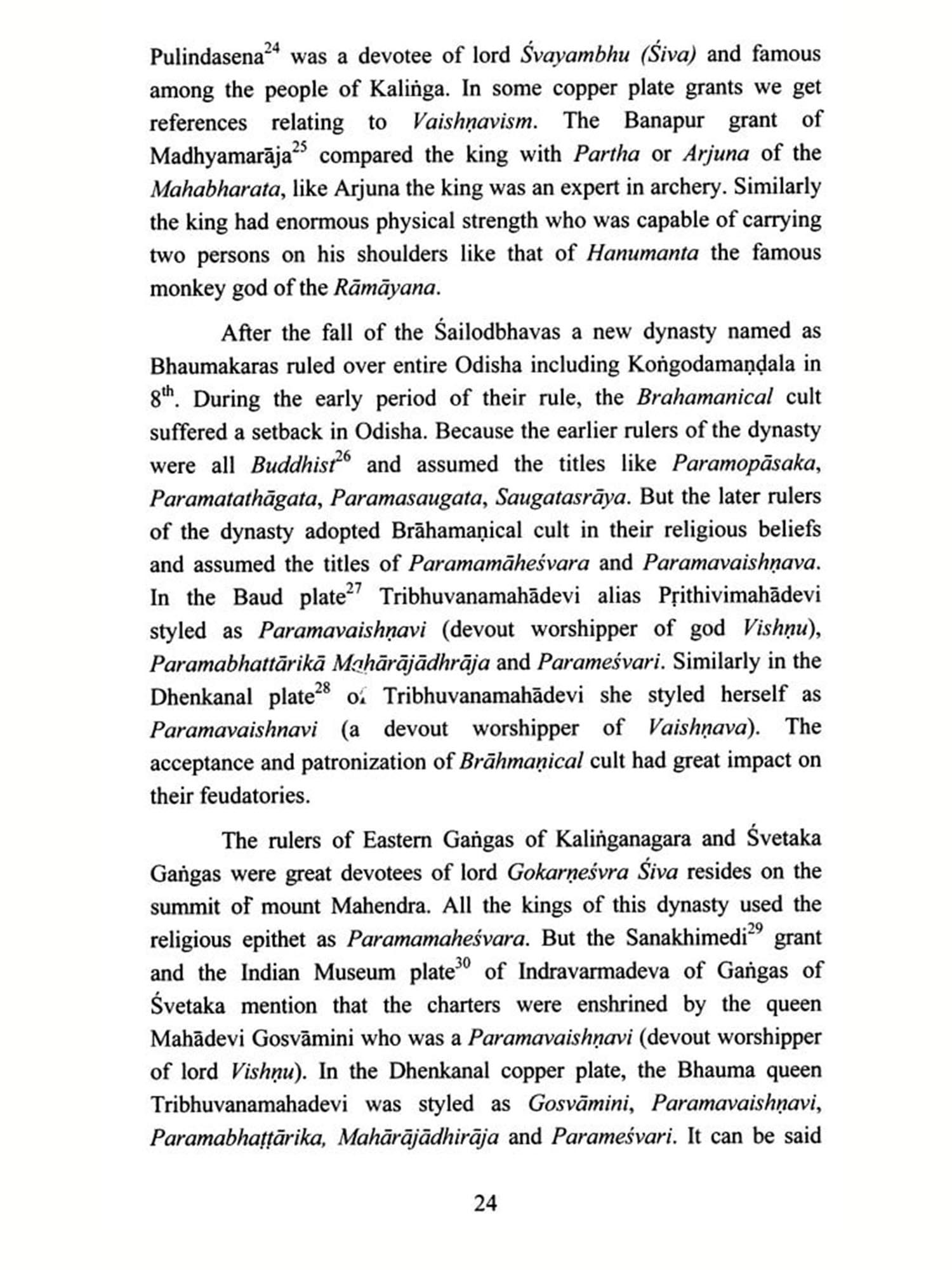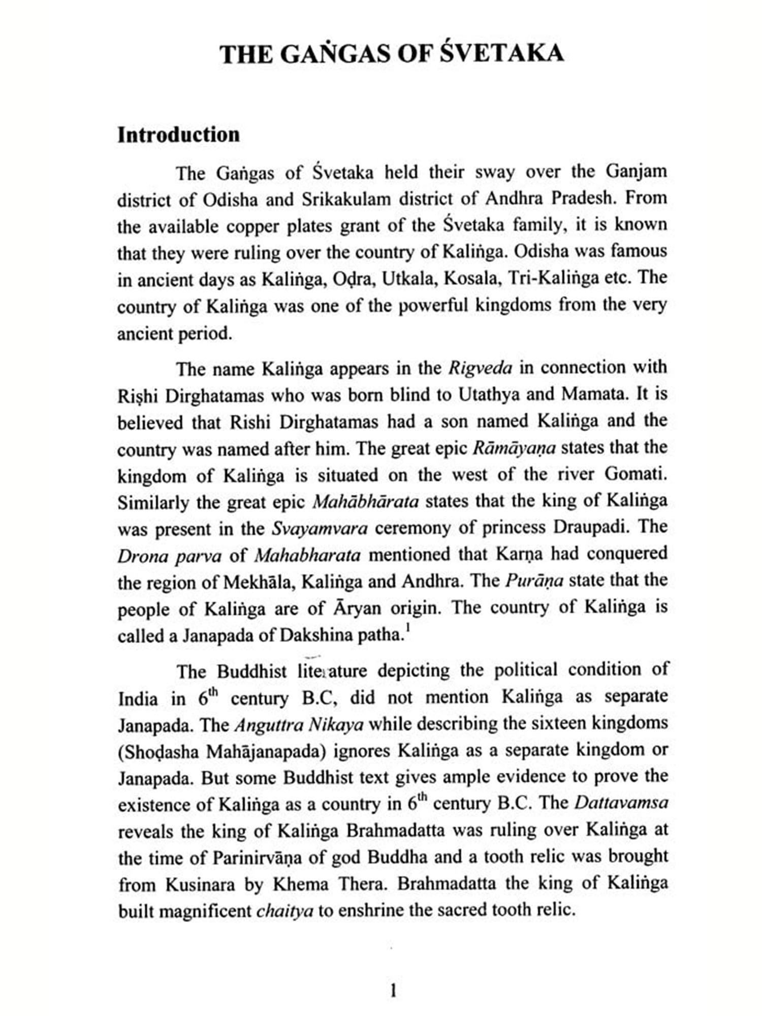 The Gangas of Svetaka held their sway over the Chikiti area of the Ganjam district. The Gangas of Śvetaka dynasty was one of the collateral branches of the Eastern Gangas of Kalinganagara. The history of the Gangas of Śvetaka is known mainly from the copper plate charters. From the available copper plates we presumed that they ruled mainly in the Chikiti area of Ganjam district and some portion of Srikakulam district of Andhra Pradesh between 8th to 10th centuries A.D. The copper plate grants issued by the rulers of the dynasty and other contemporary dynasties formed the principal source of information for the re construction of the history of Gangas of Śvetaka. So far eighteen numbers of copper plate charters have been discovered. These records are the valuable sources so far as the political, economic and socio-religious history of the dynasty is concerned. The internal as well as external evidences furnished by the copper plates are the major source materials to be utilized in writings this book. A good number of stray articles have been published in different research journals and books, but these are not sufficient for a comprehensive study of this royal dynasty. This is an attempt has been made for providing an exhaustive account of the political and cultural history of the said dynasty.