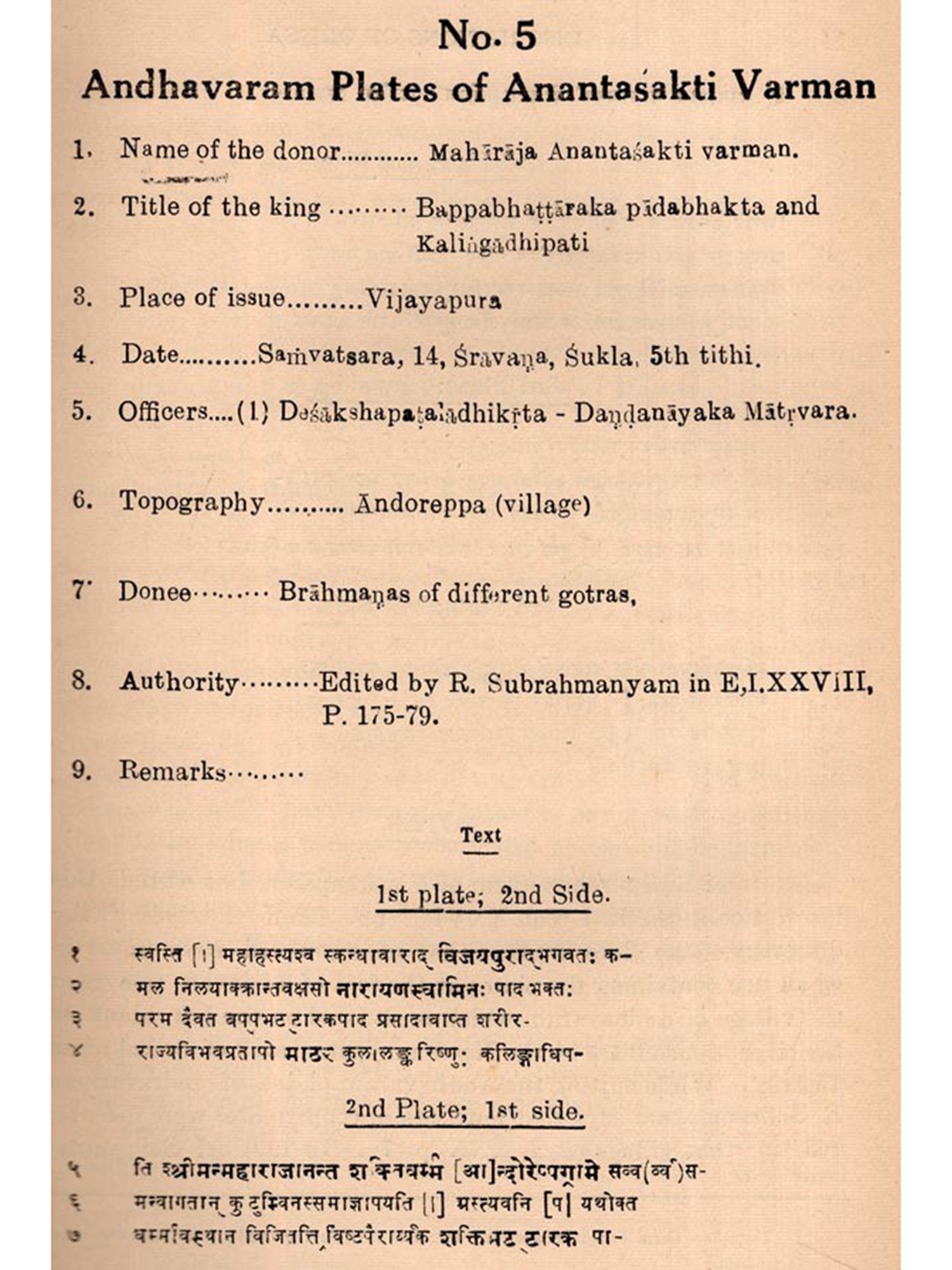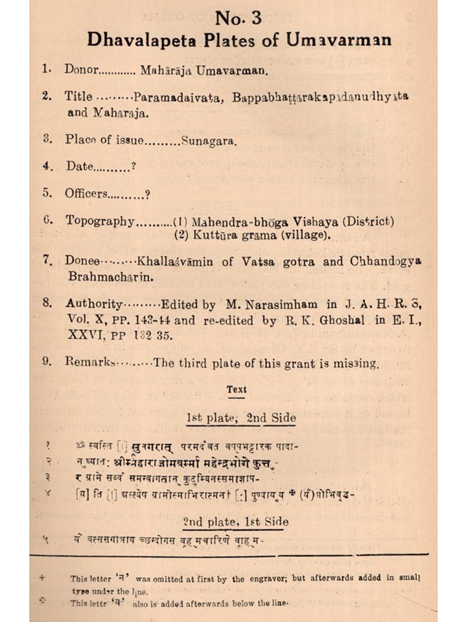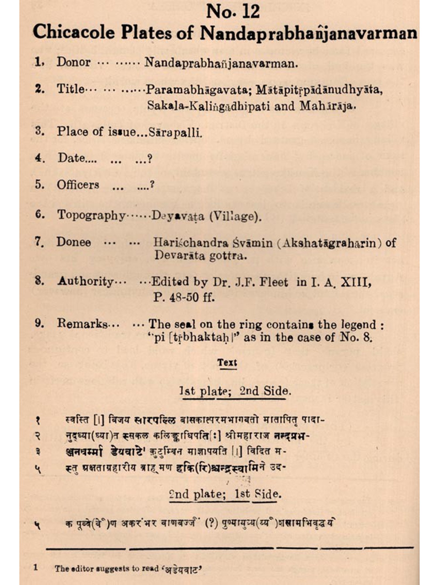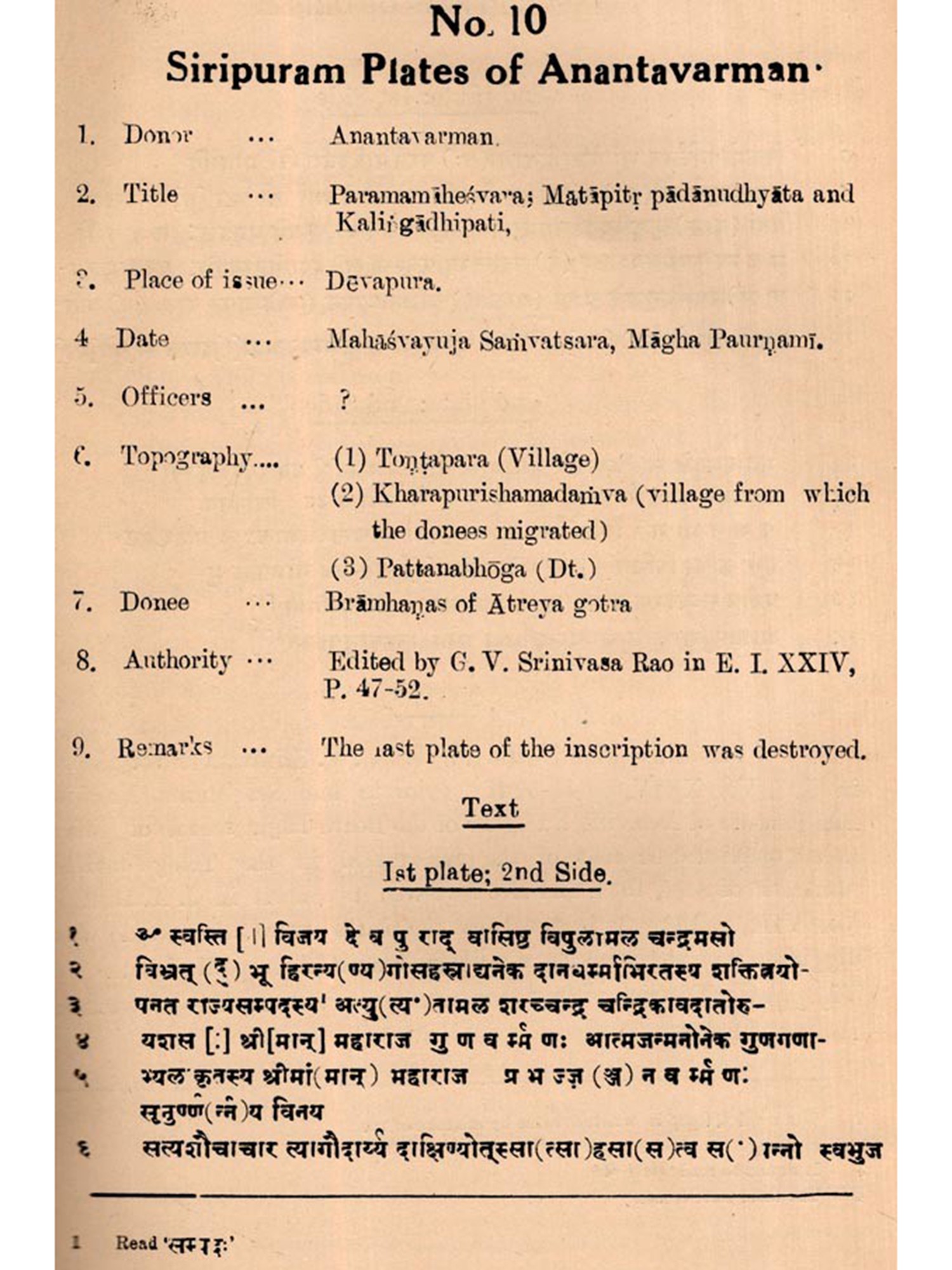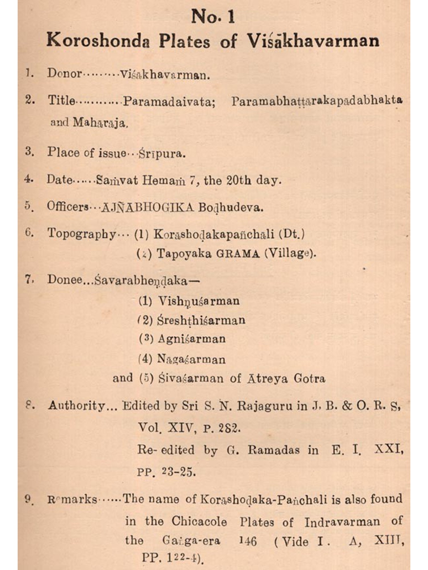 A large number of inscriptions, beginning from the time of Aloka, has already been discovered from Orisen and the neighbouring tracts relating to her history. Some of them have been published in different research journals and some are still to be edited. They contain valuable materials for the compilation of history on scientific basis. It is also found that some of these inscriptions have been edited and re-edited by different scholars for which reason they need to be published showing different readings for comparative studies,