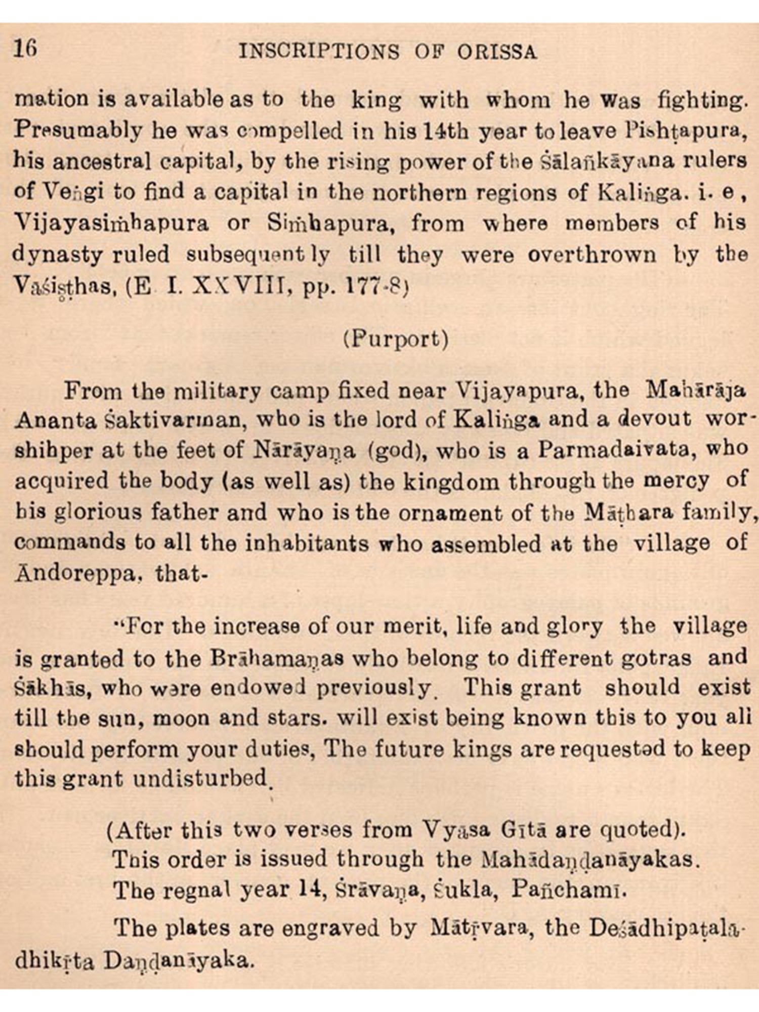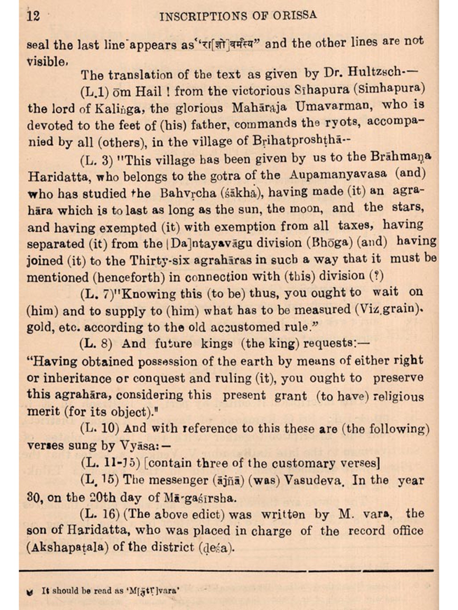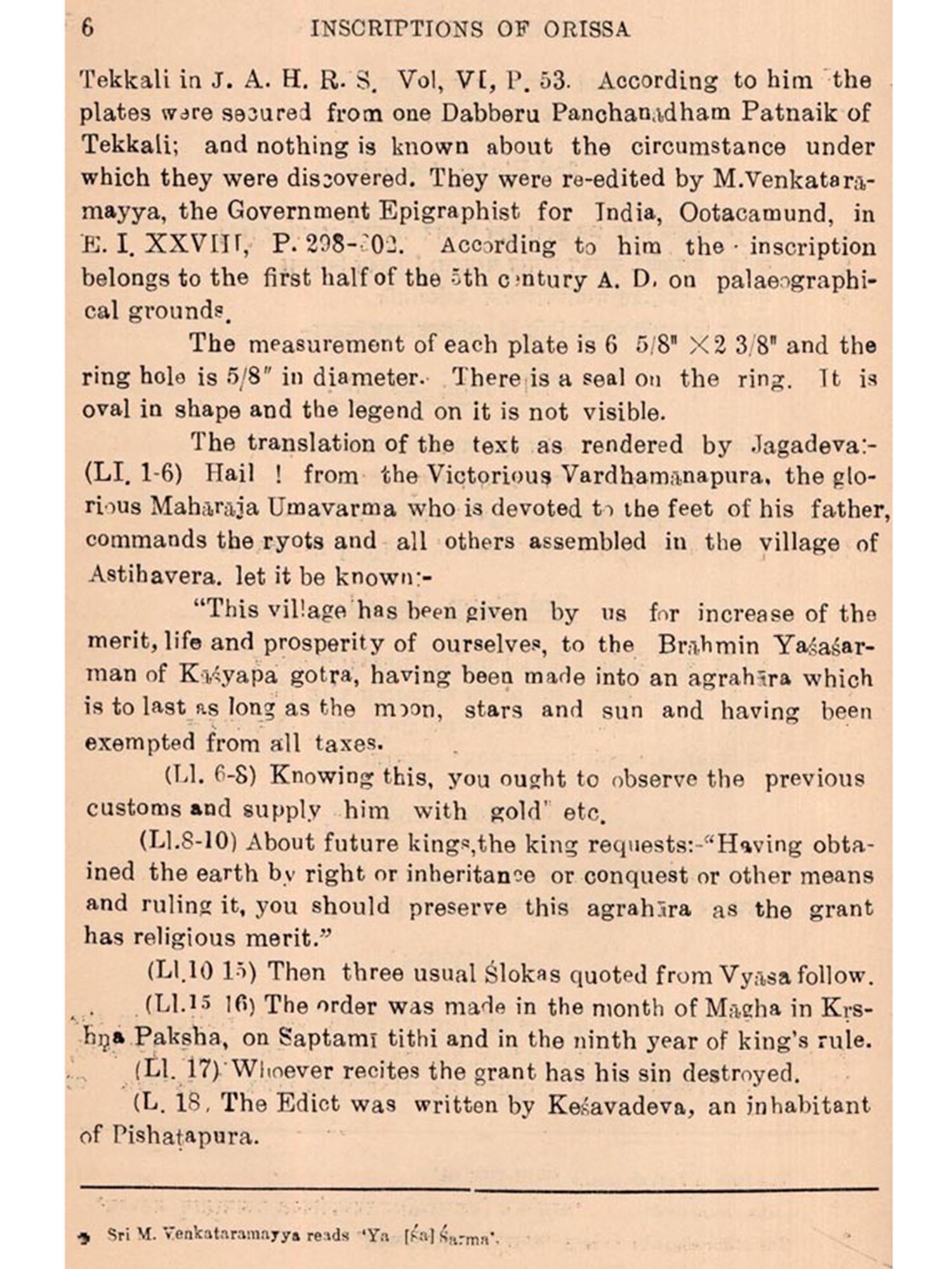 In 1950, when a Research Section in the Orisen State Museum was created, I started to compile this work as a part of my scheme for the publication of the available inscriptions of Orissa in four volumes consisting of ten parts on the whole. I placed my scheme before the Advisory Council for Museum, Archives and Archaeology of Orissa for approval. I owe my thanks to the President, Sri L. Panigrahi, the Minister for Education, Home and Law to the Government of Orissa, and to the Members of the said Council for accepting this proposal.