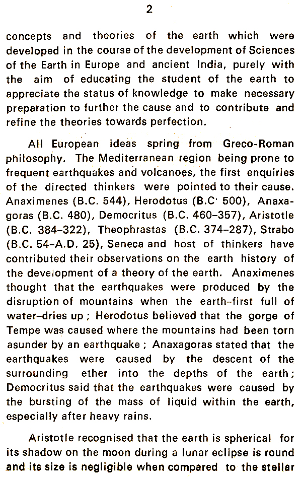 As a student of the Earth Sciences for over three decades, the author having gone through considerable literature in Earth Science both in English and Sanskrit languages has realised that there is scope for develop-ment of a sound Theory of the Earth by integrating suitably the materials of many theories of the earth existing in the literatures of the orient and the occident, coupled with modern observations in celestial dynamics. The need for a sound Theory of the Earth cannot be over emphasised as for its application in predicting from daily weather to occurrences of earthquakes and volcanoes. The inadequacy of such a theory is the cause of our present erroneous observations and the need for improving over the earlier theories is very much felt. Towards this end the author has made attempt to gather information on various theories of the earth developed in the western schools of thought and also in the eastern schools of thought, especially from the Vedic school. The students of the earth from Vedic times to the times of Brihat Samhita of Varaha-mihira (5th Century A.D.), have made many observations in developing a theory of the earth based on which the various local almanacs in India predict the rains, etc., for each year in advance, to this day. The earth science disciplines of modern science as developed in the western schools have systematised observations but appear to lack co-ordination amongst meteorology, seismology, astronomy, geology, econo-mics, politics and sociology as a result the benefit of advancement due to research in one field is not avail-able for the sister disciplines. The untold sufferings of humanity due to natural calamities can be reasonably overcome if only a co-ordinated interpretation is made of the disciplines stated above by giving notice sufficiently early as to the occurrence of volcanoes, earthquakes, storms, floods, etc.