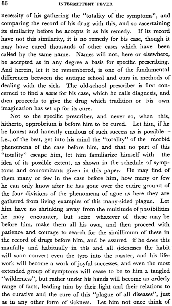 I have cured about fifty cases of intermittent fever in succession upon the first prescription of a single remedy. I think this a sufficient evidence that the law of similars and the totality of the symptoms—-which is the principle upon which I have practiced—is the correct one. I think the reader may be assured that there is no more difficulty in treating intermittent fever than in treating any other disease. By strictly following this principle any one can cure ague.