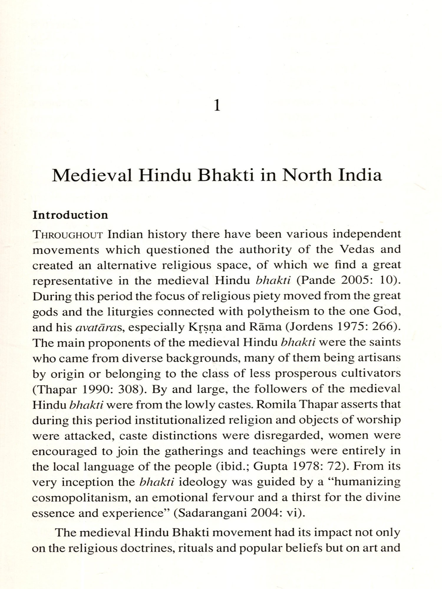 During the medieval period (thirteenth to seventeenth century CE) Hinduism underwent a transformation so great that it has been compared to that of Reformation in Western Christianity. A new attitude to God, emotional, passionate bhakti, replaced the old approaches of sacrificial rite and non-dual meditation. Pushing aside old gods, old attitudes, old cultural forms, the new movement also drove the sacred language Sanskrit back into the memories of the priests. In the first centuries of their growth all modern Indian vernacular literatures were moulded by this religious movement, and thus were essentially mass literatures. The socio-ritualistic order dominated by the brahmaņas were not overthrown, but the brahmanas lost much of their spiritual authority, which passed to the saints and the gurus, whose songs and biographies soon became a scripture. The new devotional religion, without destroying the Hindu social framework, fostered ideas of brotherhood/sisterhood and equality before the loving Lord. Its saints drawn from all levels of society proclaimed that, in bhakti, caste has no meaning (Jordens 1975: 266). This was the beginning of medieval Hindu bhakti in the Indian religious tradition. In the context of north India, all Sikhs as well as almost all Hindus may be called followers of Bhakti religion, since their dominant mode of worship is one of devotion (bhakti) towards a divine being (Lorenzen 1996: 1).